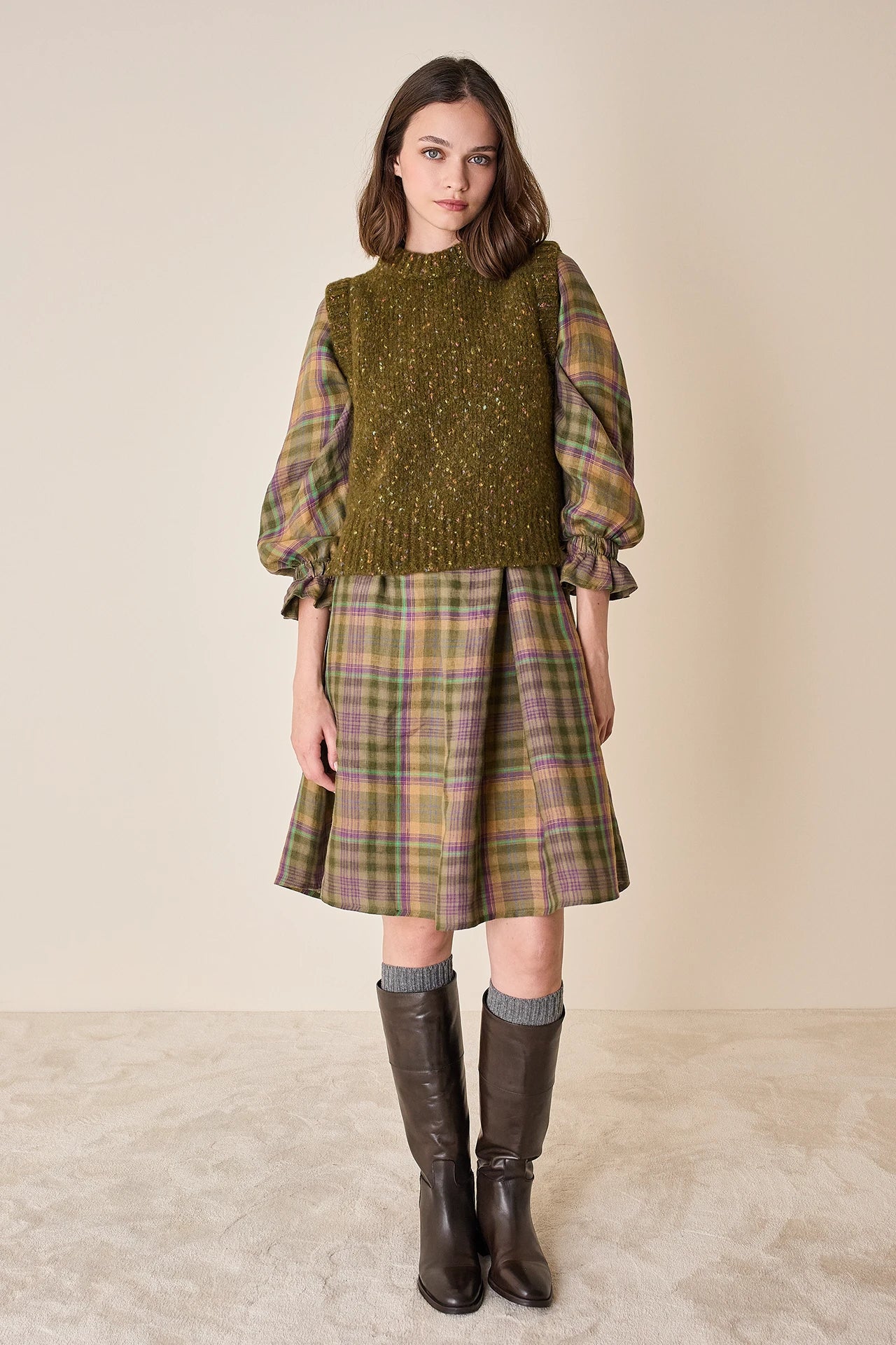 Hundreds of colorful confetti are trapped in the yarn of this vest. This effect is the result of bottonatura, a special technique that incorporates tiny knots (called “buttons”) into the yarn, giving it a deliberately irregular look. We used it to create a crew-neck vest, available in green or grey, ready to add a layer of color (and warmth) to any outfit.