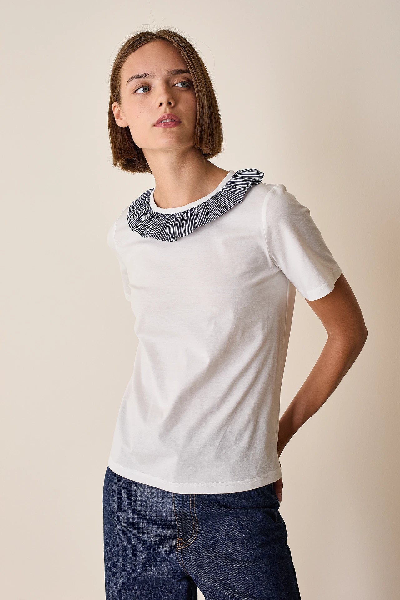 A classic cotton T-shirt – with our signature twist: a romantic ruffled collar we can’t wait to layer under cardigans and crewneck sweaters.