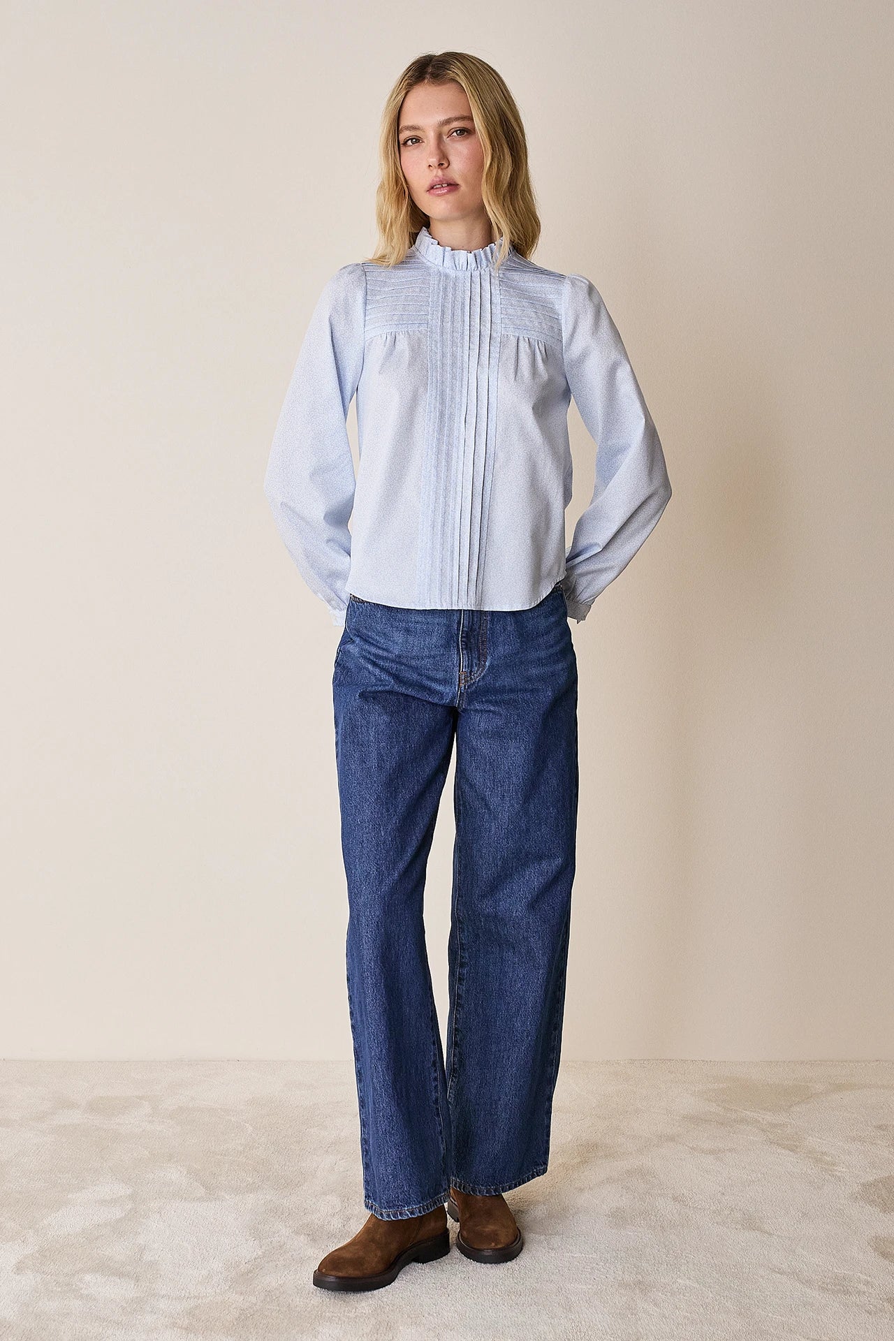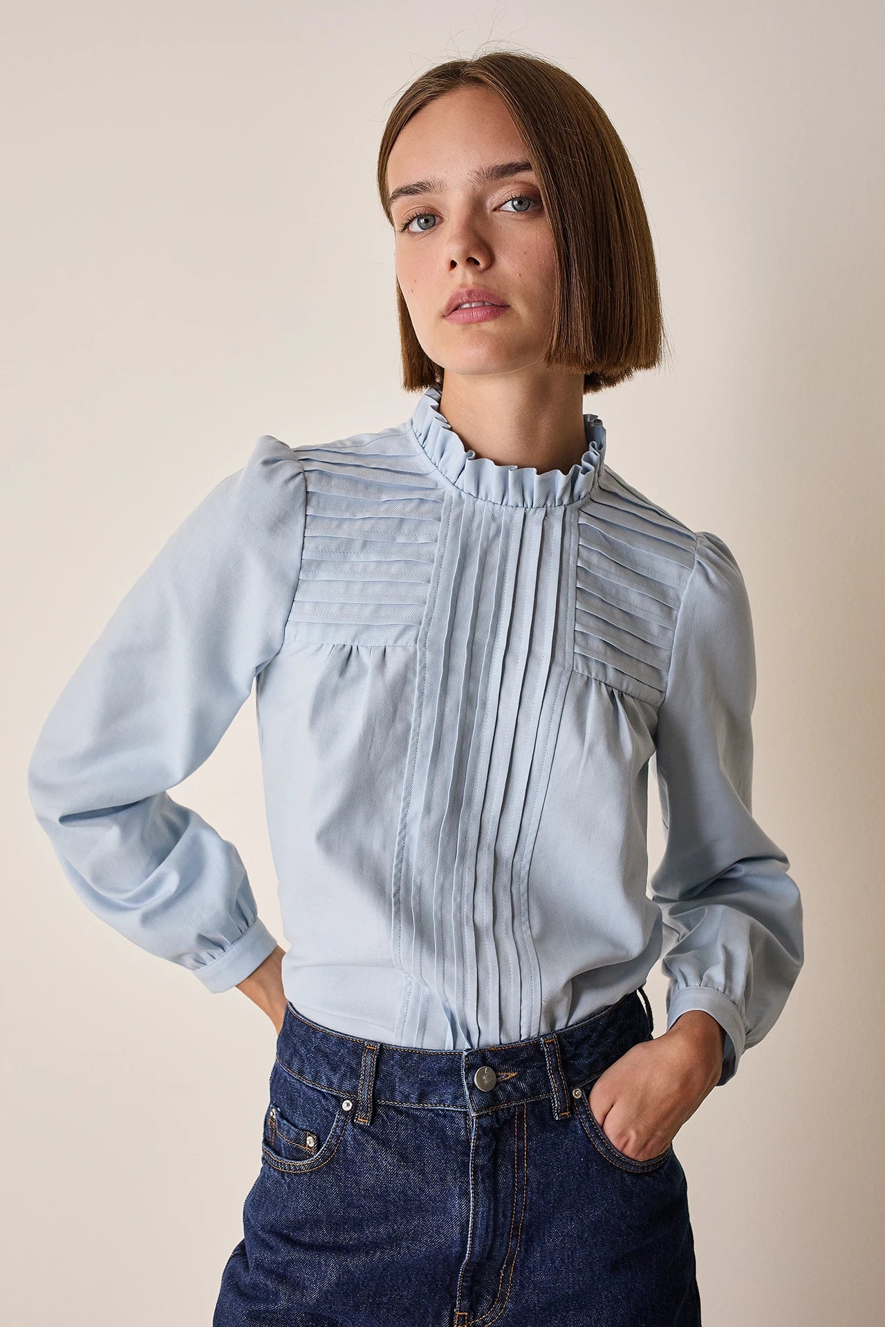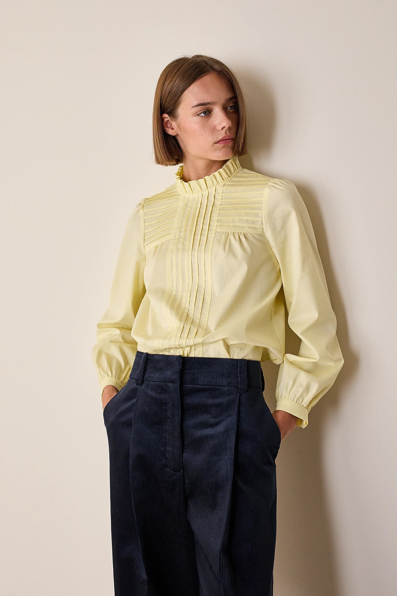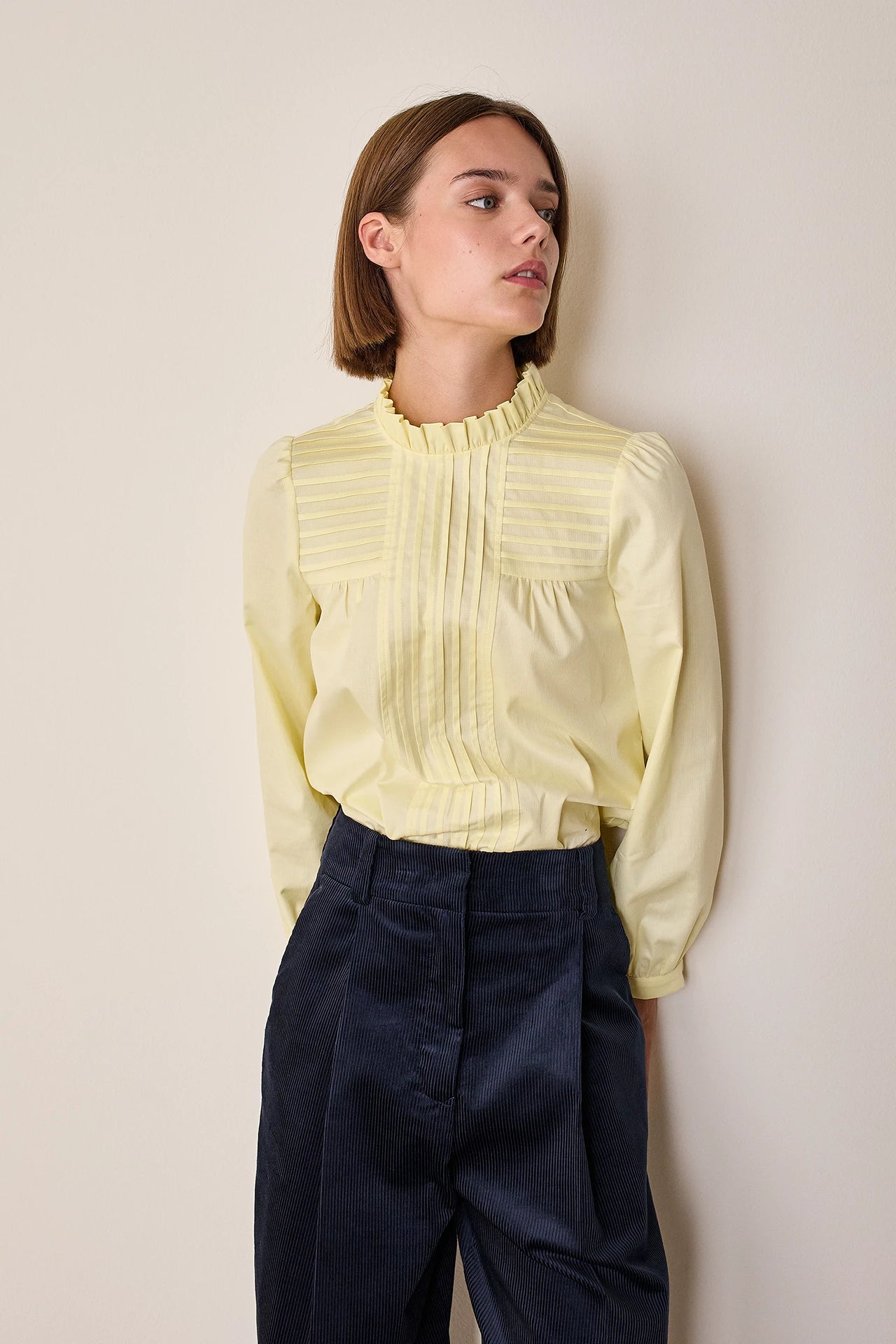 Romantic and easy to wear, this cotton top features delicate pleats and a ruffled collar. Perfect for office looks or everyday outfits, it’s available in yellow or blue.