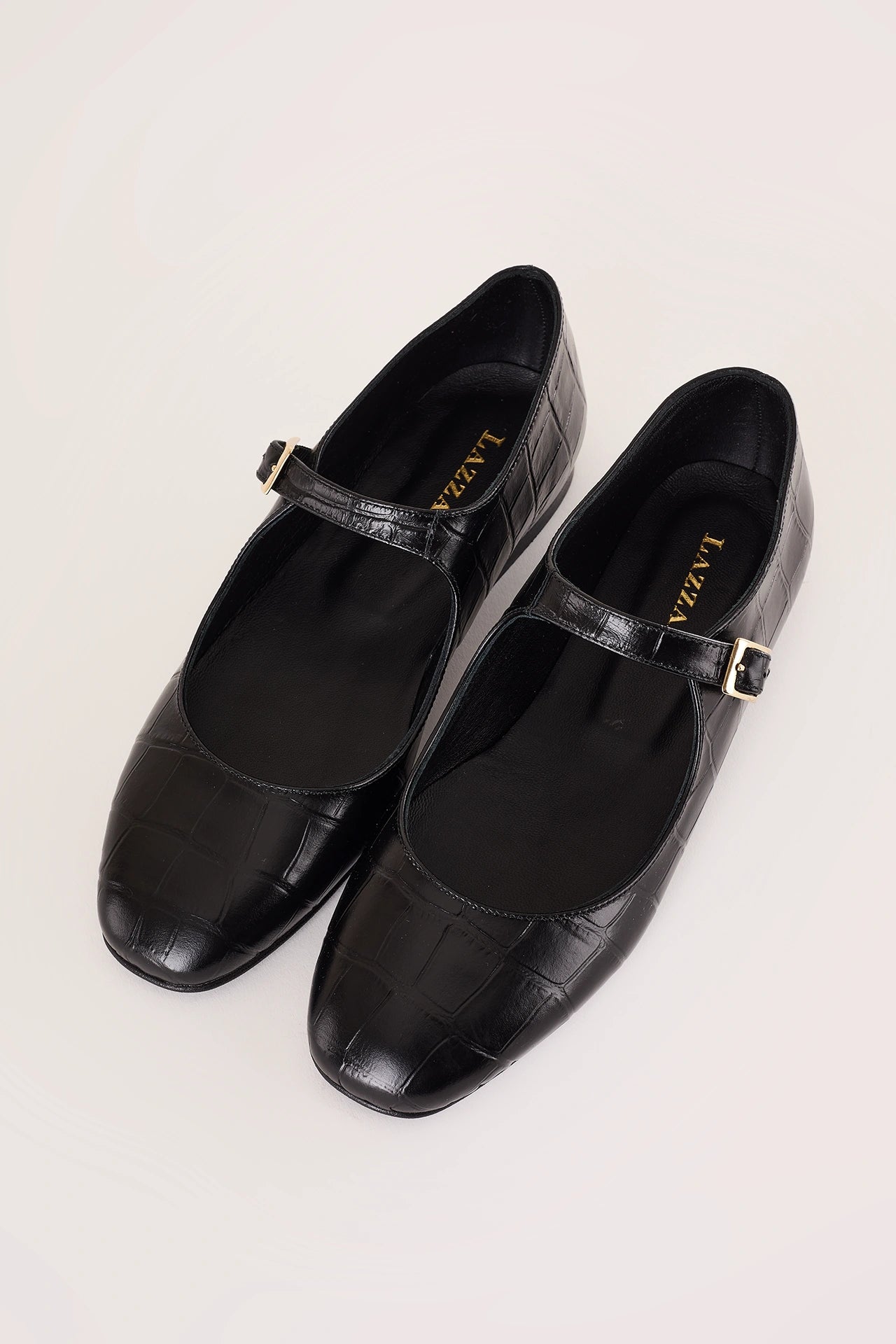 Mary Janes with a practical rubber sole, ideal even on cooler days. Versatile yet distinctive with their croc-embossed leather, they pair beautifully with dresses and skirts as well as jeans. Available in black croc-embossed leather.