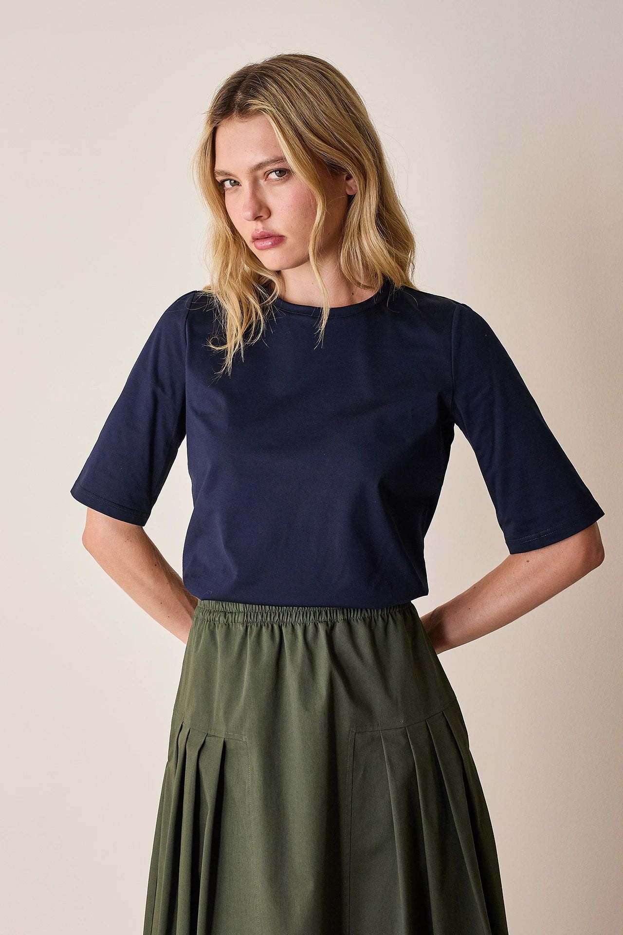 For this cotton jersey t-shirt, we chose refined half sleeves – a more elegant option than classic short sleeves. A simple detail that makes it perfect not only for everyday wear, but also for the office. Available in midnight blue or chestnut brown.