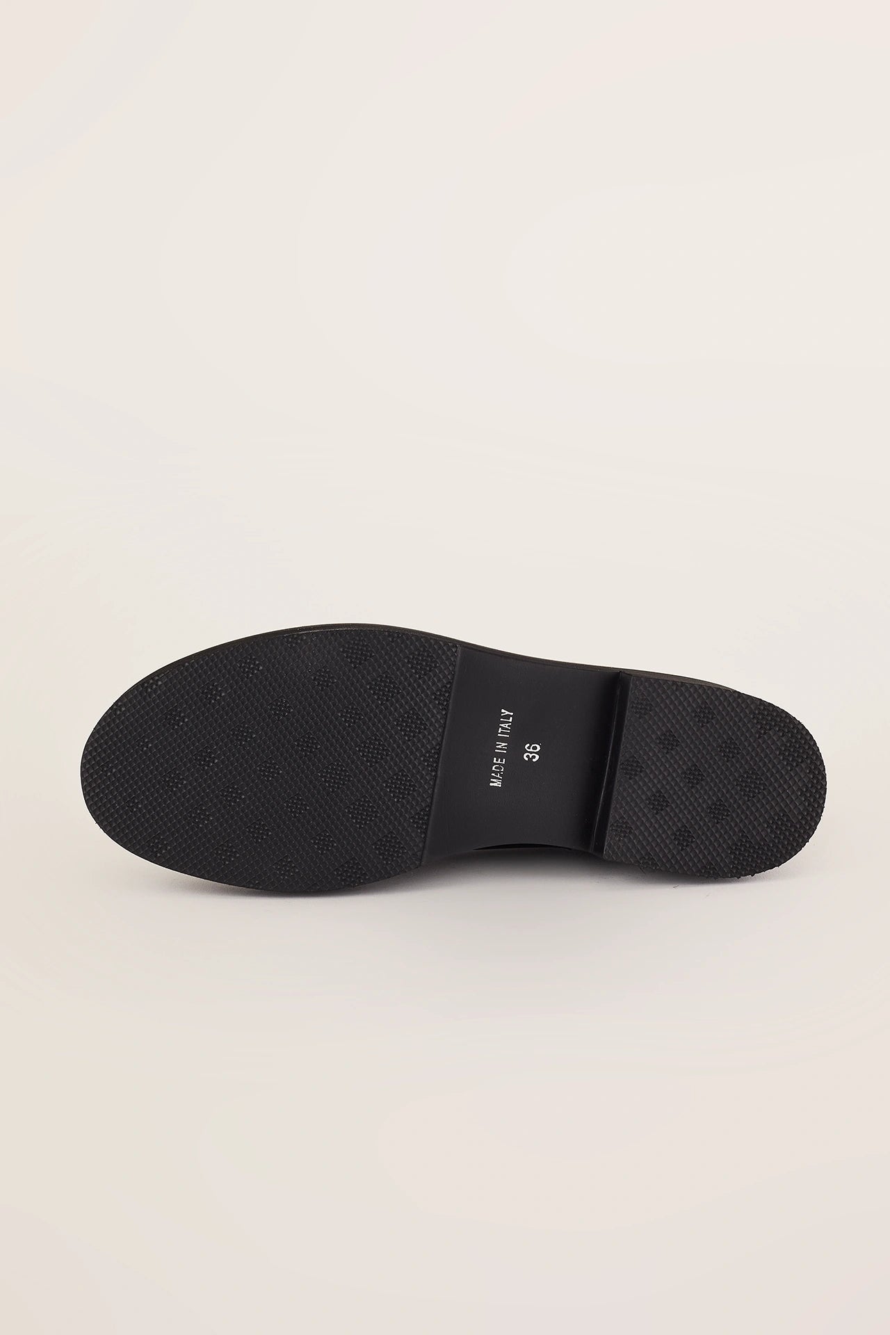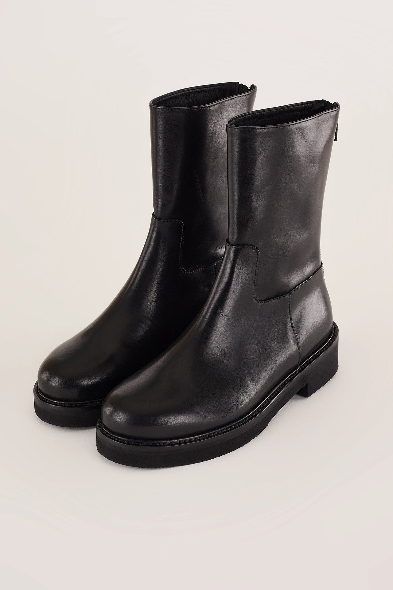 These leather boots feature a high rubber sole – a detail that makes them more casual while providing extra insulation – and a convenient back zipper for easy and quick wear. Available in black.