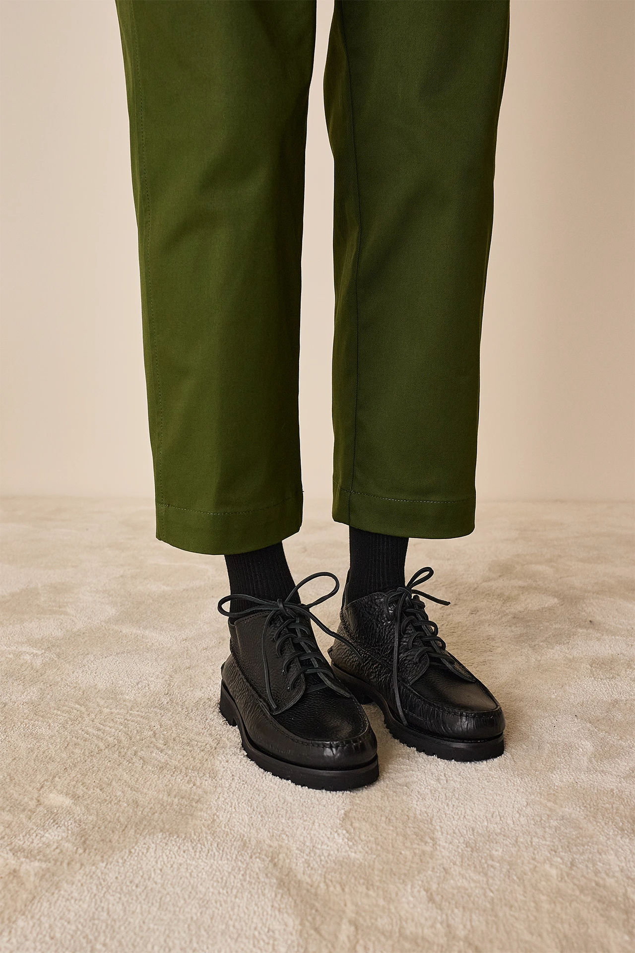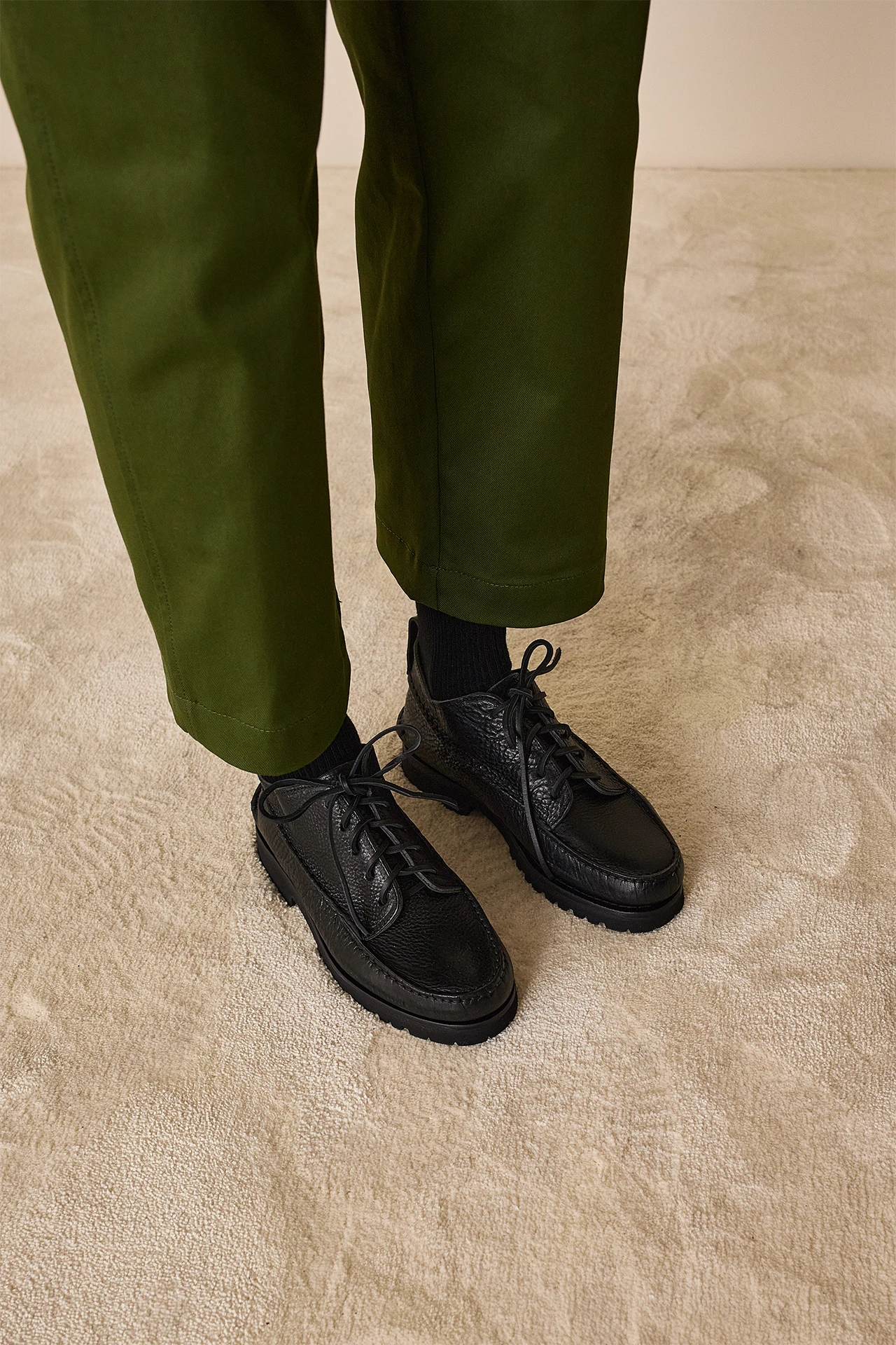 These lace-ups are crafted in Tuscany, Italy, in a factory renowned for its expertise in creating high-quality loafers. Inspired by desert boots, they incorporate classic loafer details like moc stitching and the iconic beefroll. The extra touch? The sole is made of Vibram for maximum grip, comfort, and cushioning. Available in black or brown leather.