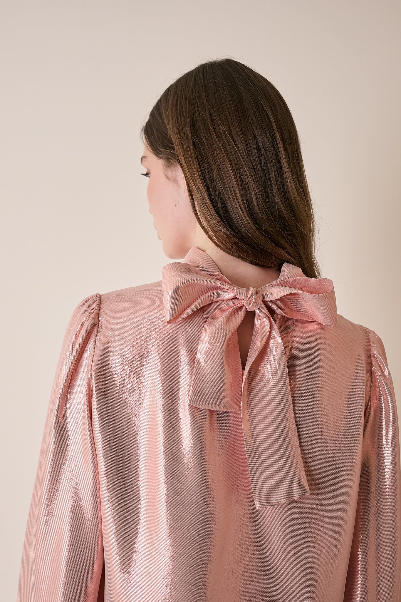 For this top, we chose a scarf-style neckline you can tie into a bow. Crafted from fluid, shimmering lurex, it’s perfect for the holidays as well as more elegant occasions. Available in pink.