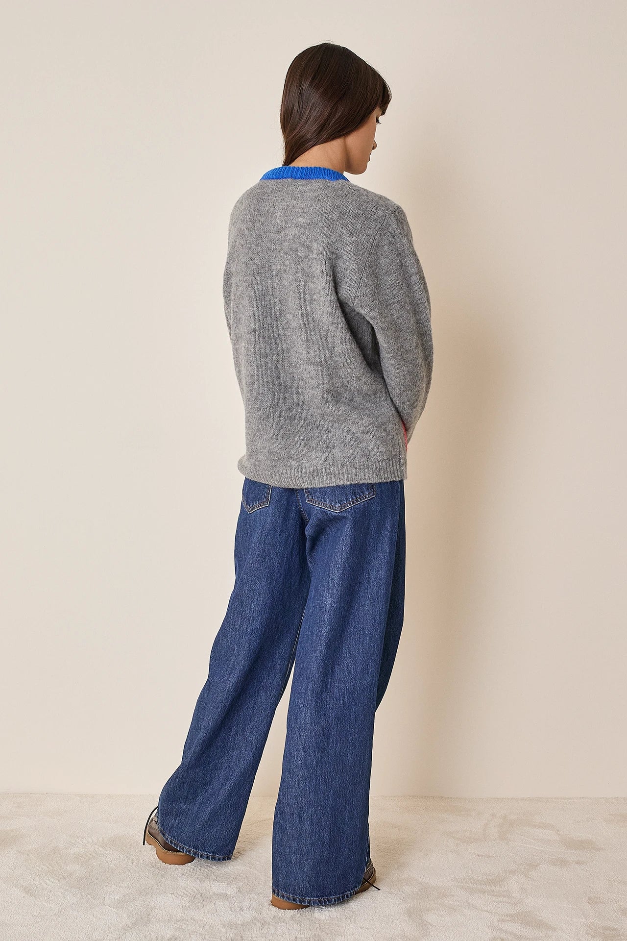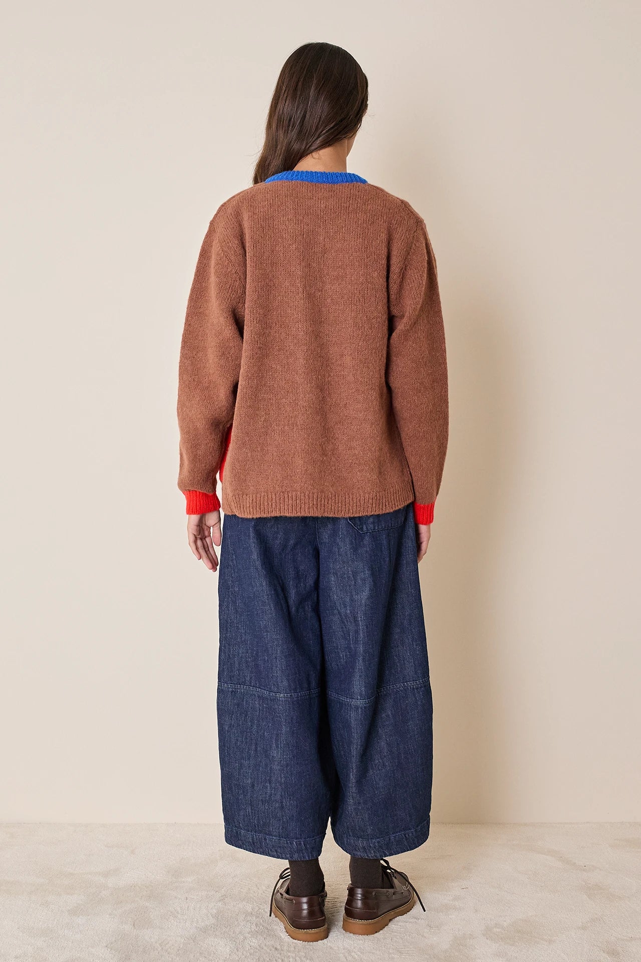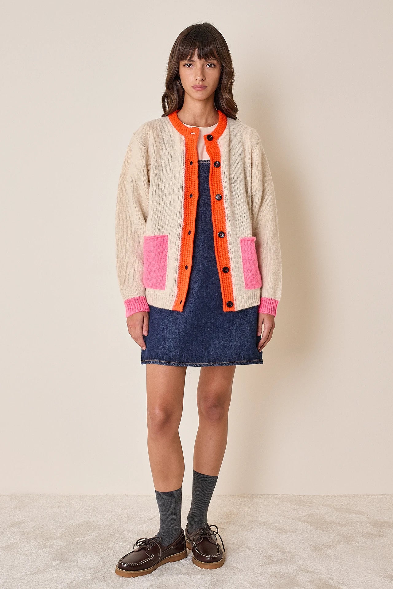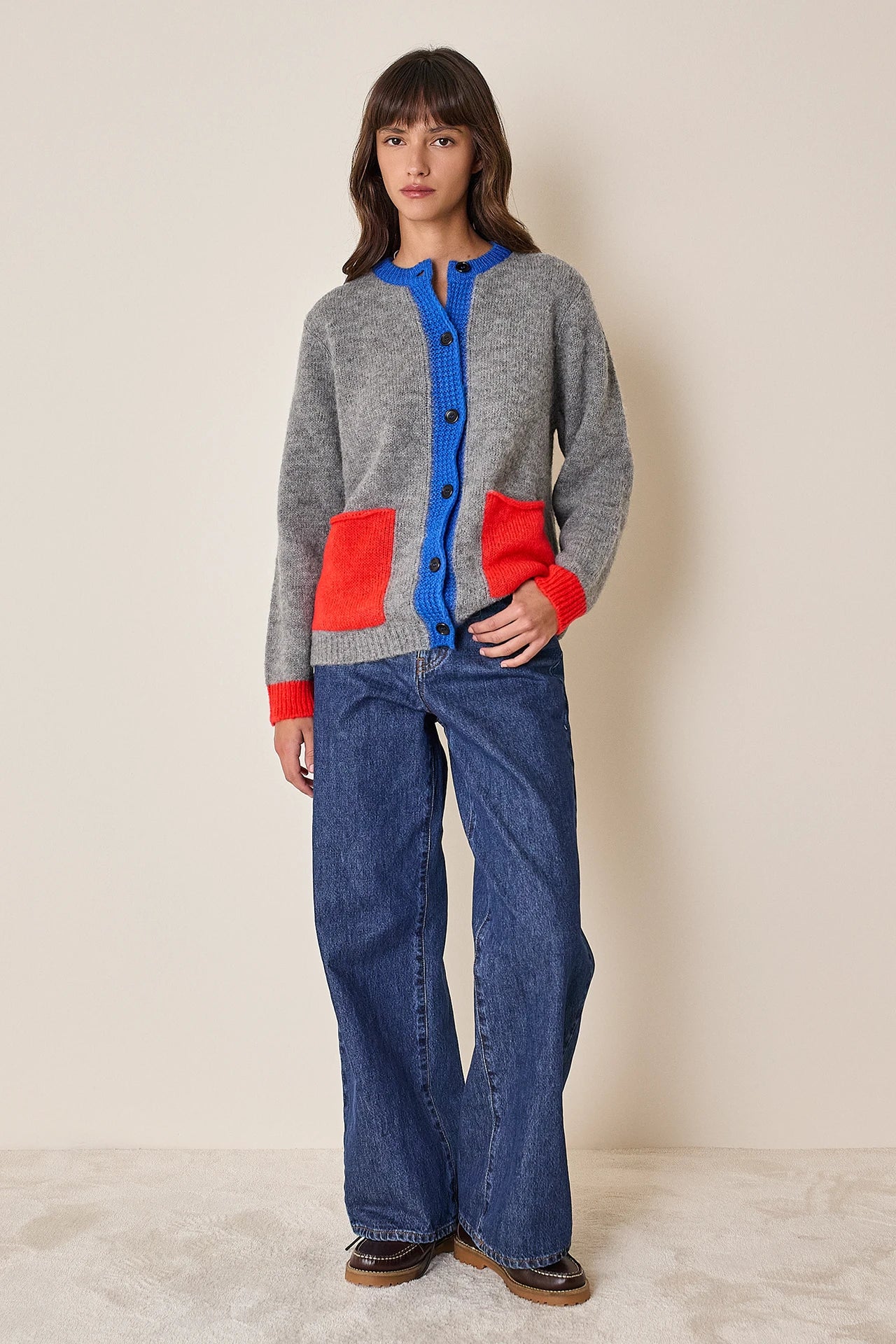 This alpaca cardigan is designed to brighten even the dullest days. Featuring contrasting colors on the pockets and button placket, it’s available in cream or chocolate.