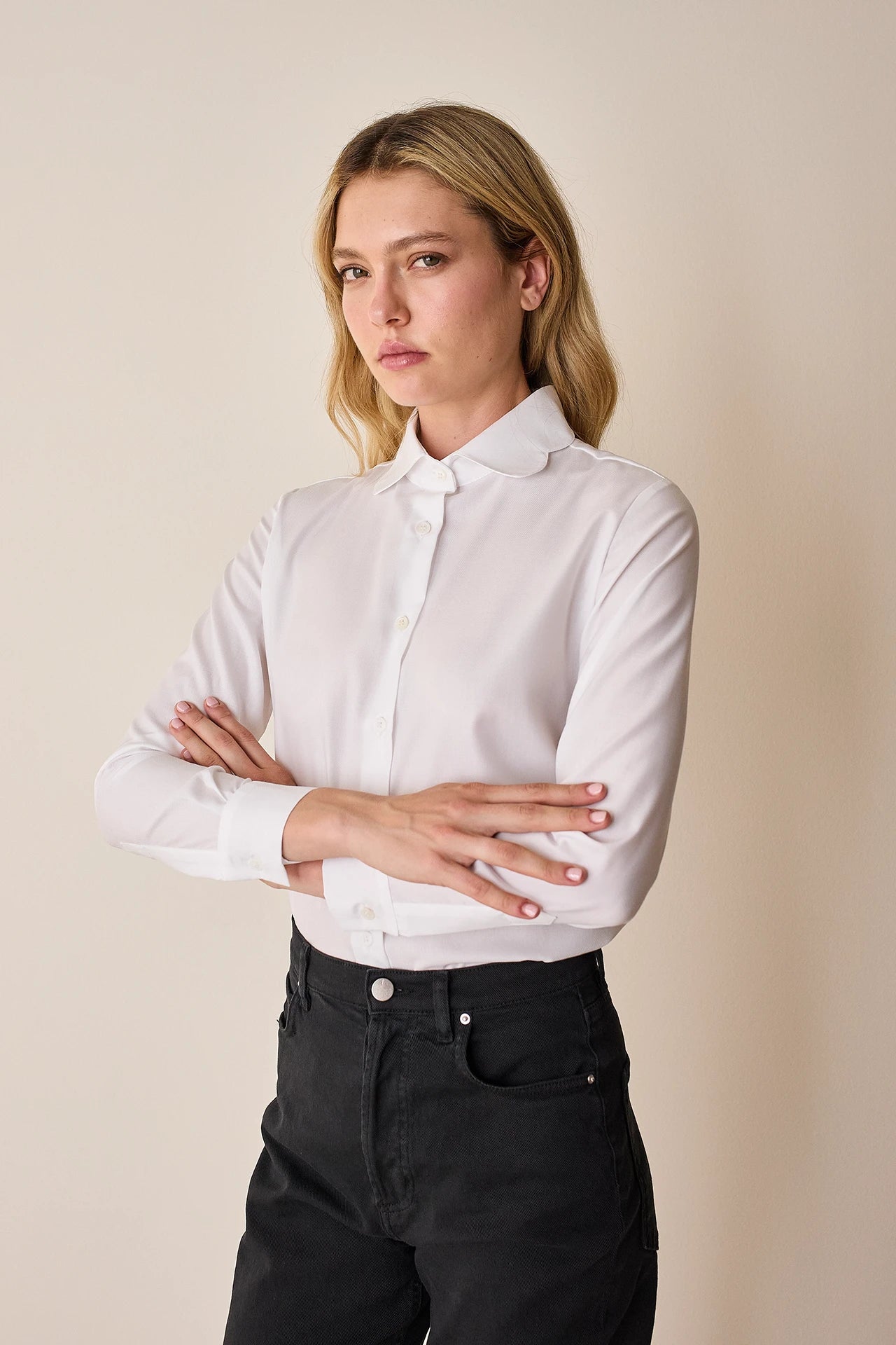 This classic-cut shirt is made from Oxford cotton and finished with a romantic petal collar – perfect for layering under crewneck sweaters or cardigans. Available in white or light blue, it features a regular fit for effortless everyday wear.