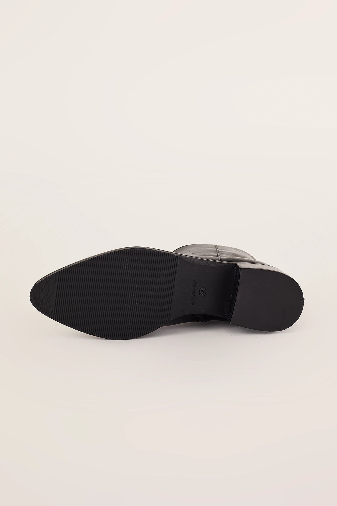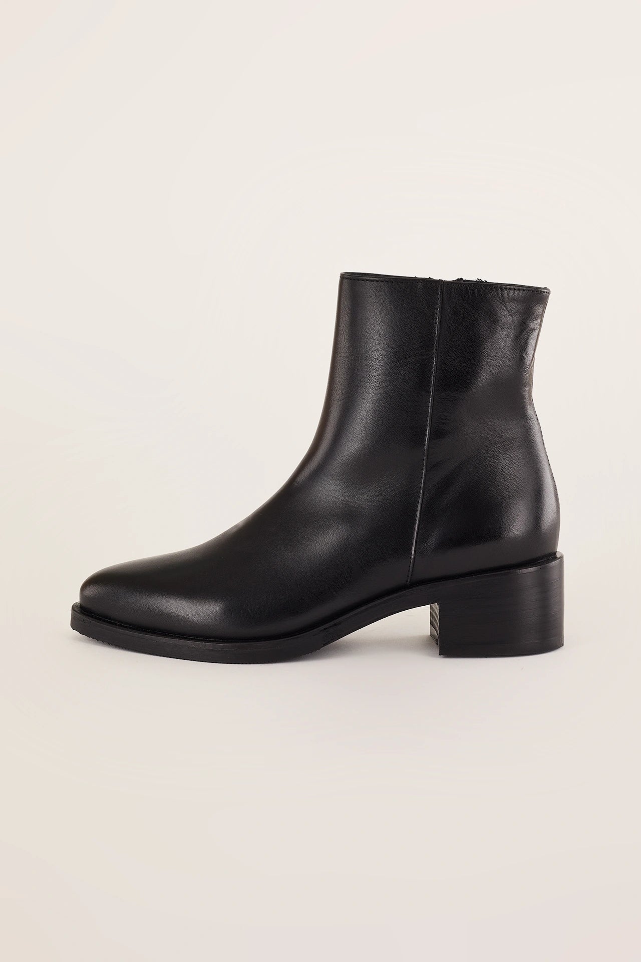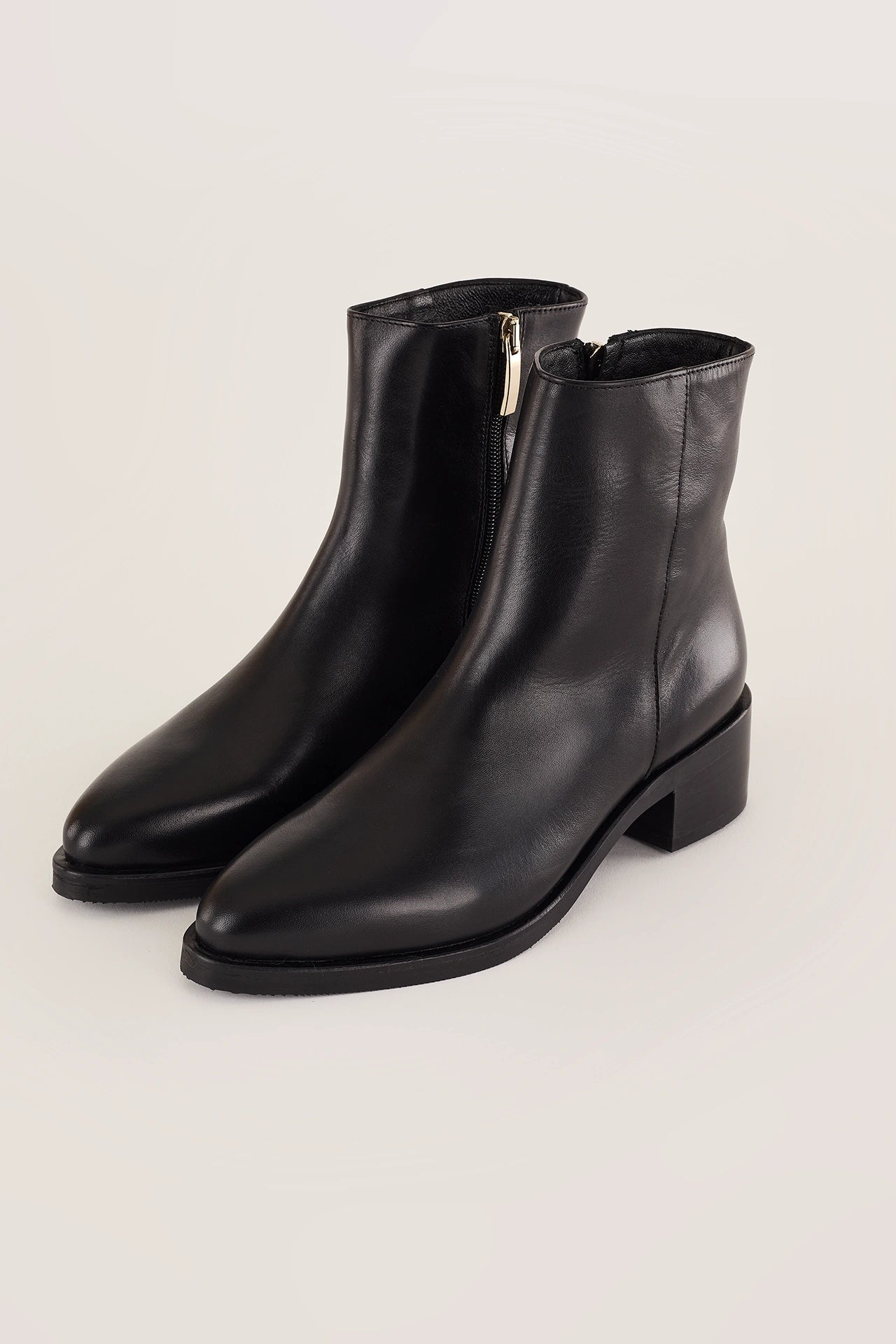 Leather ankle boots are a versatile wardrobe essential, perfect for both office and casual wear. Our boots feature a convenient inner side zipper for easy on and off, paired with a low heel designed for everyday comfort. Available in black leather.