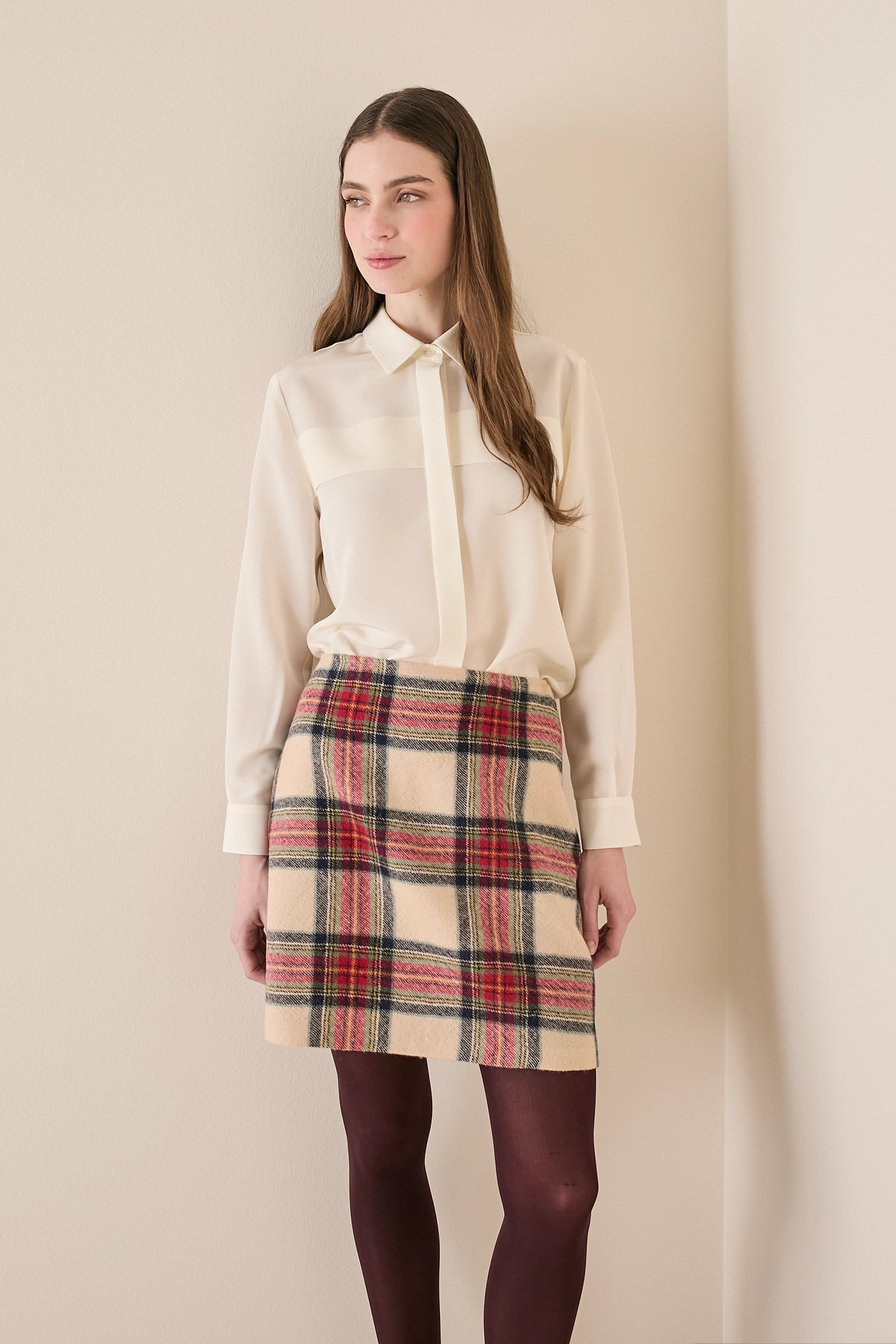 Elegant and versatile, this shirt is one of those pieces you’ll wear on countless occasions: with tailored trousers for the office, with jeans on the weekend, or with a tartan skirt and patent Mary Janes for the holidays. It features a pleat on the yoke that creates a doubled motif and a concealed button placket. Available in ivory.