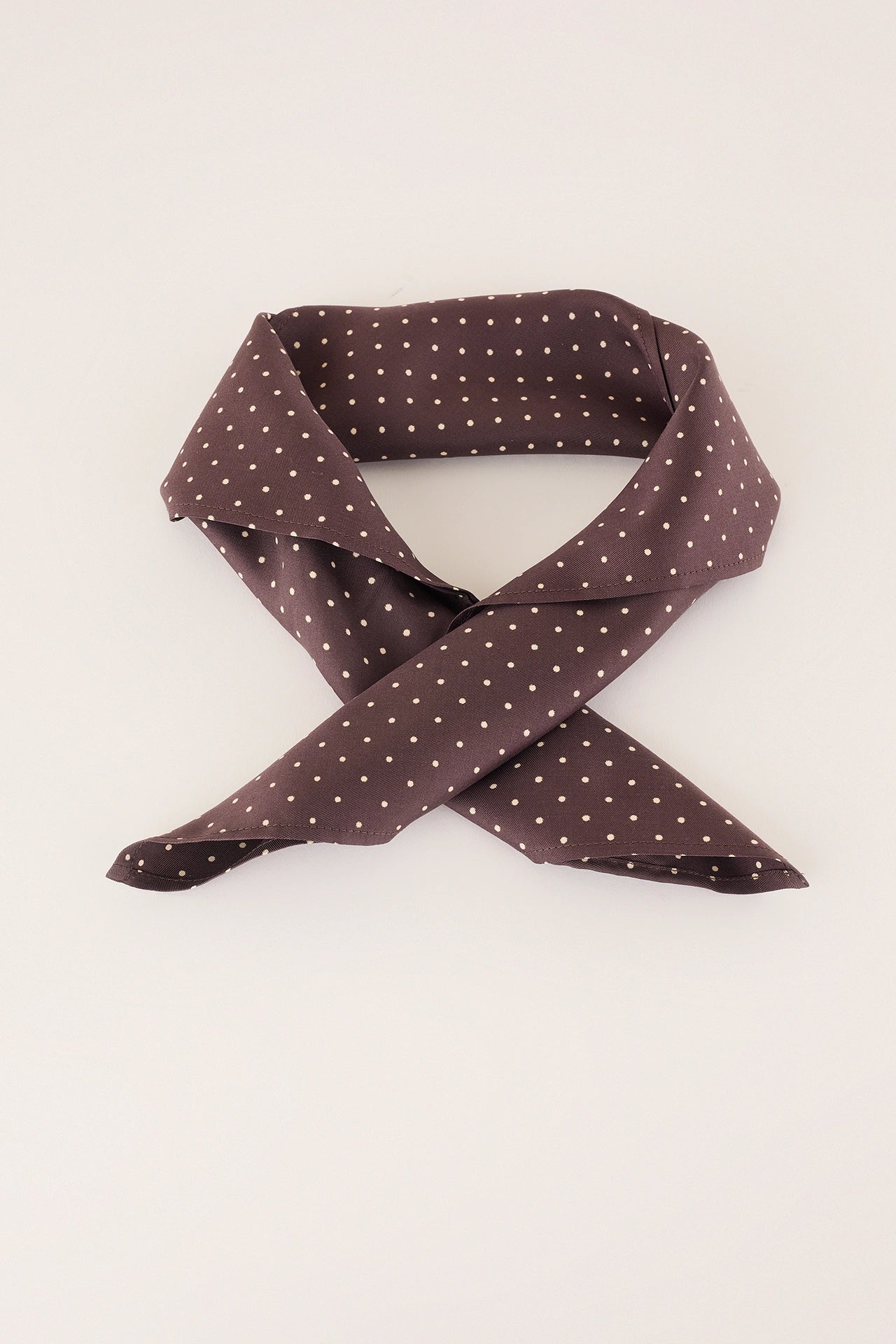 Super lightweight, super versatile: we're big fans of scarves, especially when they're made of pure, vintage silk. Tie one around your neck, in your hair, or use it as an accessory for your bags. Available in: black with white polka dots, white with blue polka dots, gray with white and orange flowers, brown with beige polka dots, and acid green with green polka dots.