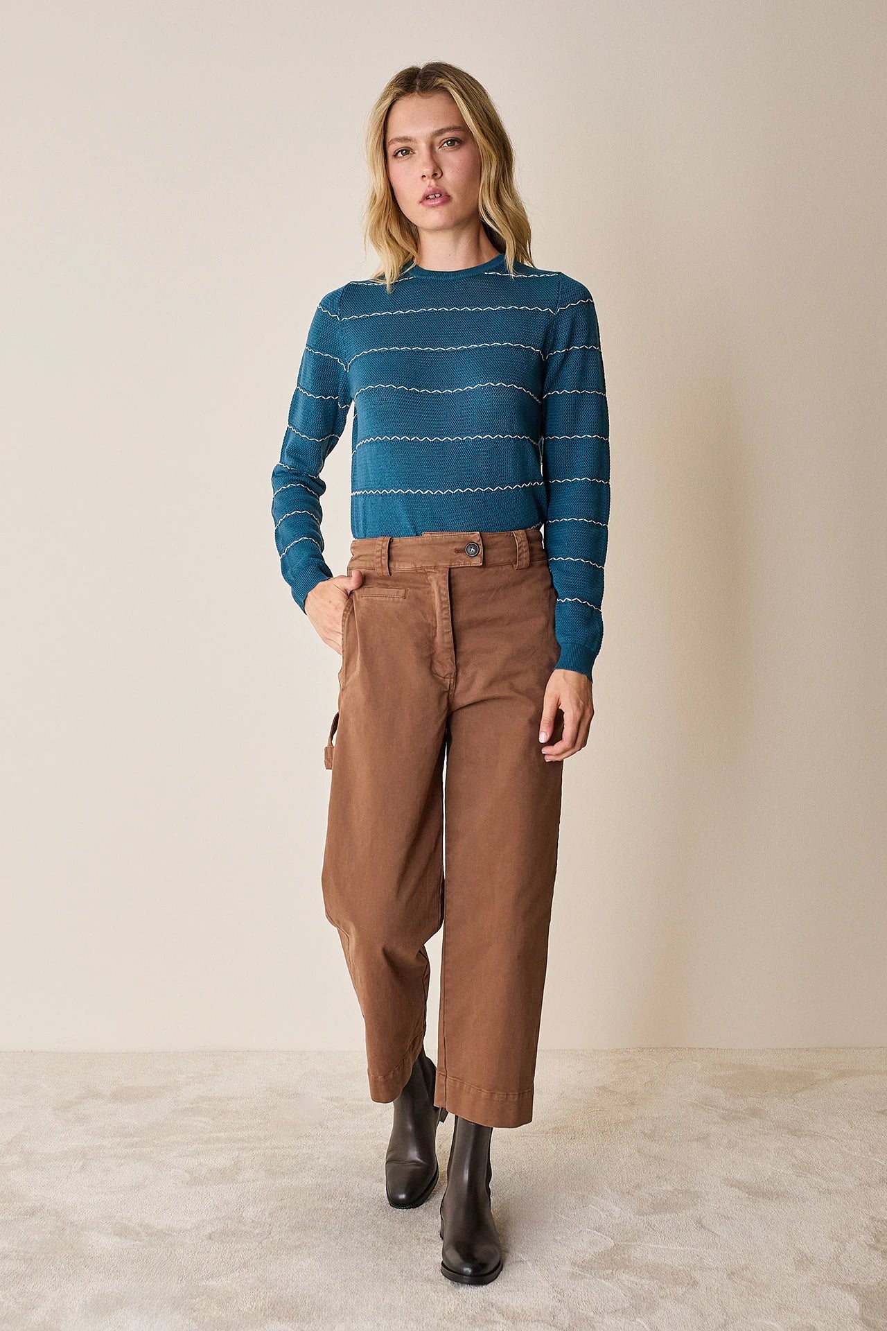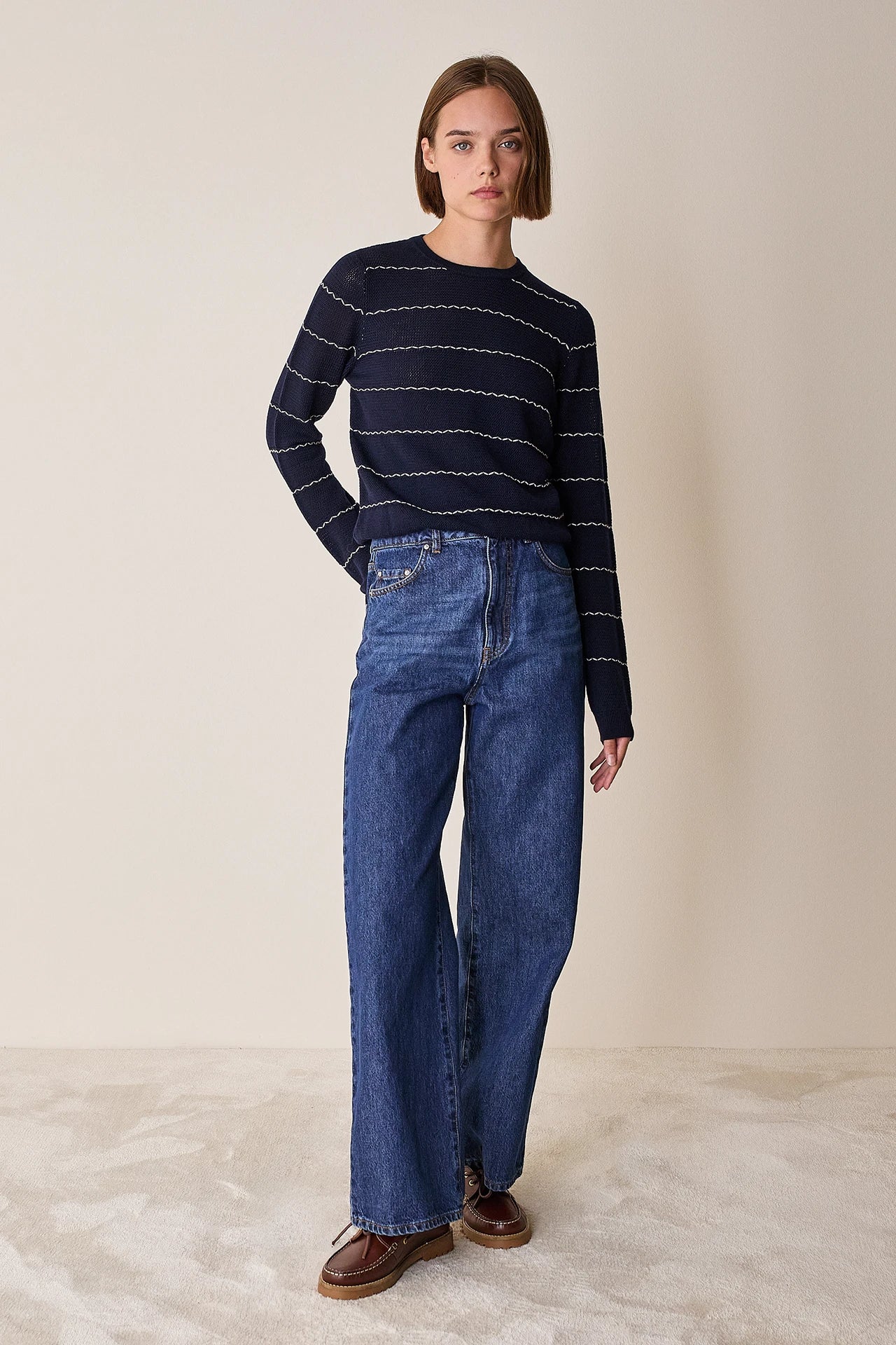 This striped crewneck sweater is inspired by the doodles we used to draw in our school notebooks. Made from pure extra fine virgin merino wool, it's naturally warm and soft on the skin. Ideal for the office, weekends, and any day you want to feel comfortable without wearing a sweatshirt.