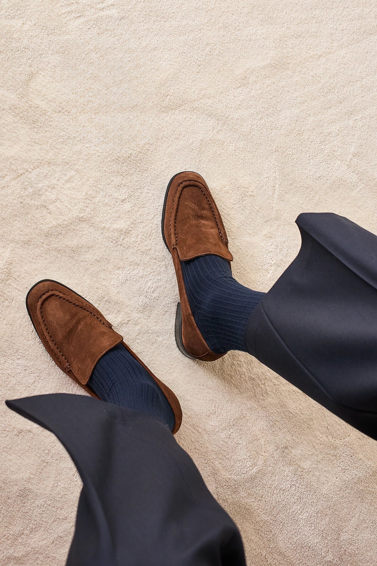 Loafers are the perfect choice for the office during autumn. Stylish and versatile, they effortlessly complement both skirts and pants. Our loafers feature detailed stitching, a subtly squared toe, and a durable rubber sole for all-day comfort and cushioning. Available in brown suede leather.