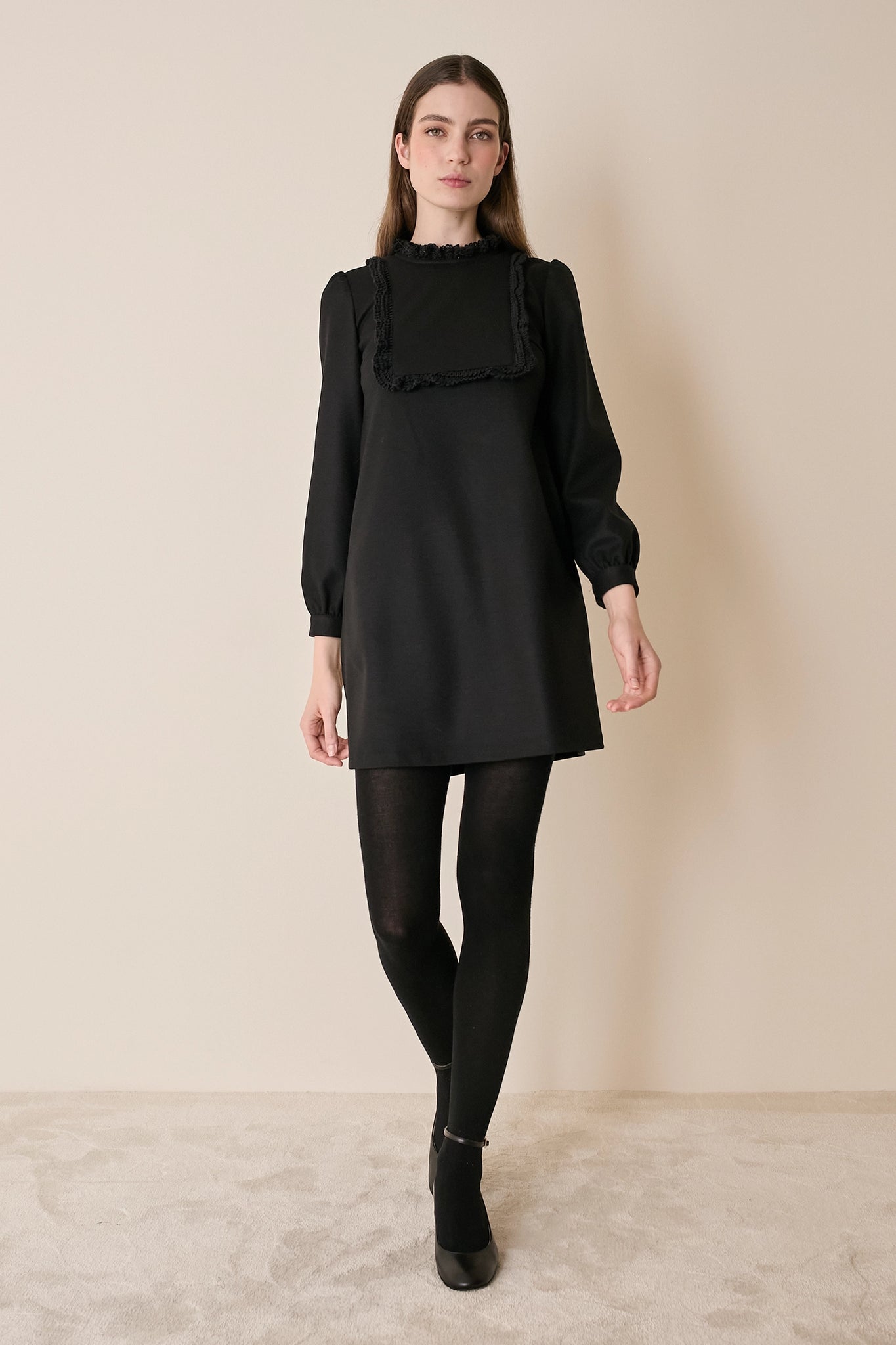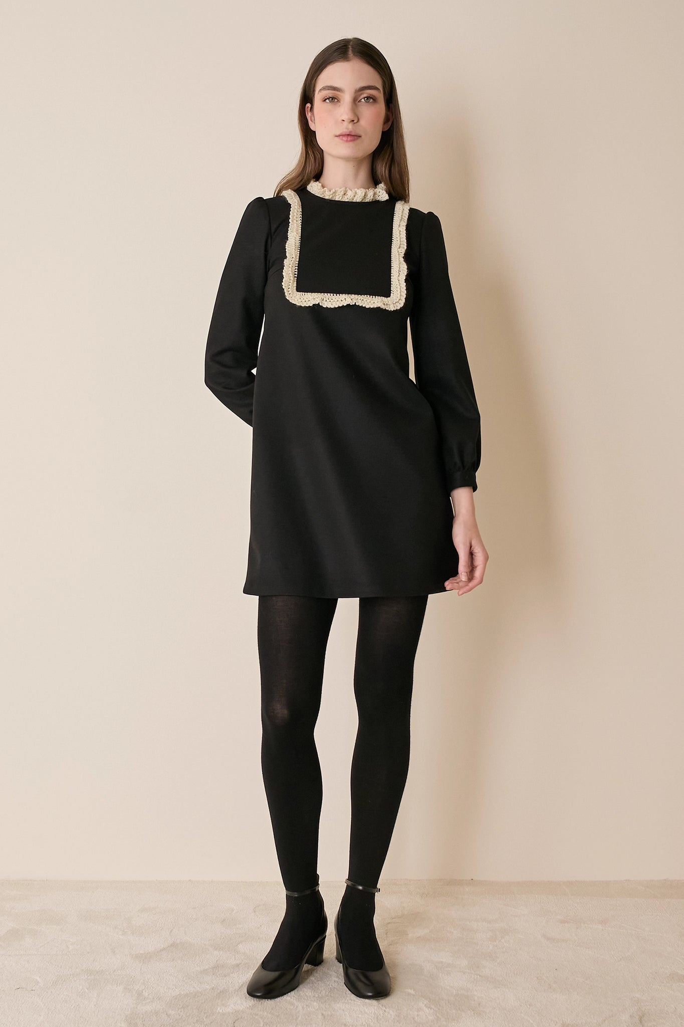 This dress is defined by its soft trim details. Perfect for holiday dinners and festive gatherings, it’s one of those pieces that don’t need much else. Tights, Mary Janes — and you’re ready to go!