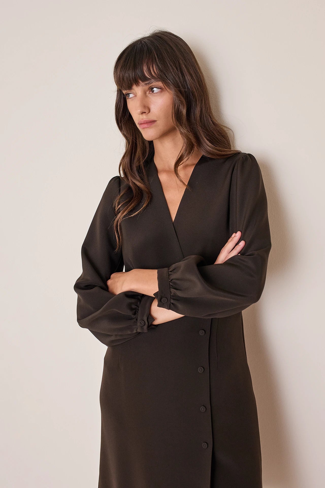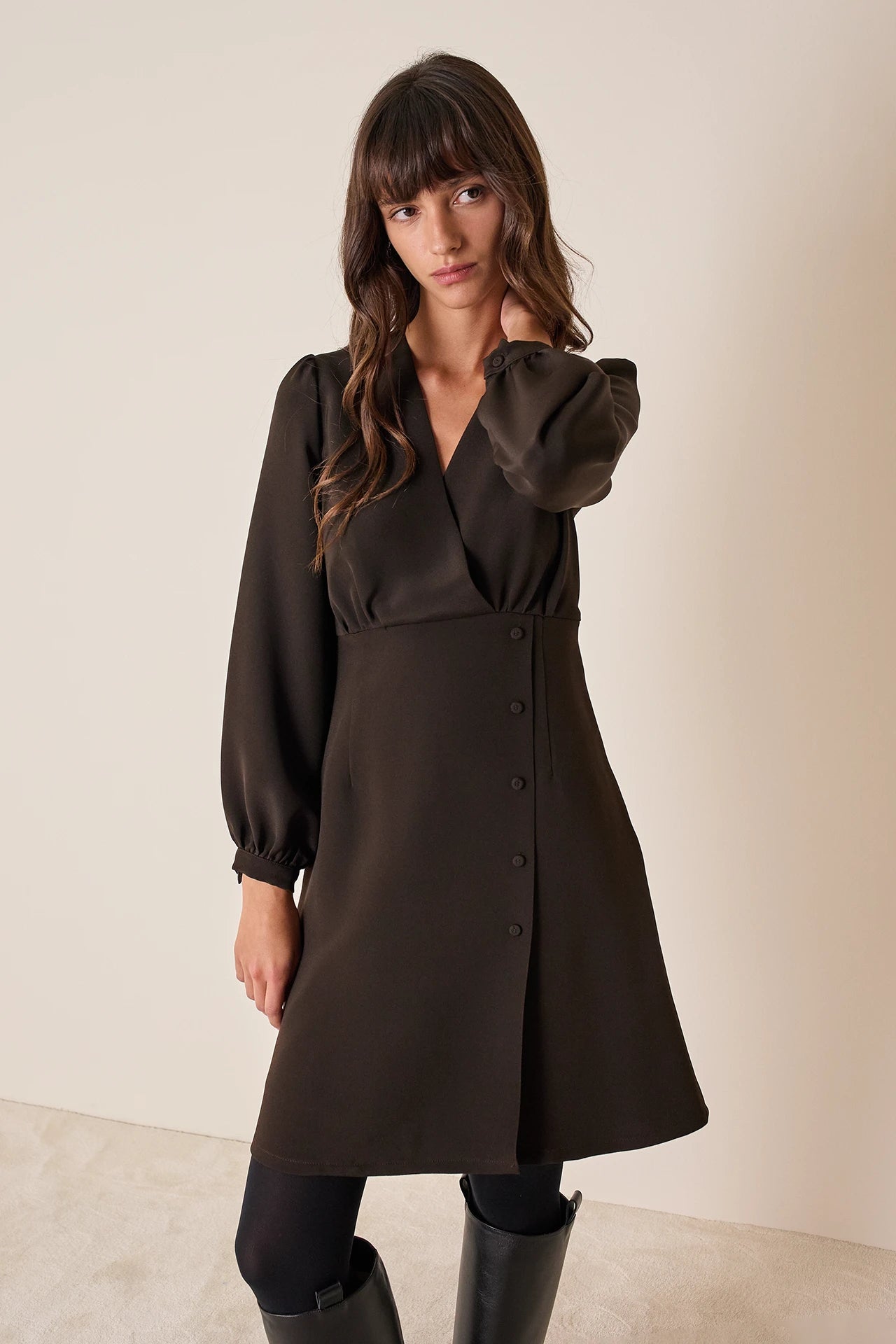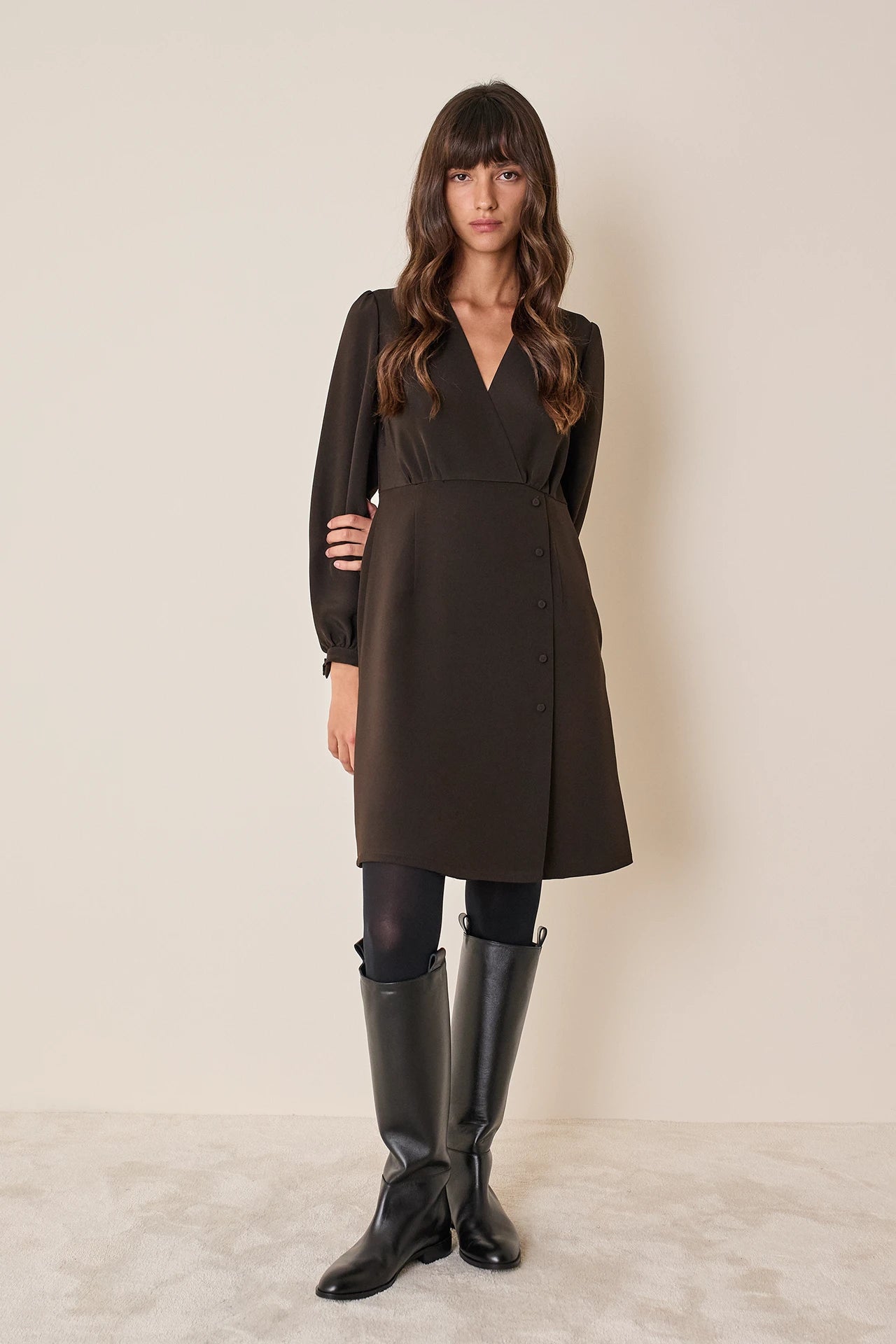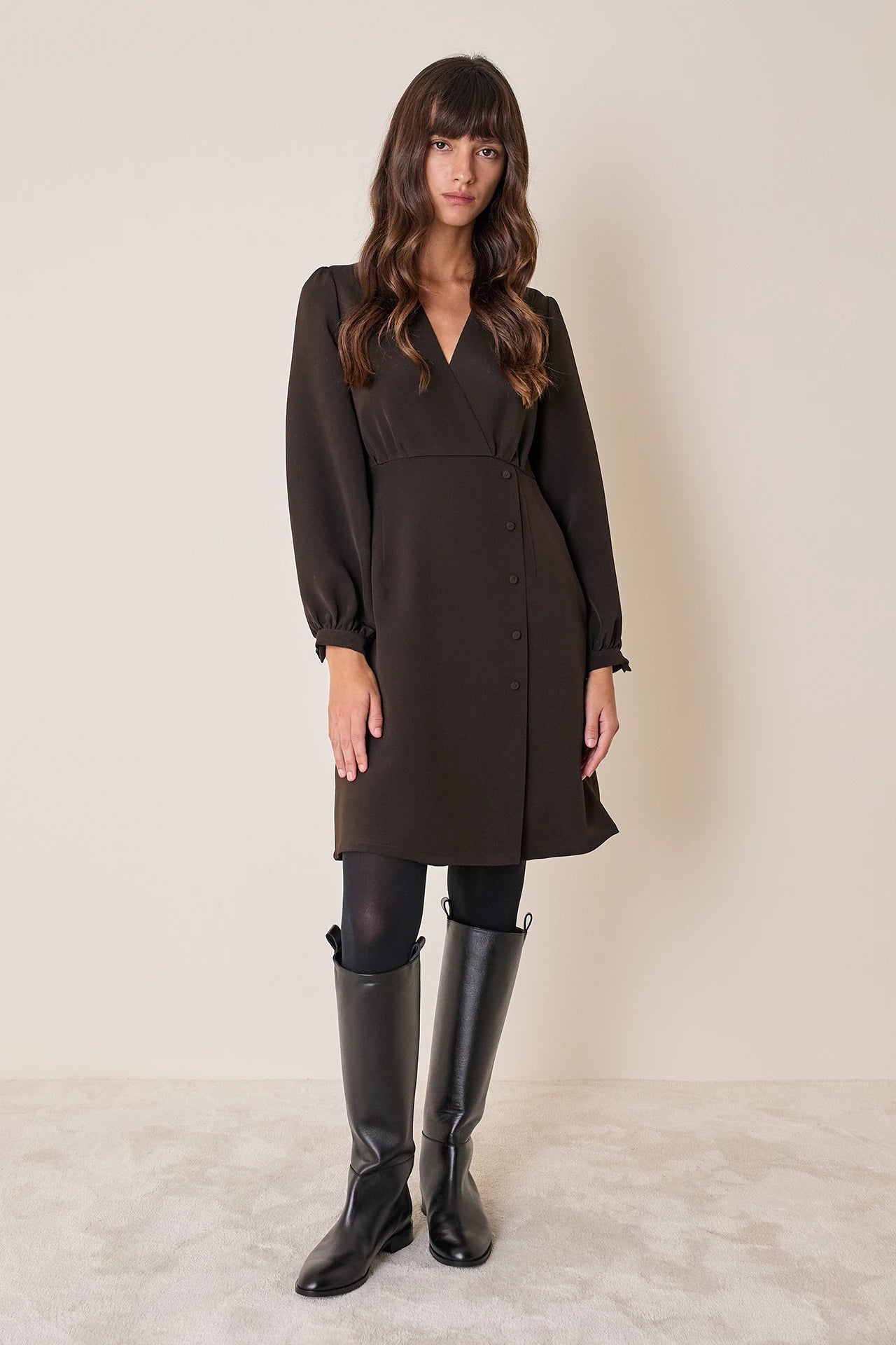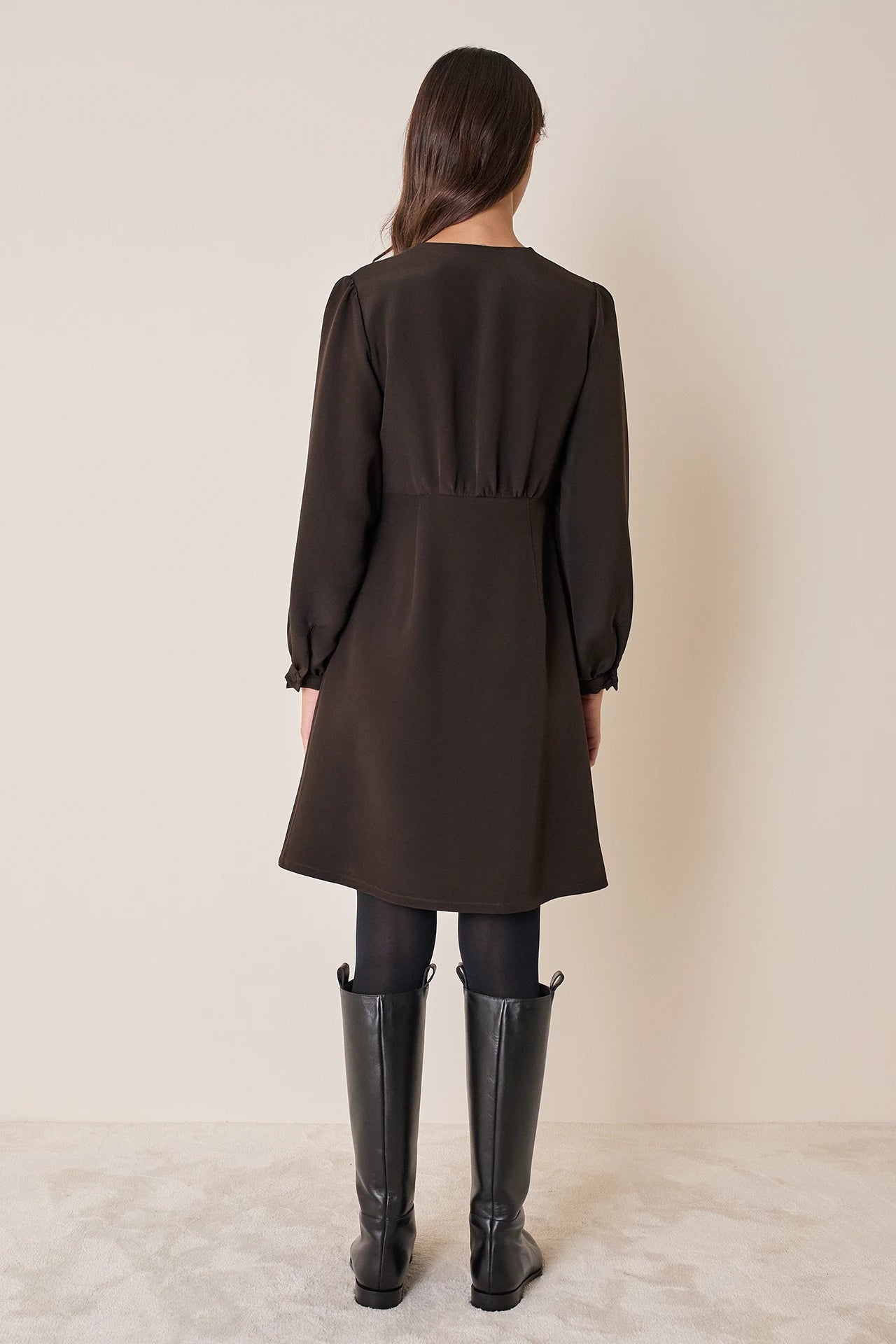 Semplice e versatile, questo abito in crepe elasticizzata è perfetto per l’ufficio. Indossalo con o senza calze, abbinato a slingback o stivali in pelle. Disponibile in nero o marrone.