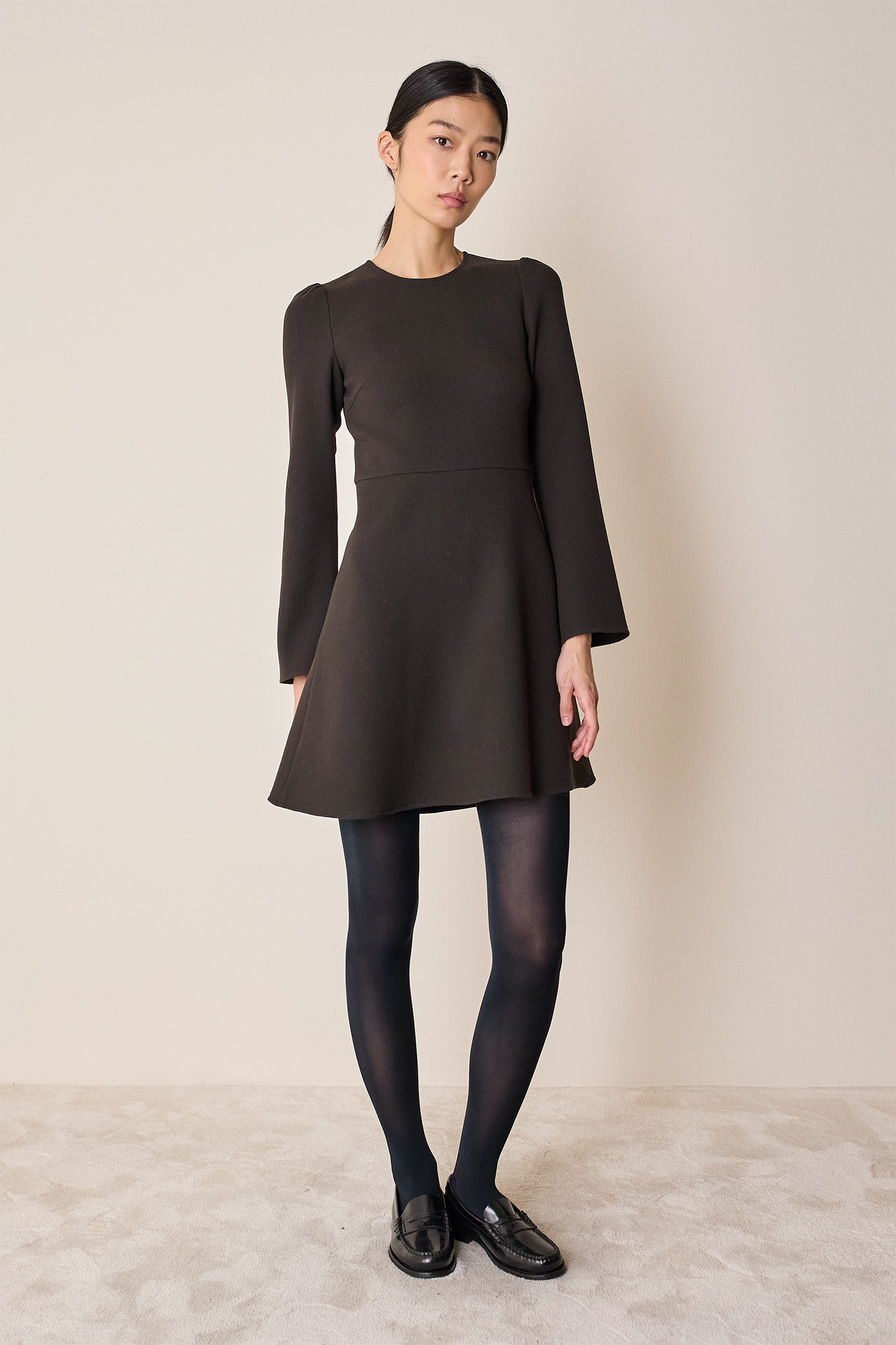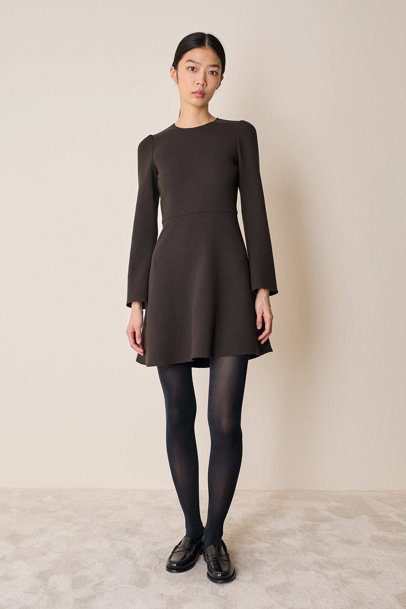 Semplice e versatile, questo abito con maniche svasate e gonna fluida è perfetto tanto per l’ufficio quanto per una cena.