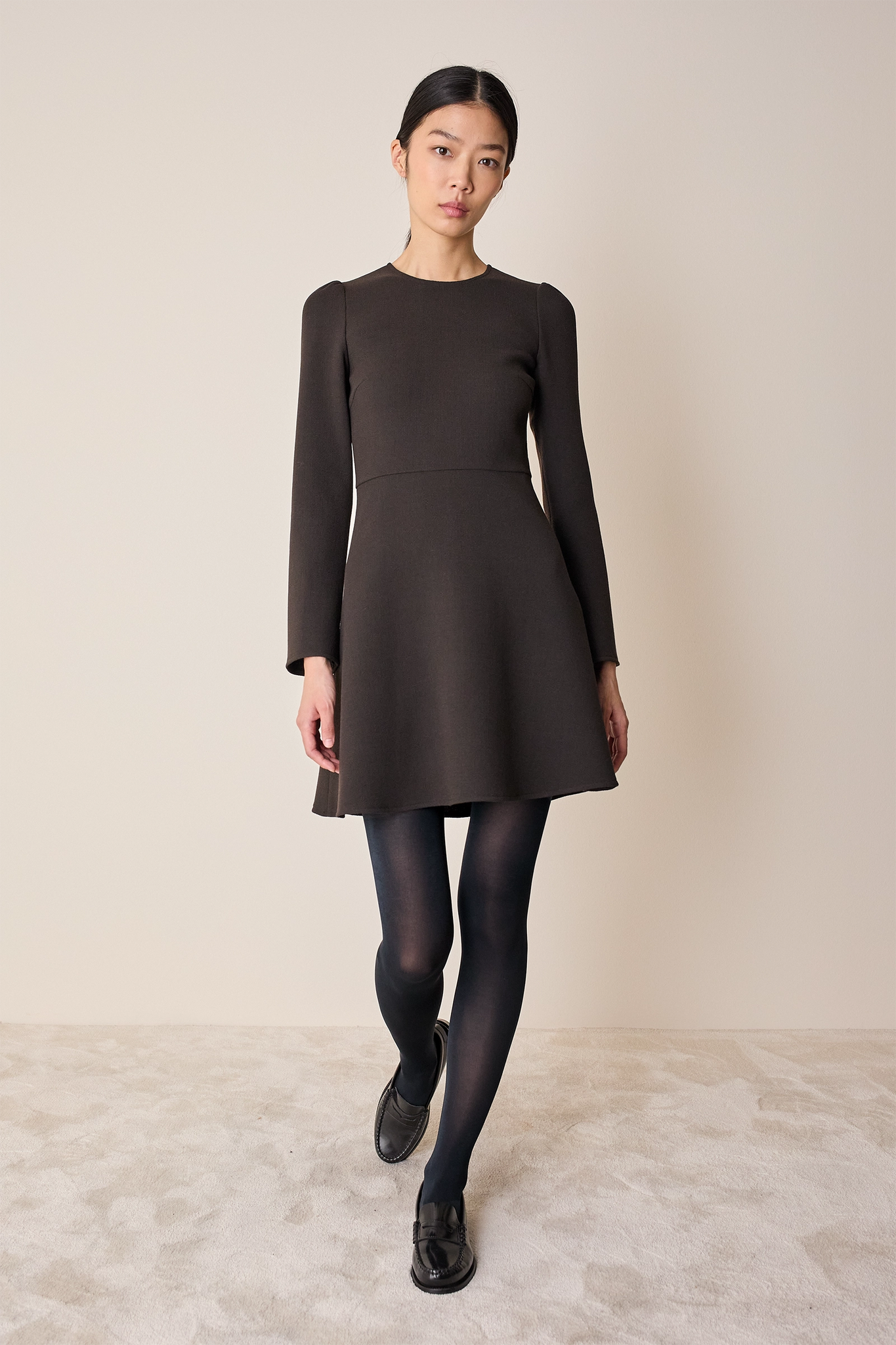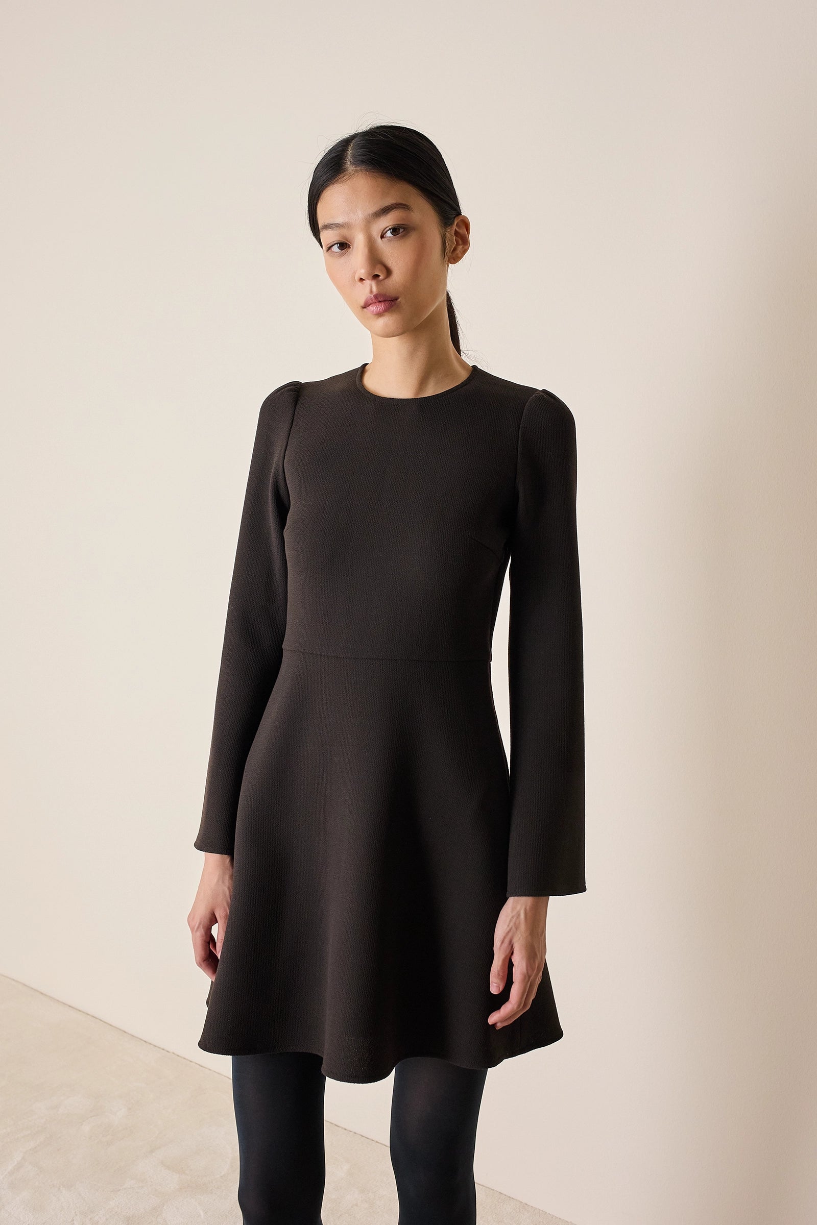 Abito corto con gonna fluida in doppio crêpe di lana