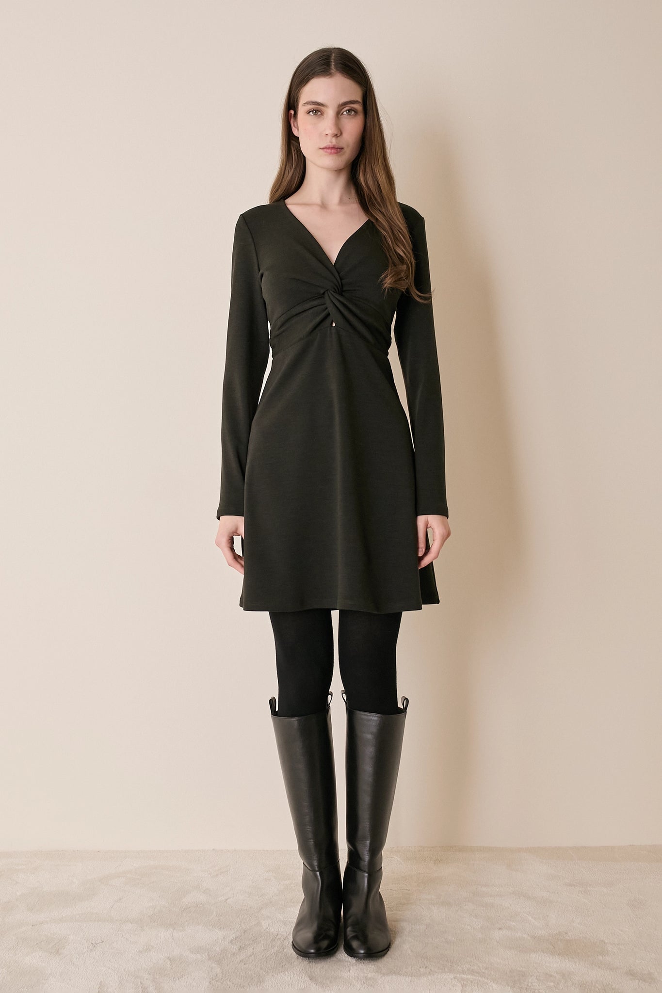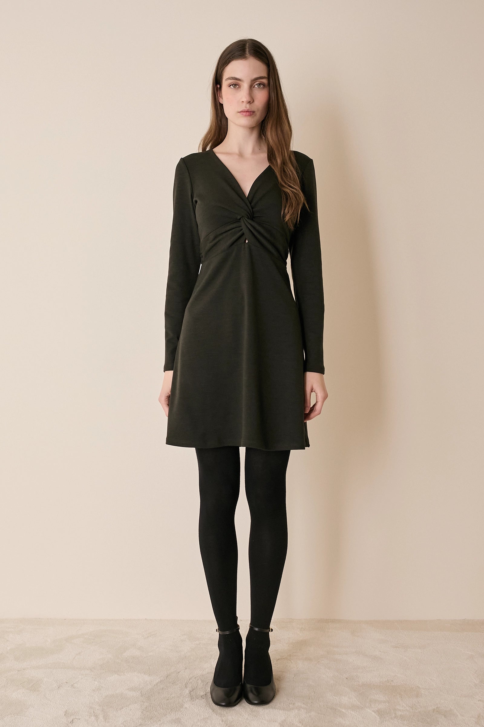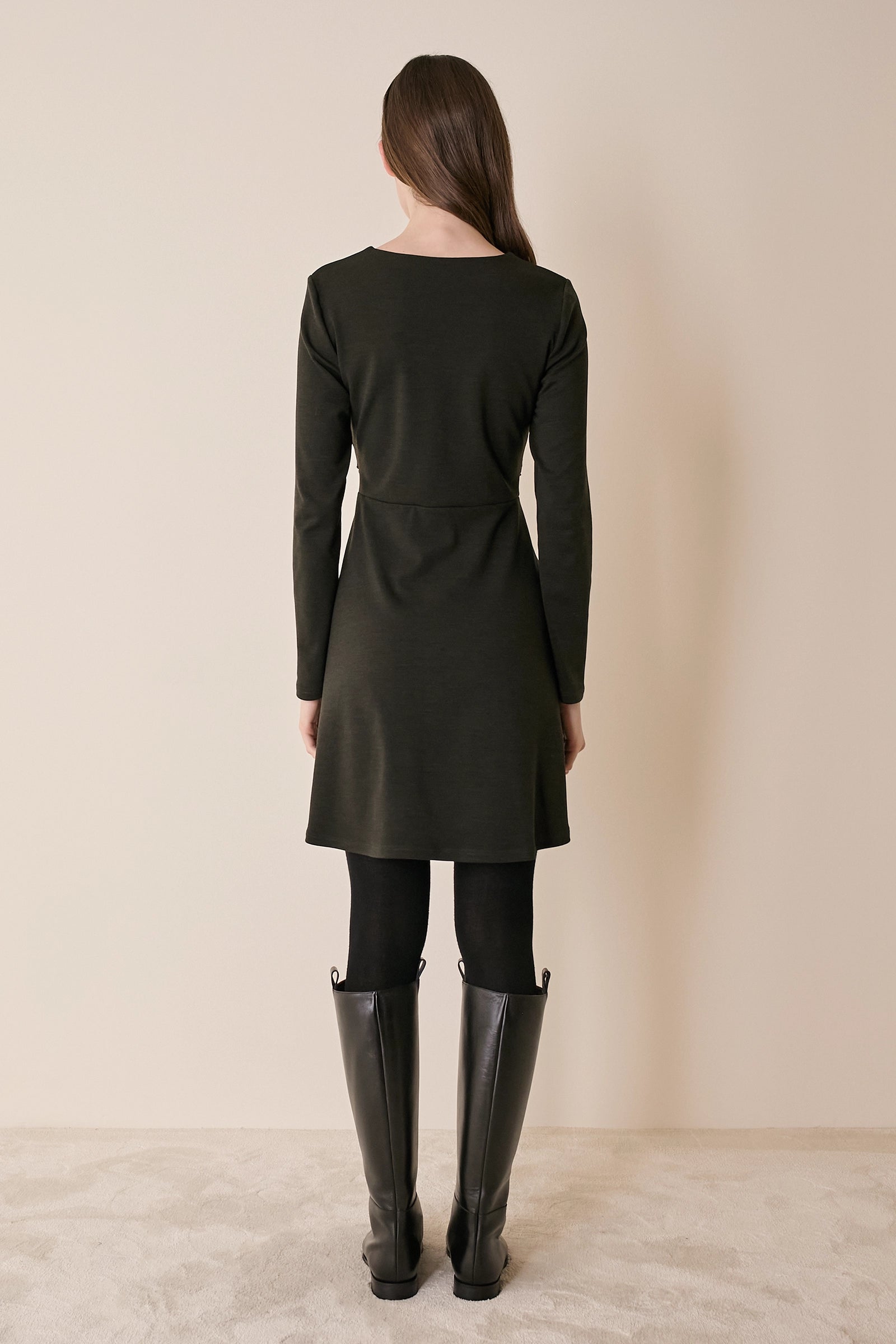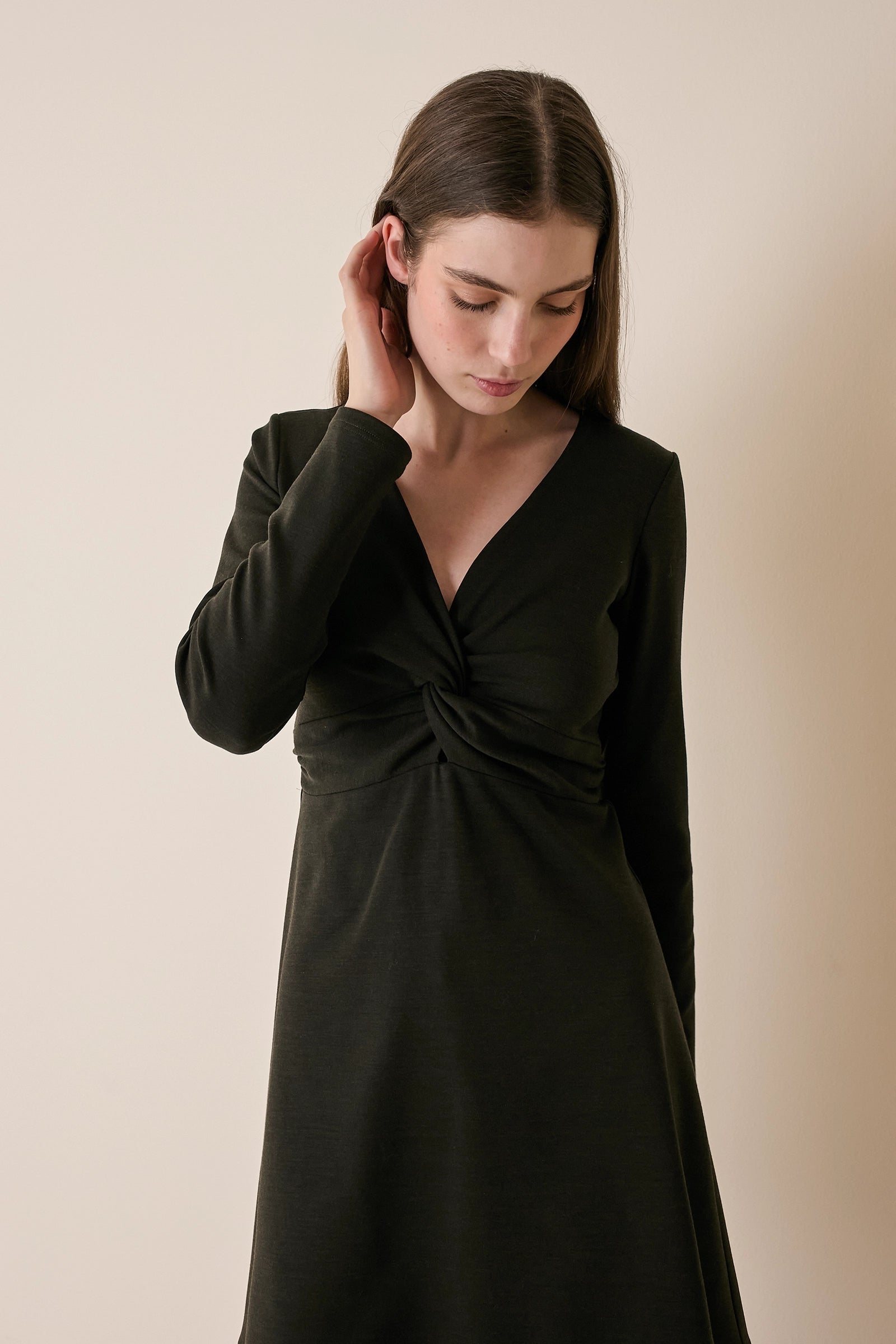 Questo abito in jersey di lana, con corpetto aderente e gonna fluida, è caratterizzato da un motivo incrociato che crea un profondo scollo a V.