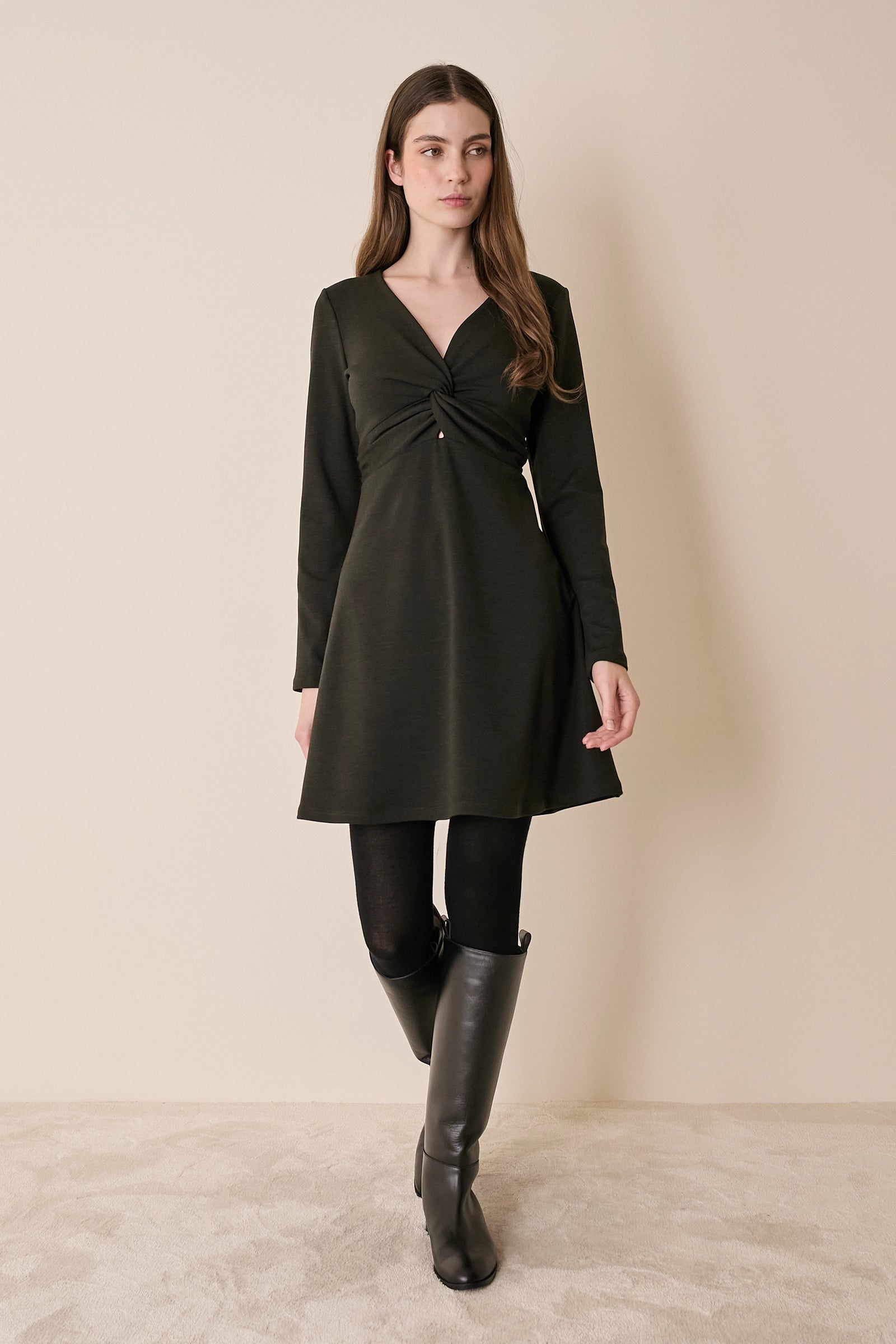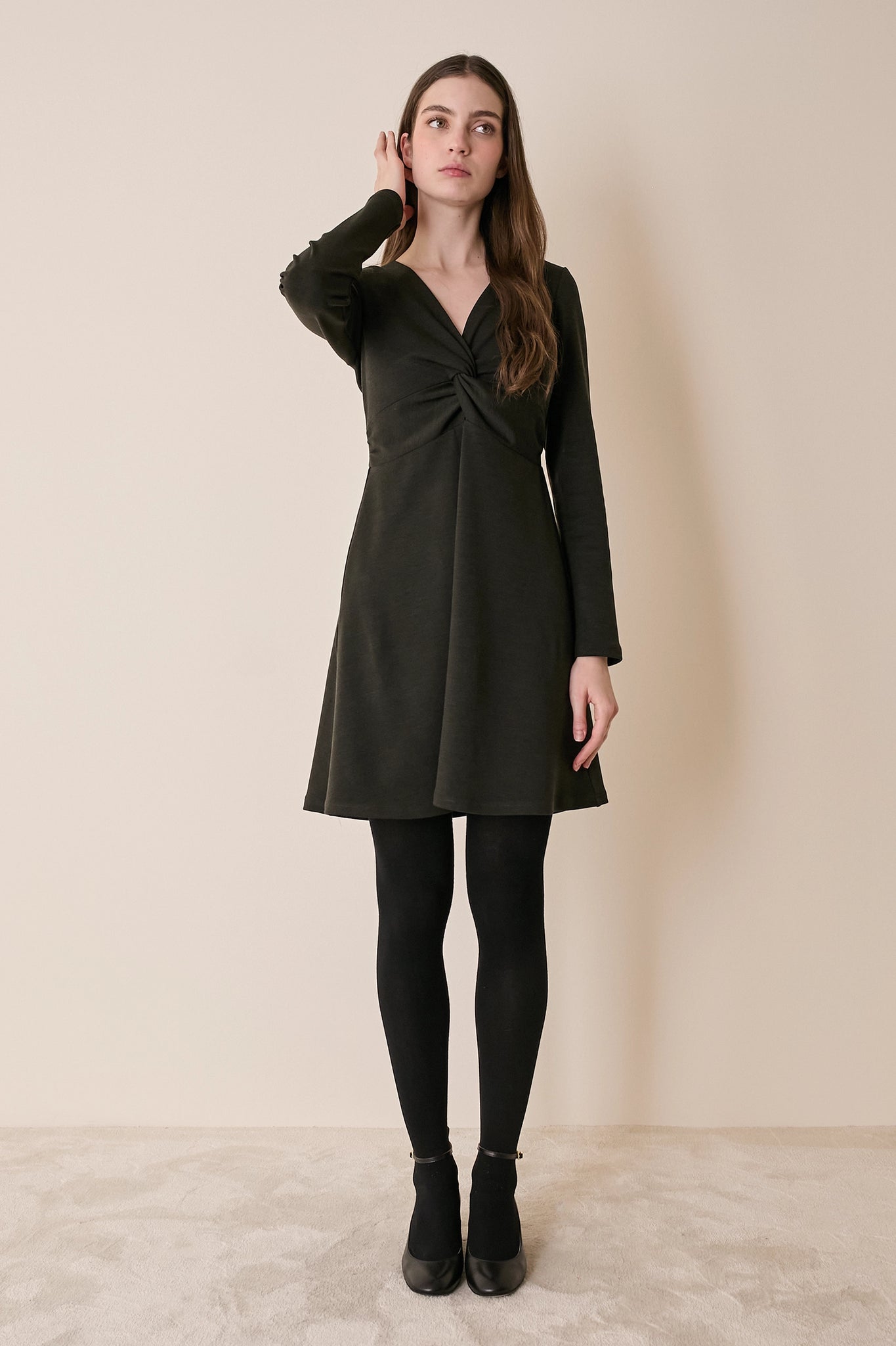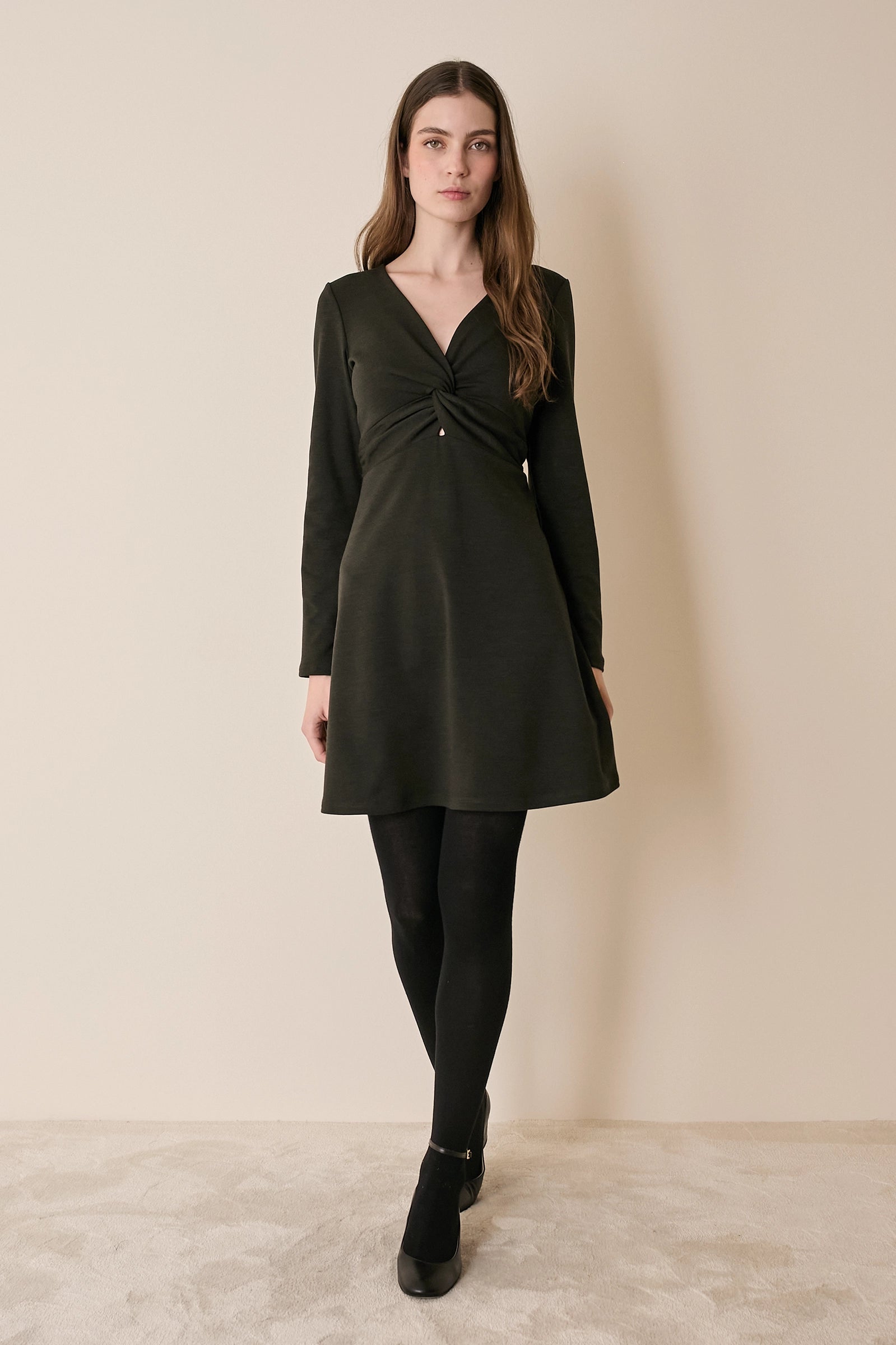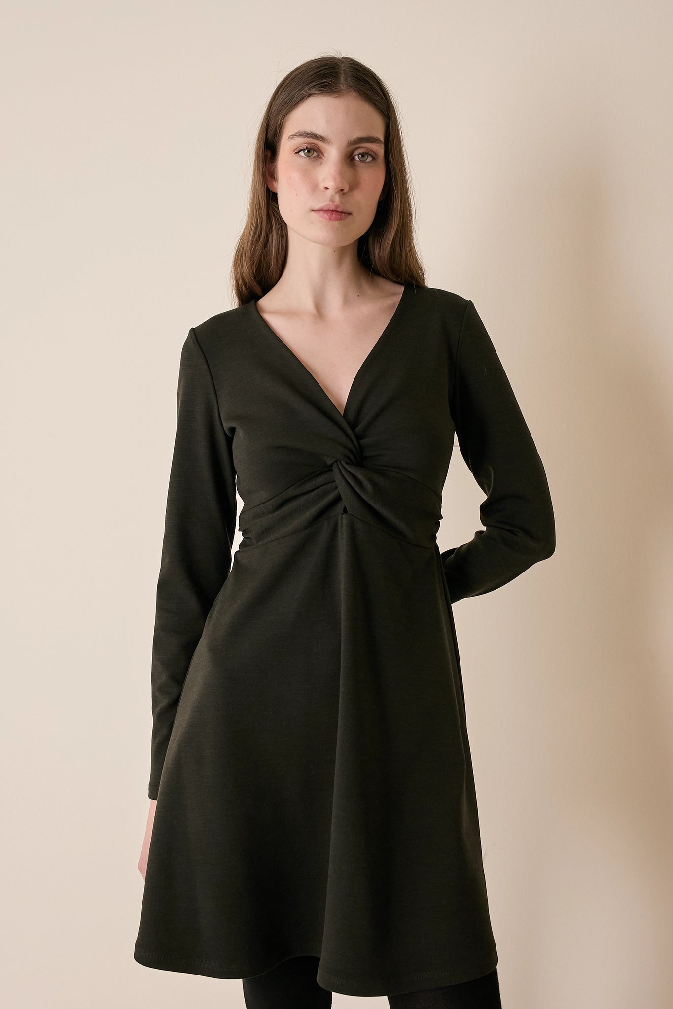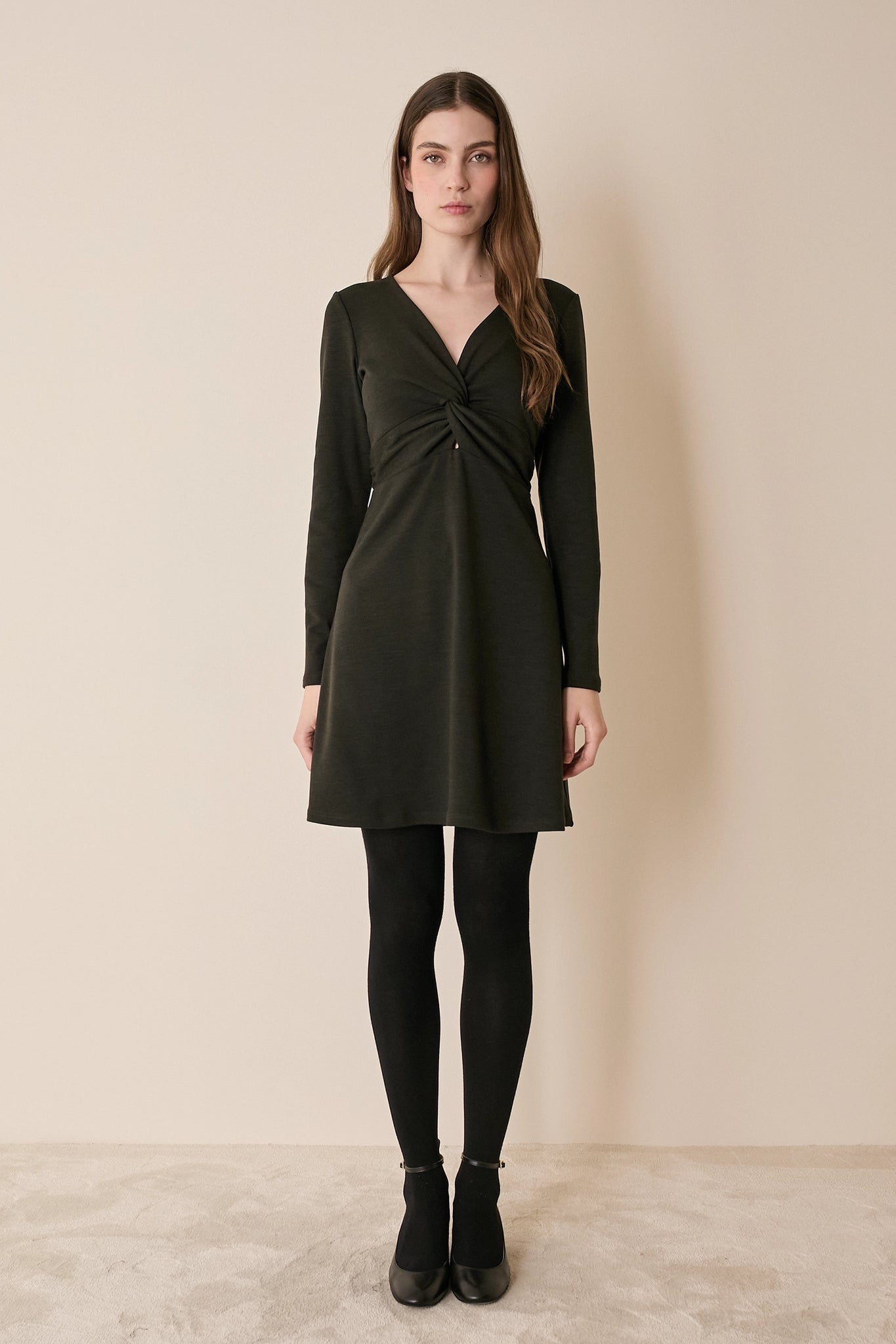 Questo abito in jersey di lana, con corpetto aderente e gonna fluida, è caratterizzato da un motivo incrociato che crea un profondo scollo a V.