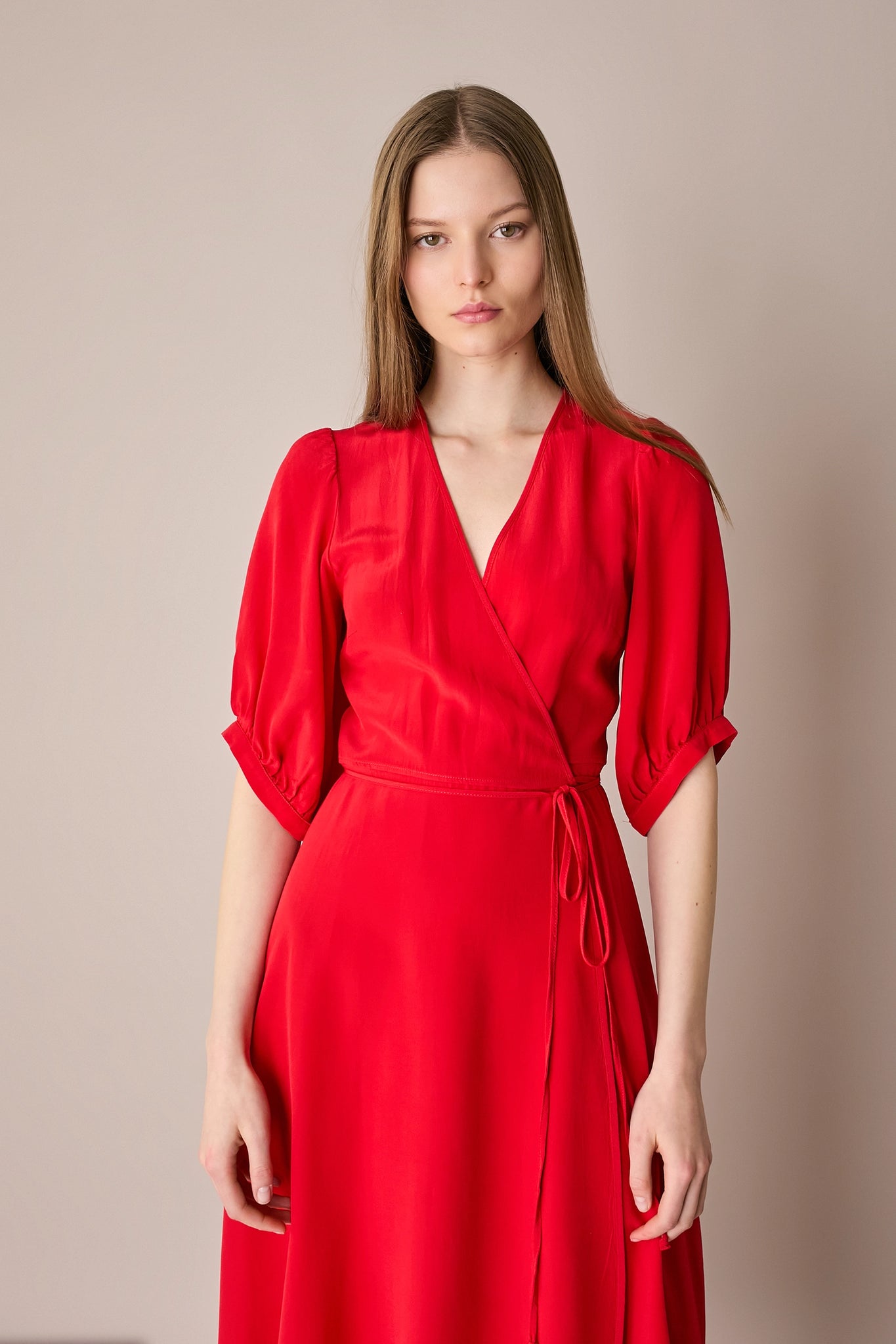 Questo abito a portafoglio è realizzato in pura crêpe de chine di seta ed è ideale sia per le cerimonie – ti basterà abbinarlo a un bel paio di sandali – sia per l’ufficio, con un blazer e un paio di stivali.