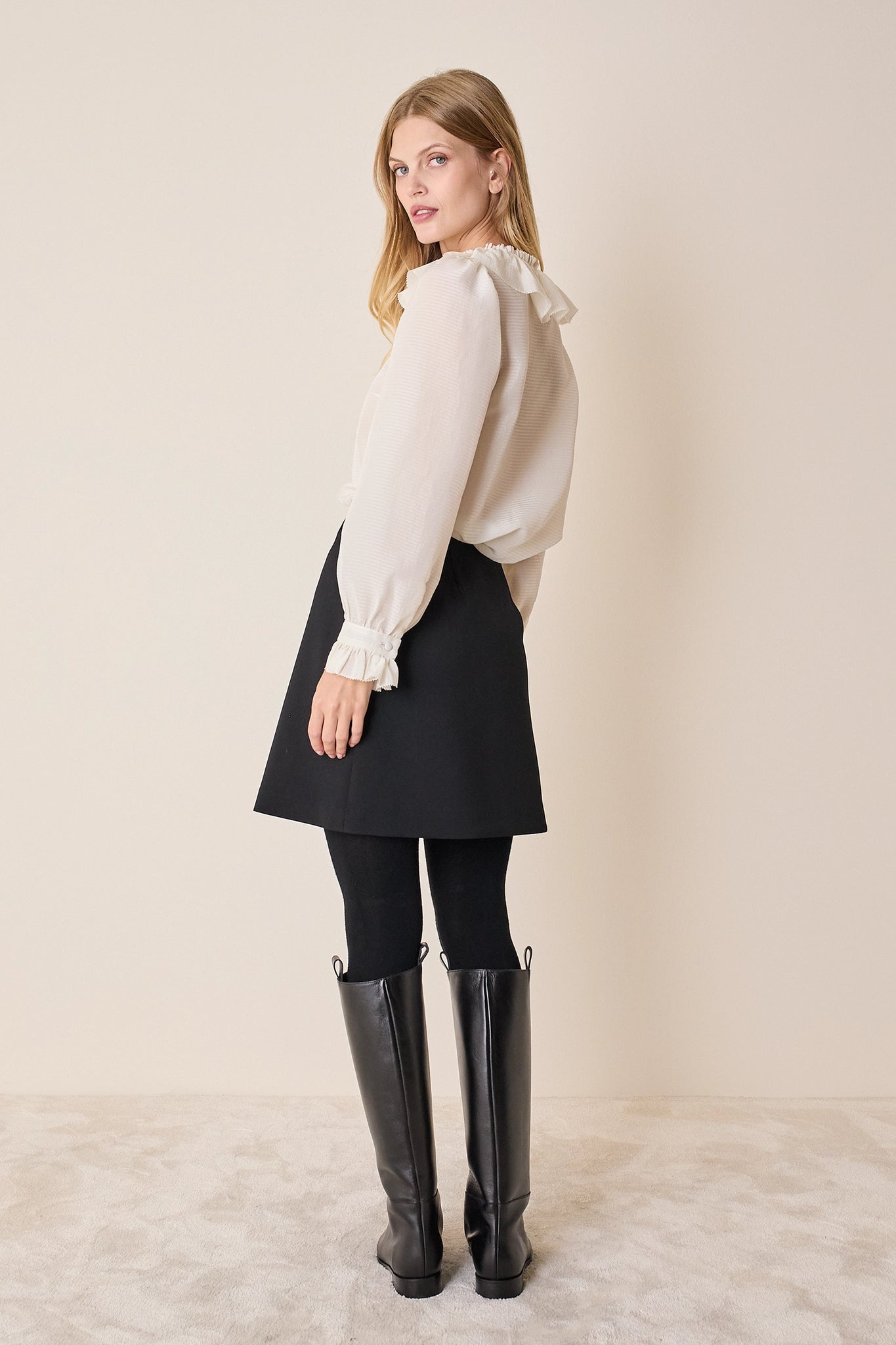 Questa camicia in pura seta è caratterizzata da tanti dettagli romantici: il colletto e i polsini volant, le maniche a sbuffo, i bottoncini ricoperti e il motivo a righe tono su tono del tessuto.