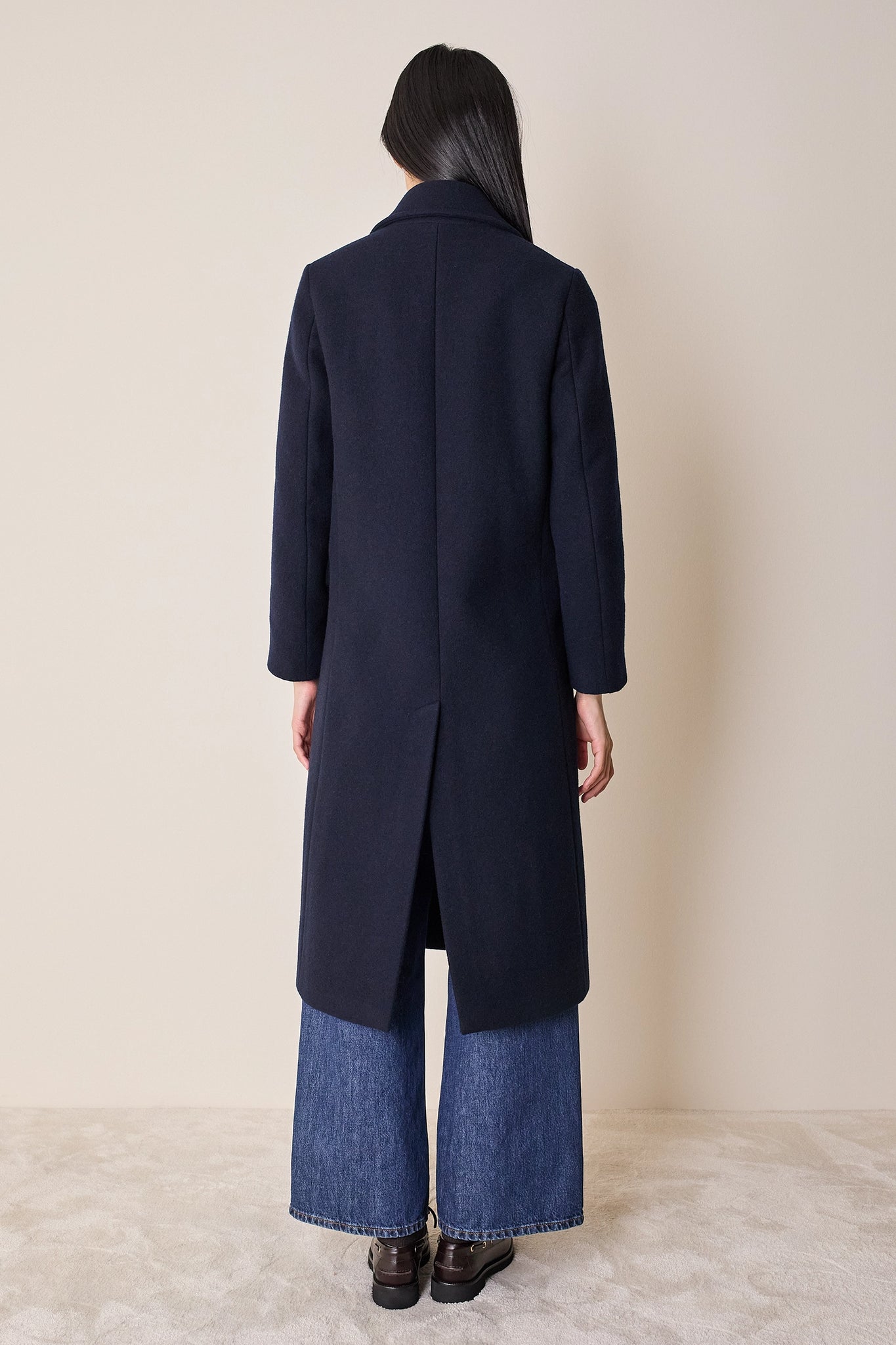 Il modello è senza tempo: lungo, con abbottonatura doppiopetto e revers.