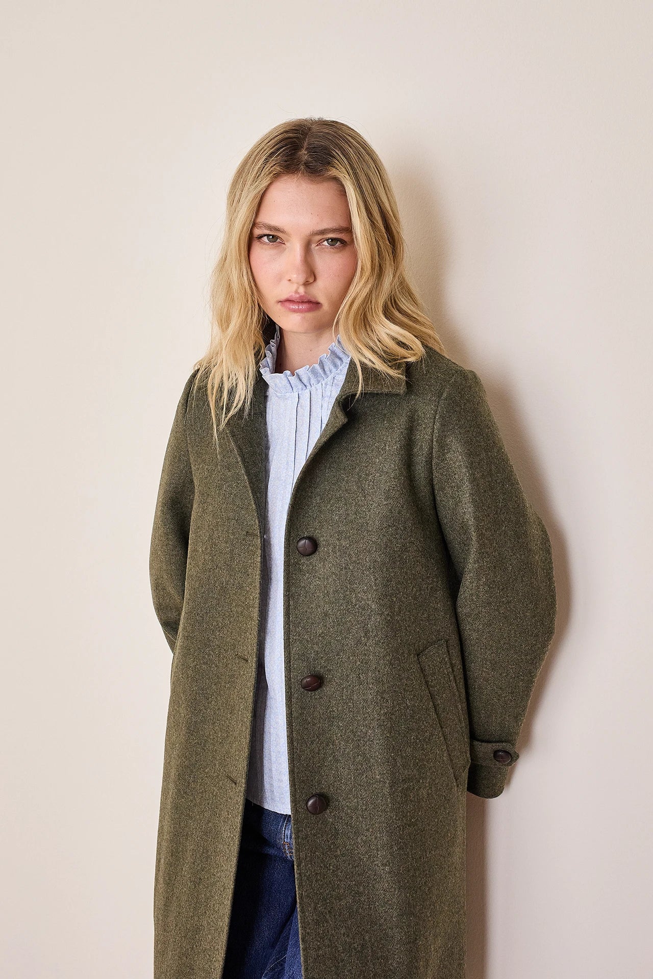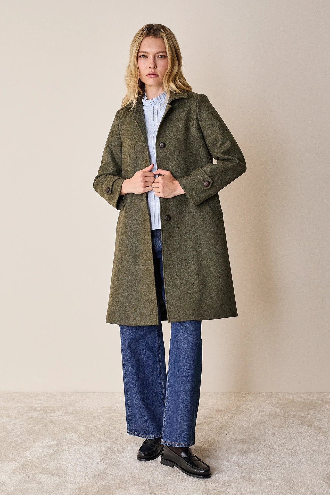 Questo cappotto è ispirato all'intramontabile loden. La linea è semplice e dritta, il colletto strutturato, i bottoni classici. Realizzato in una calda lana vergine, è disponibile in verde mélange.