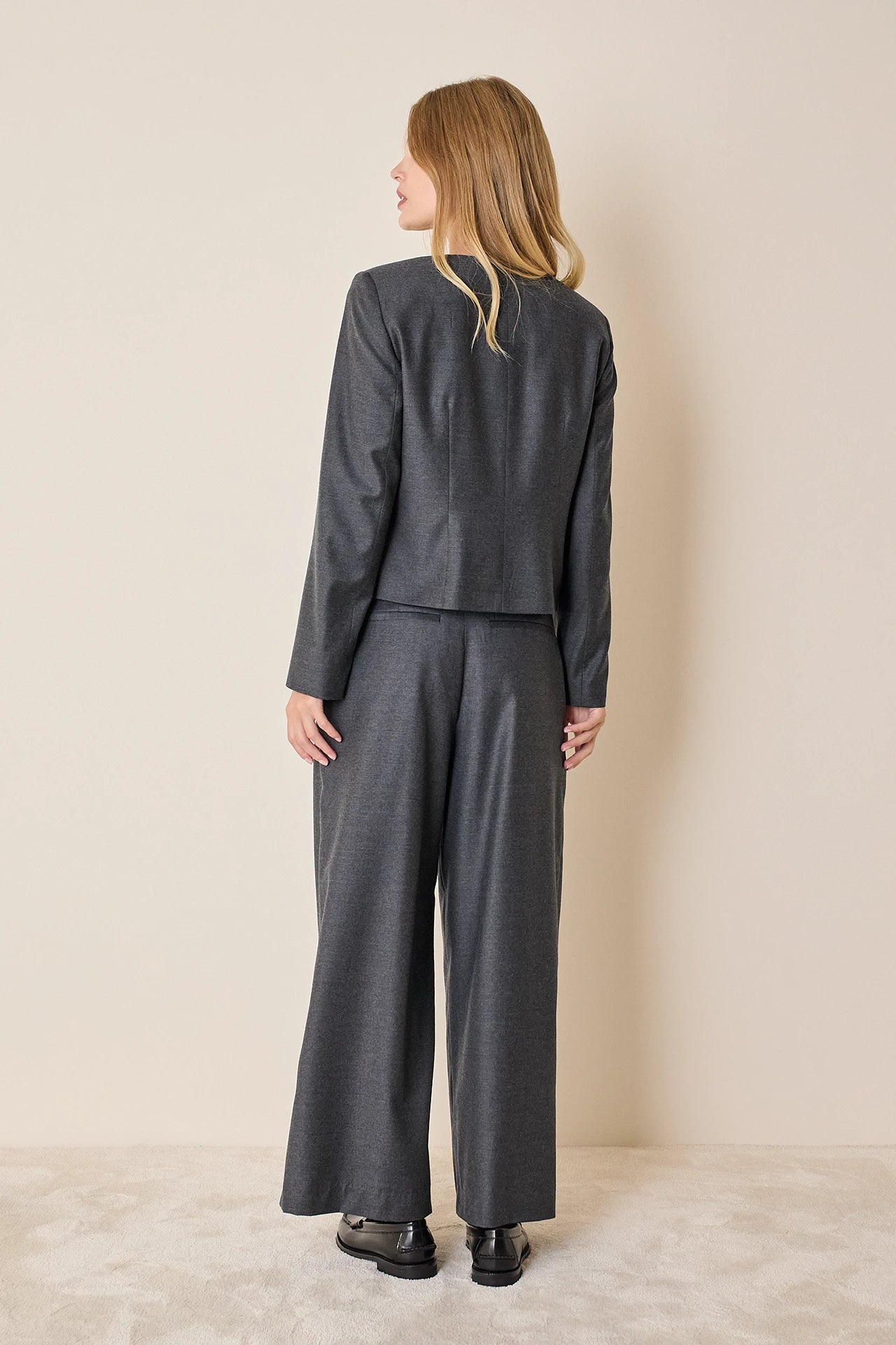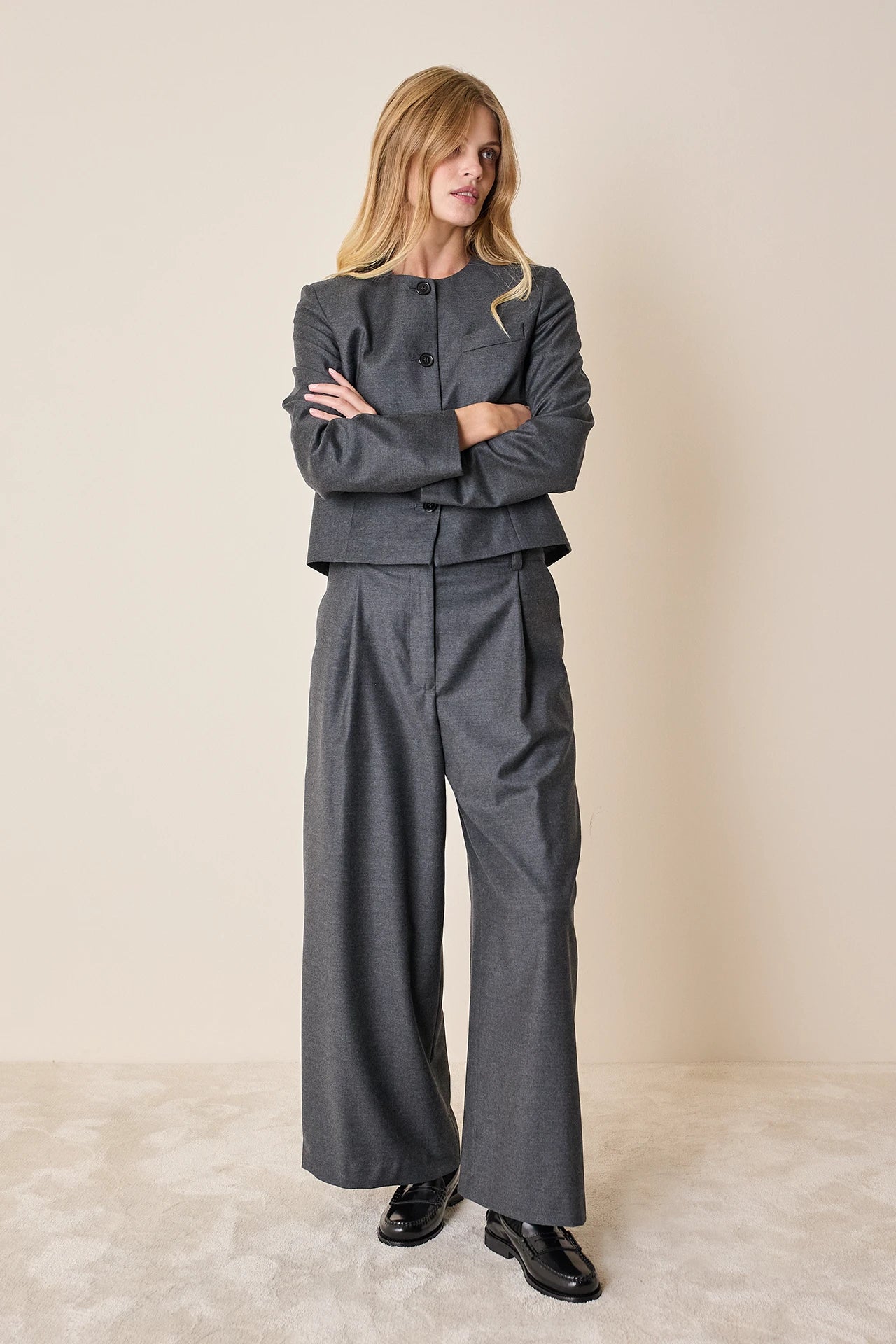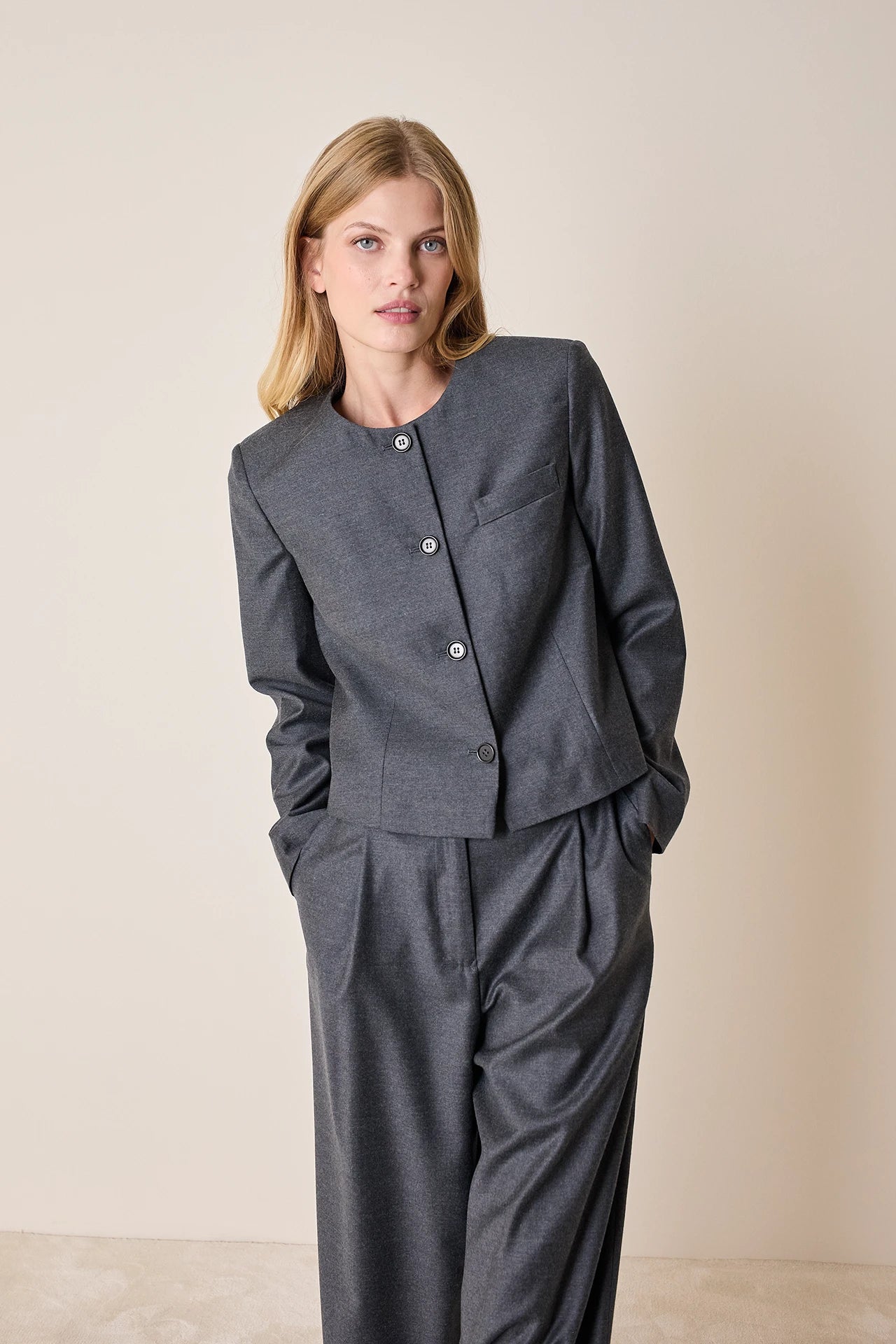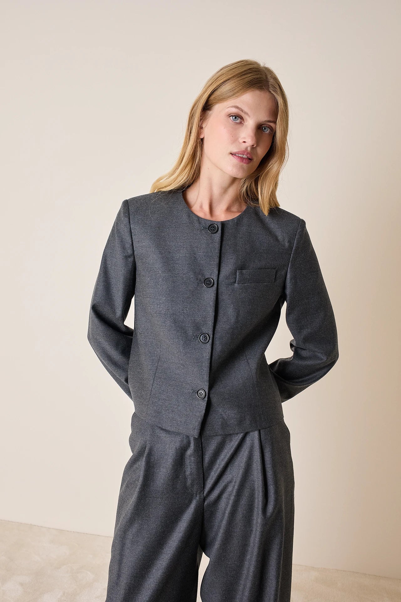 Nel disegnare questa giacca ci siamo ispirate all’eleganza minimale degli anni ’90, esemplificata da Carolyn Bessette-Kennedy. Sofisticata se abbinata ai pantaloni realizzati nello stesso tessuto, puoi anche creare un contrasto d’effetto indossandola con un paio di jeans a gamba ampia. Realizzata in un prezioso blend di lana e seta, è disponibile in grigio.