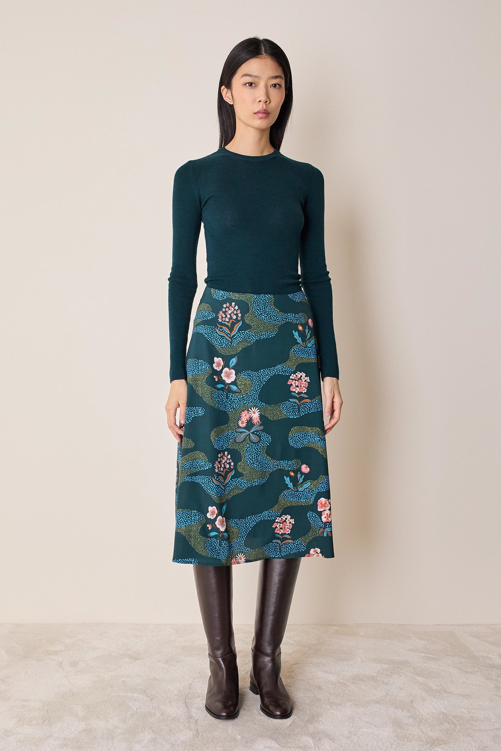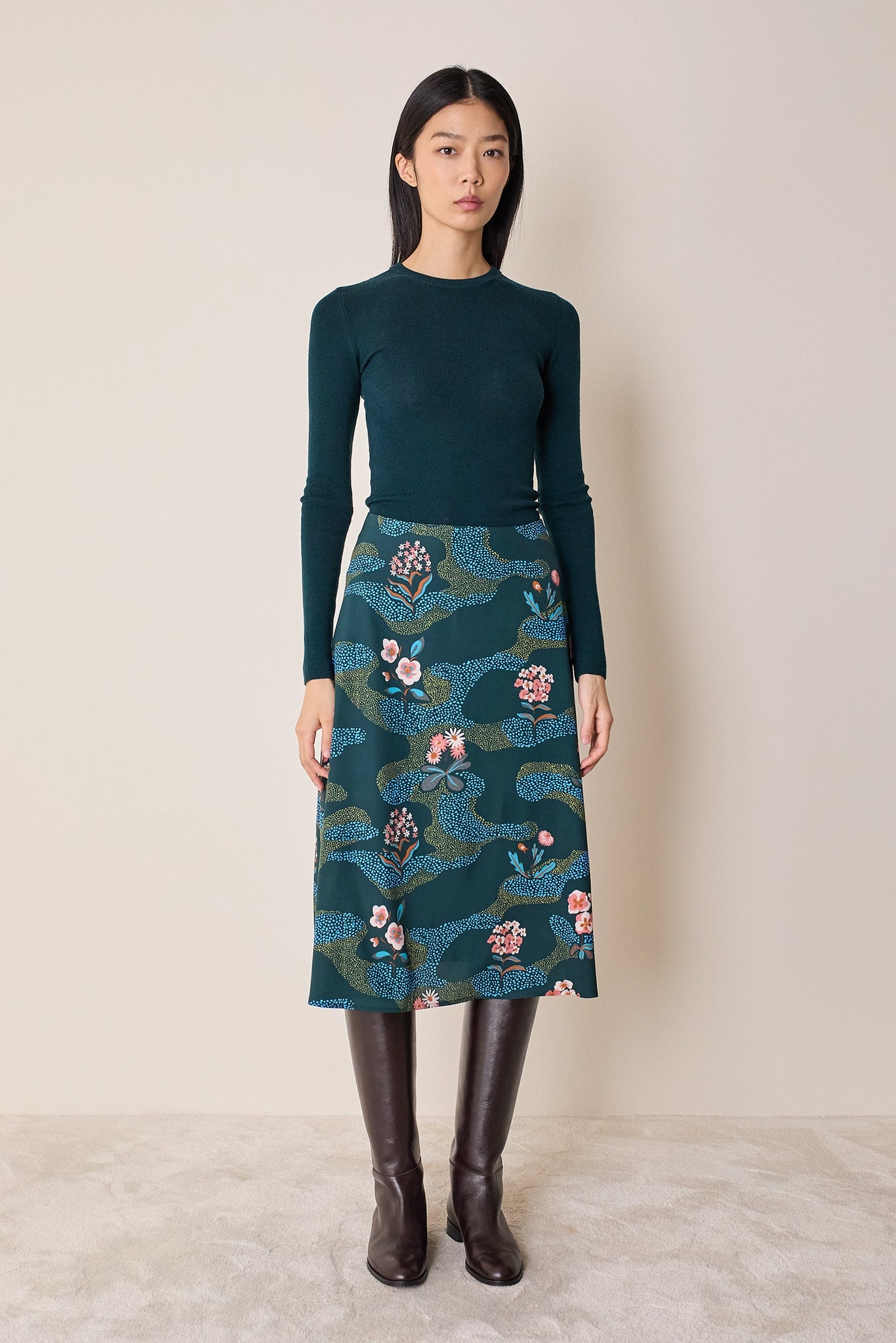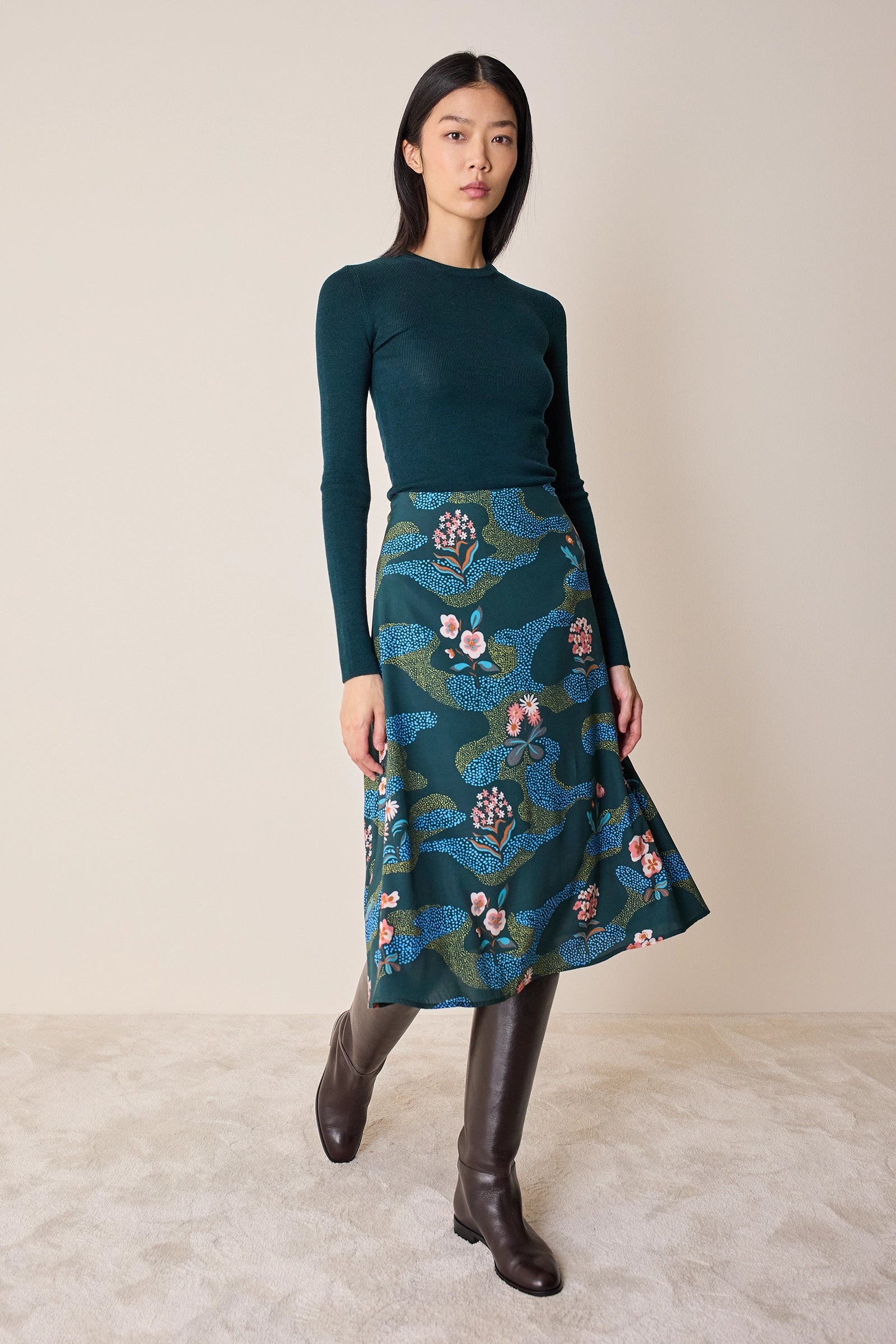 Per questa gonna midi dalla linea svasata abbiamo scelto una preziosa seta leggermente elasticizzata e decorata da una raffinata stampa floreale ispirata ai motivi giapponesi. Femminile e versatile, può essere abbinata a una camicetta o a un maglioncino per un look più casual. Disponibile in fantasia floreale su base blu o verde.