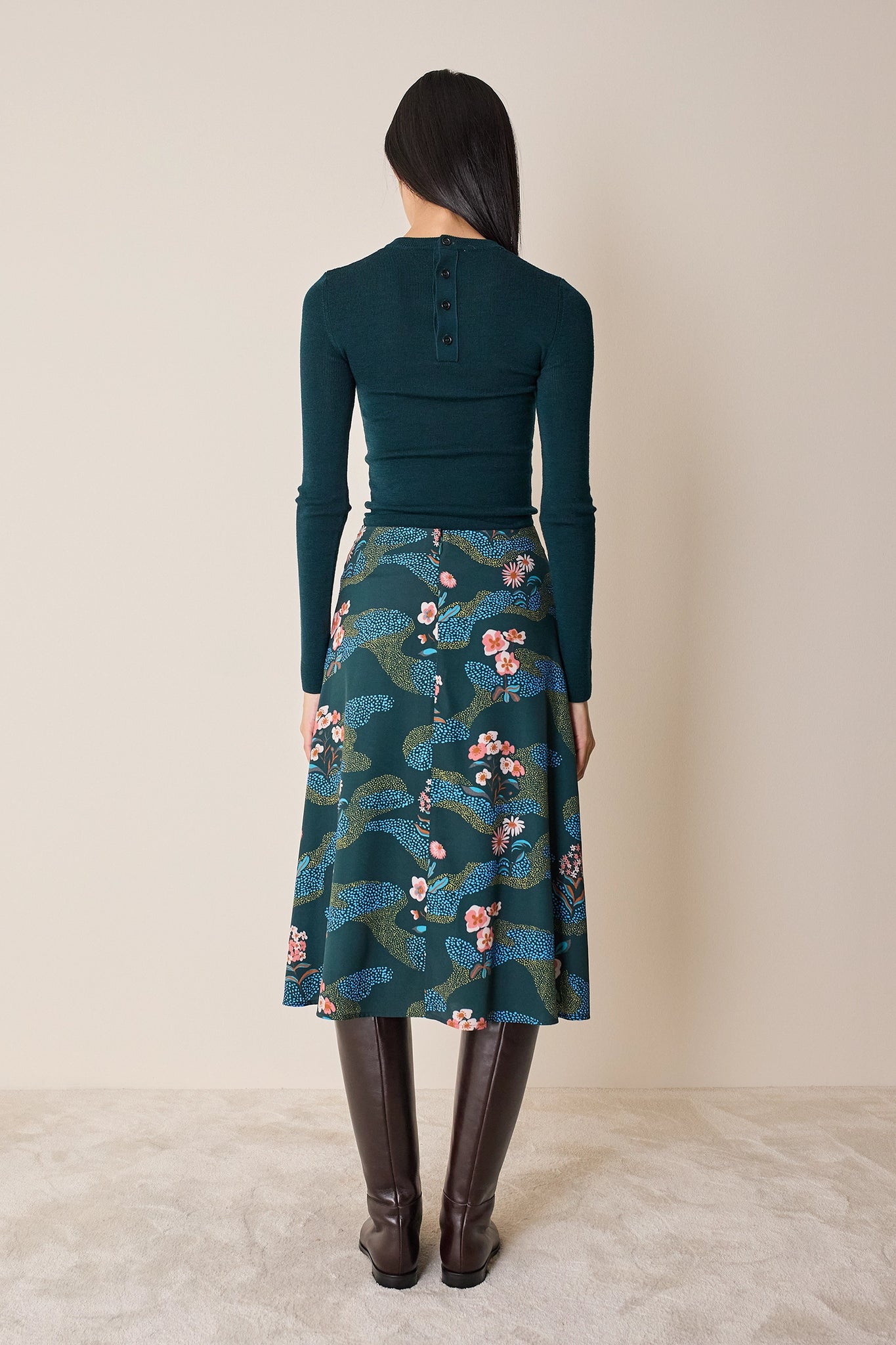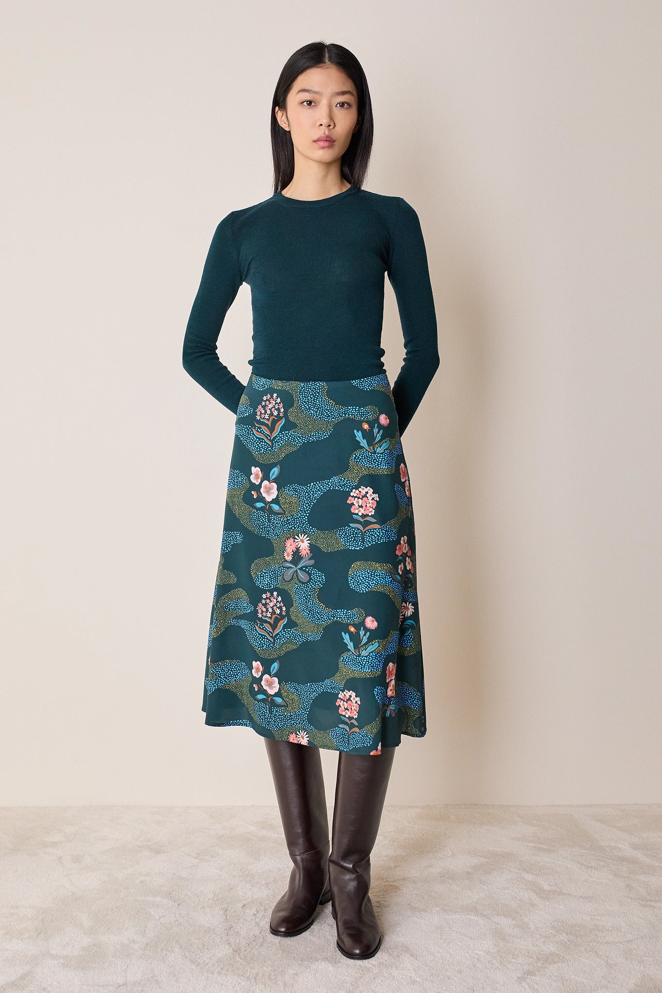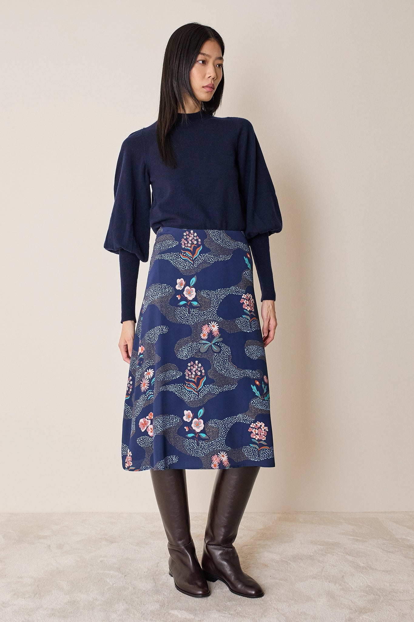 Per questa gonna midi dalla linea svasata abbiamo scelto una preziosa seta leggermente elasticizzata e decorata da una raffinata stampa floreale ispirata ai motivi giapponesi. Femminile e versatile, può essere abbinata a una camicetta o a un maglioncino per un look più casual. Disponibile in fantasia floreale su base blu o verde.