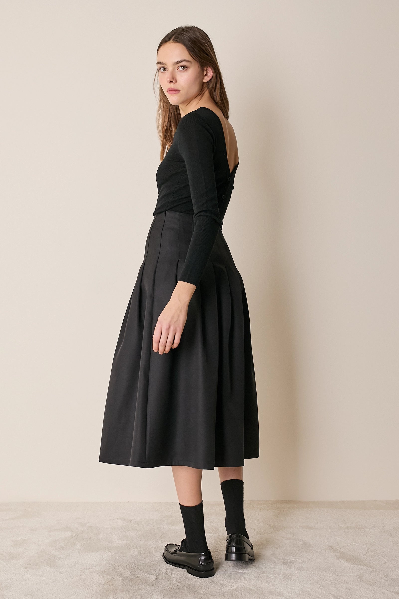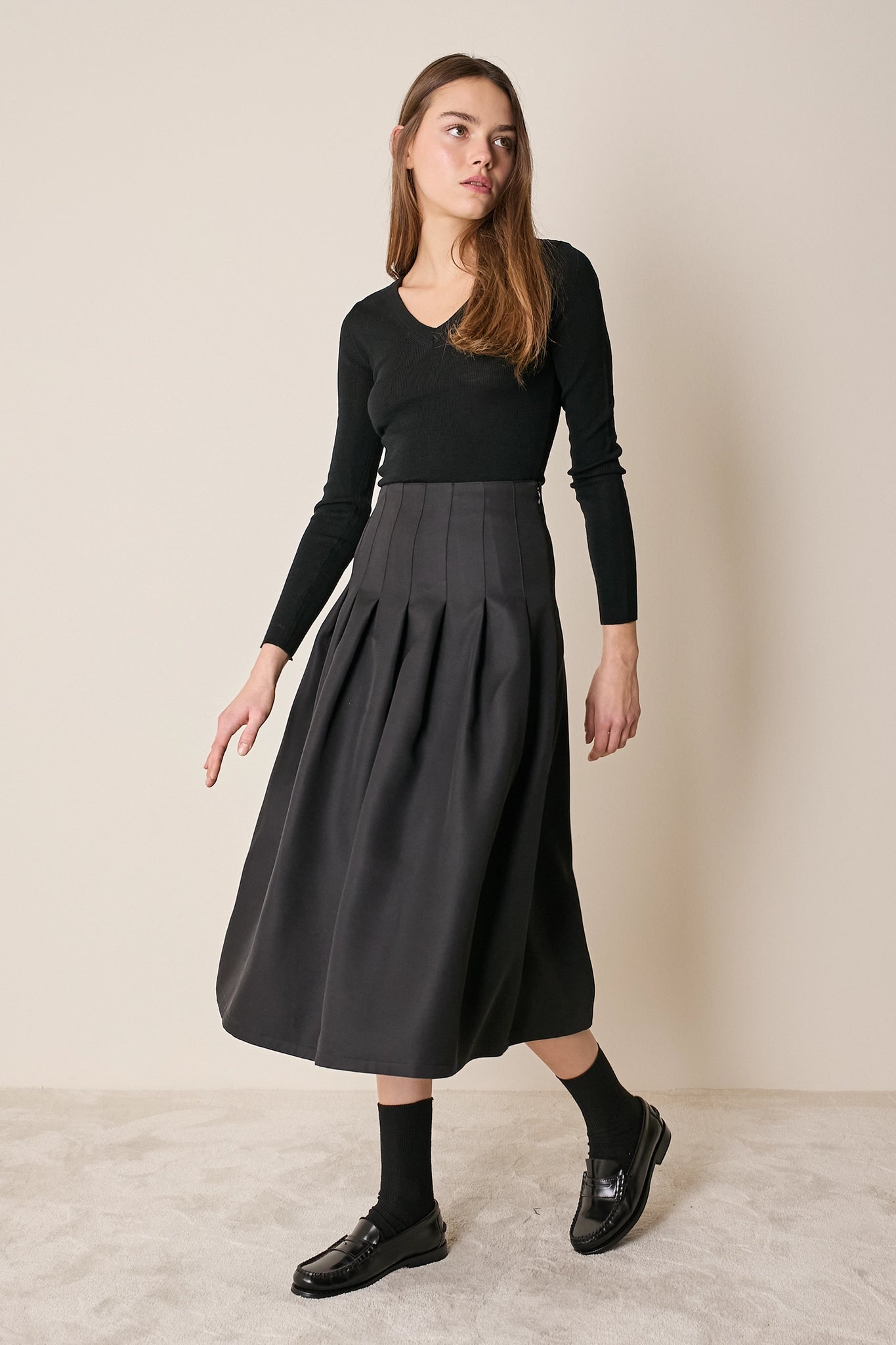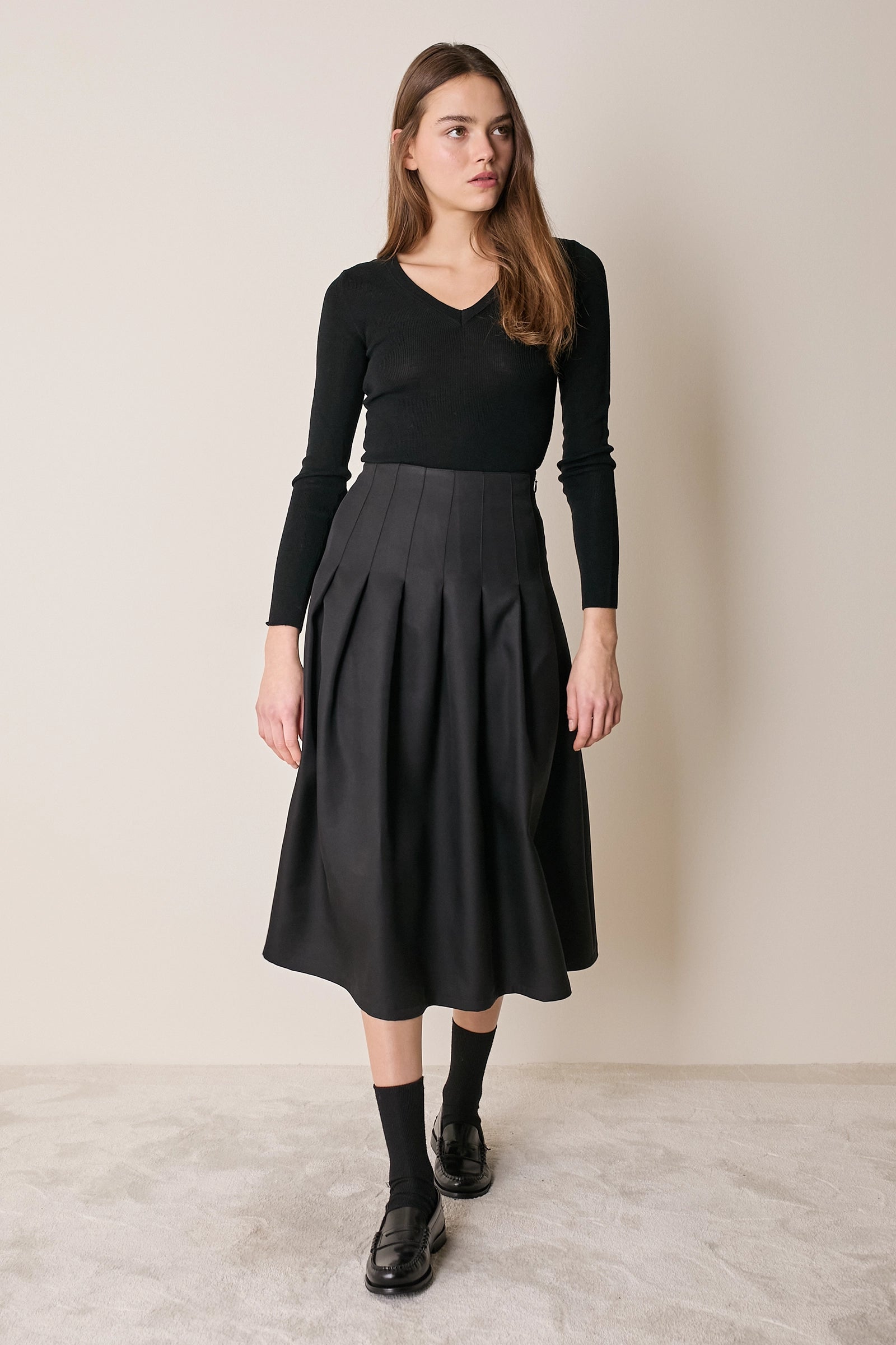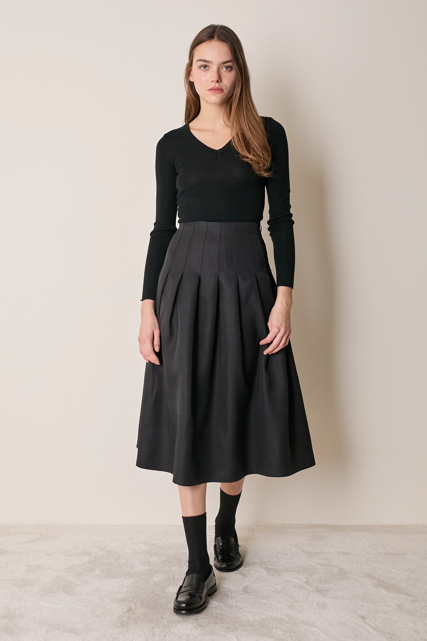 Questa gonna è caratterizzata dal dettaglio delle pieghe a cannoncino che, creando volume, delineano la silhouette a trapezio. Realizzata in un blend di seta luminoso e strutturato, è perfetta per le feste. Disponibile in nero o blu.