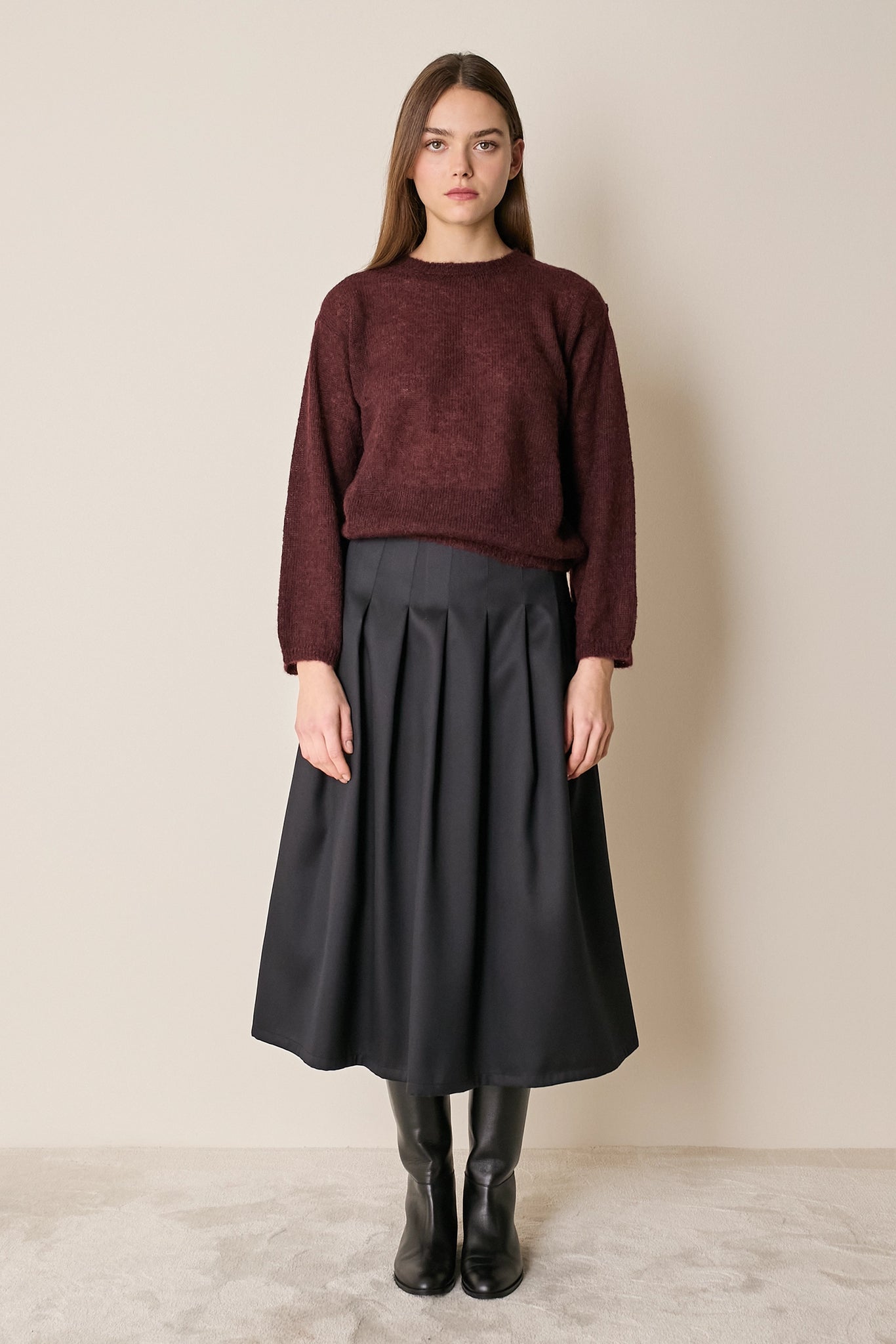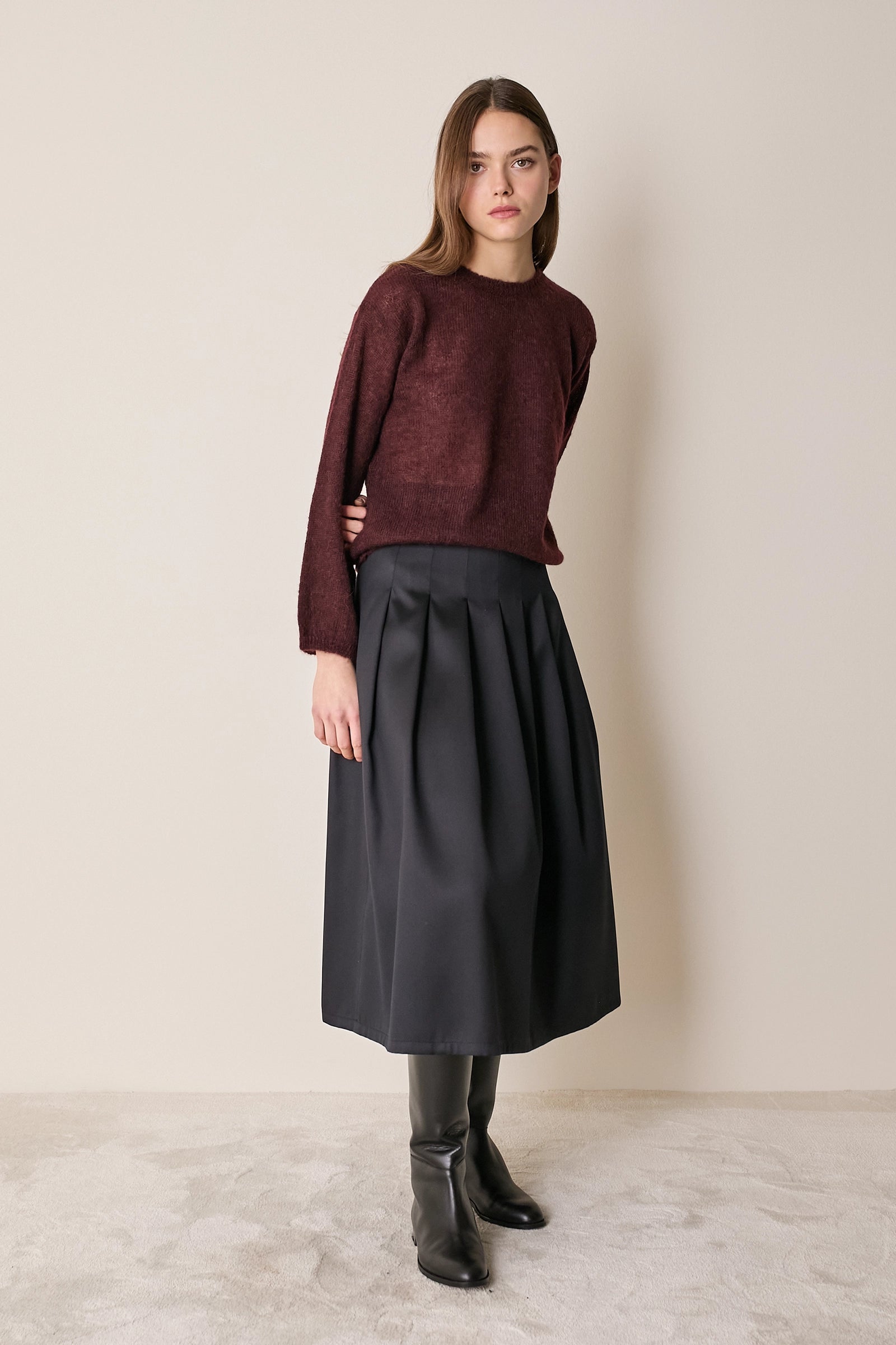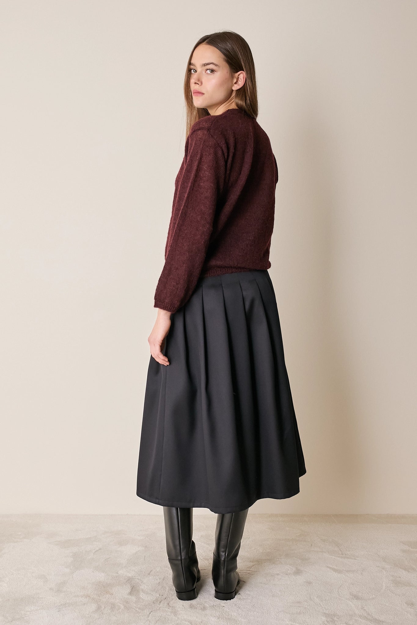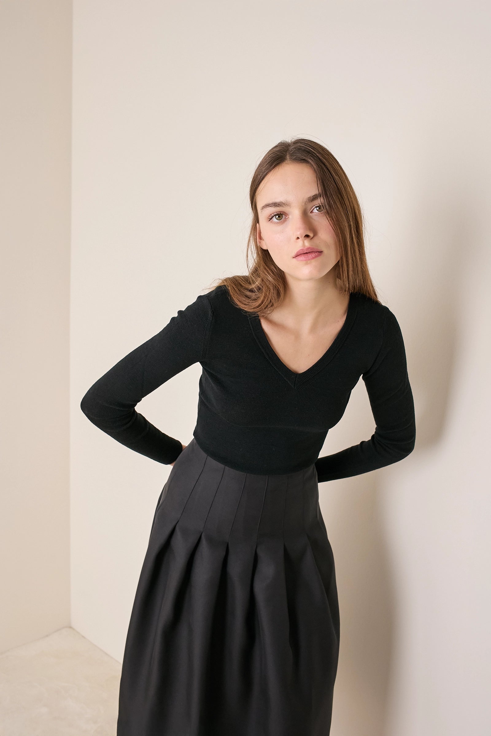 Questa gonna è caratterizzata dal dettaglio delle pieghe a cannoncino che, creando volume, delineano la silhouette a trapezio. Realizzata in un blend di seta luminoso e strutturato, è perfetta per le feste. Disponibile in nero o blu.