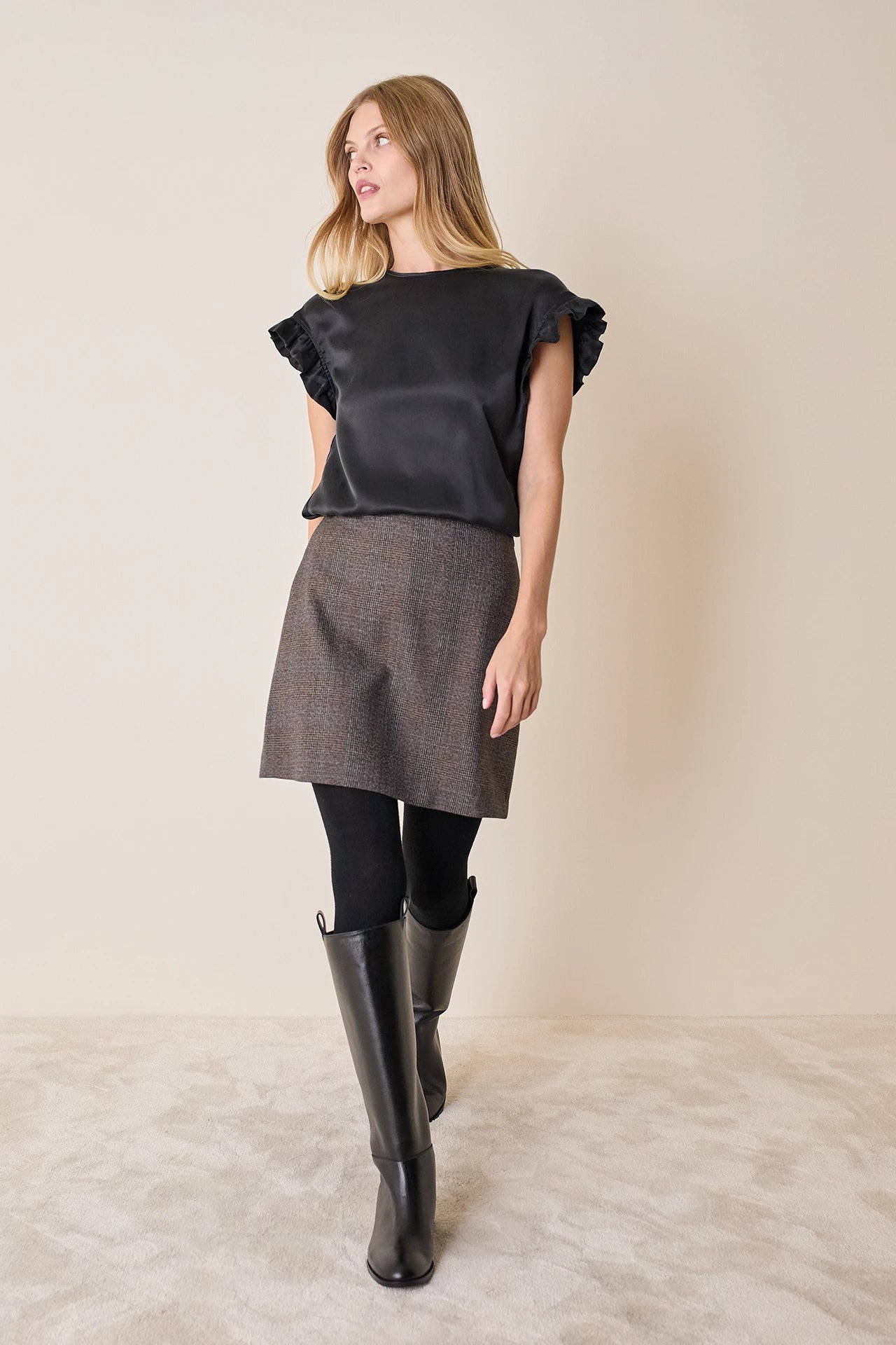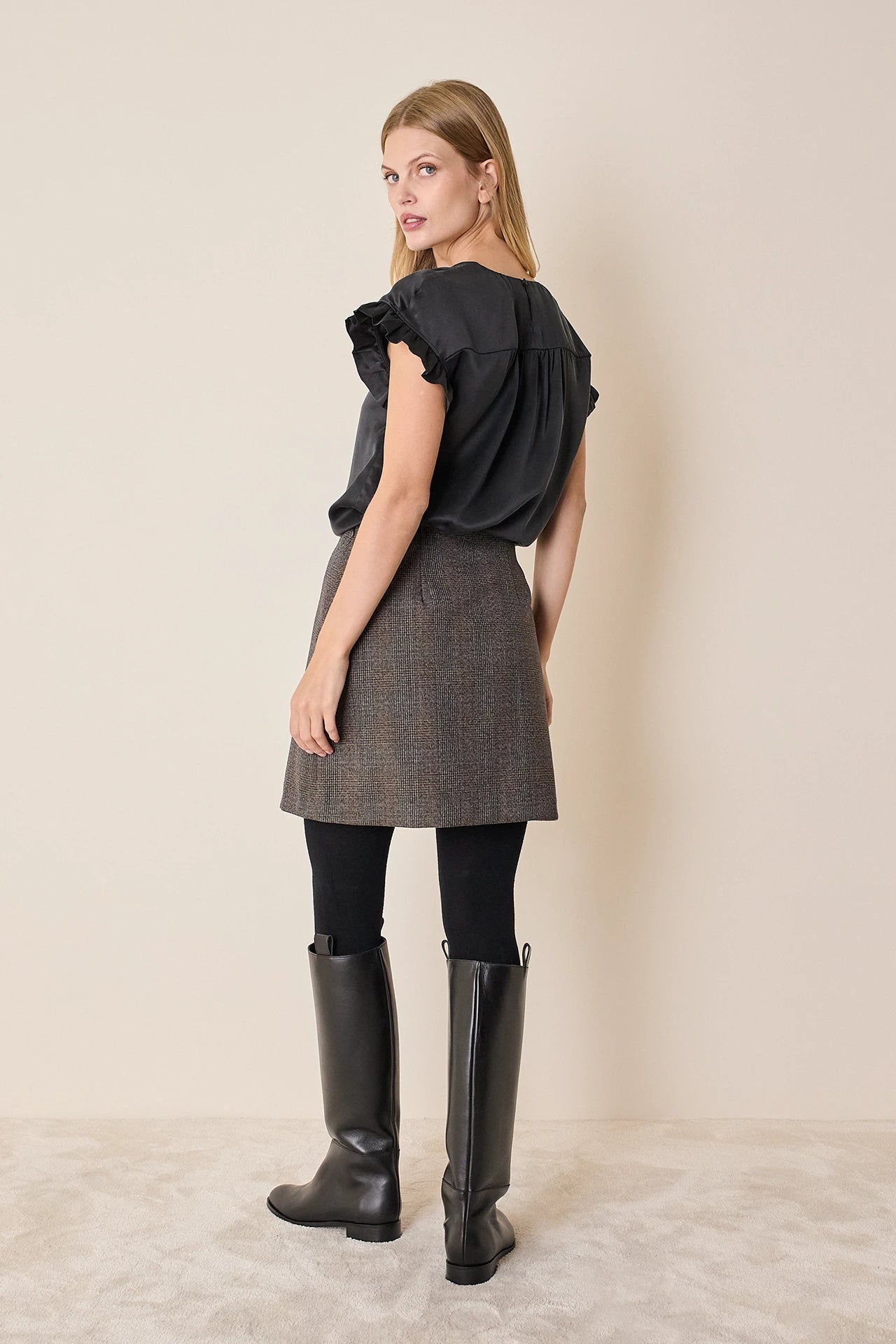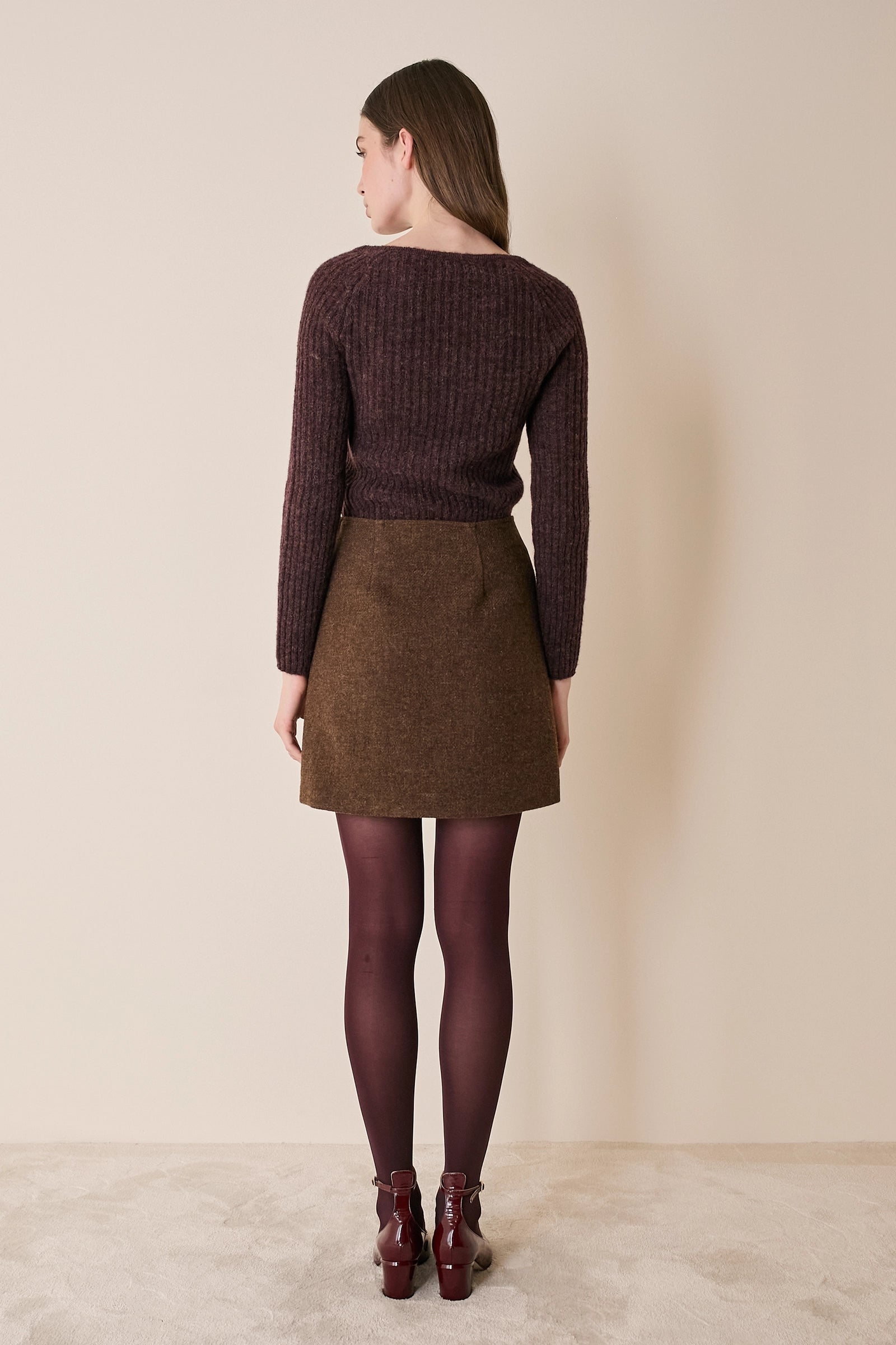 Questa minigonna in lana può essere abbinata al gilet realizzato nello stesso tessuto per creare un completo, ma è perfetta anche con una camicia o un maglioncino oversize. Disponibile in nero, marrone o in fantasia Principe di Galles marrone.