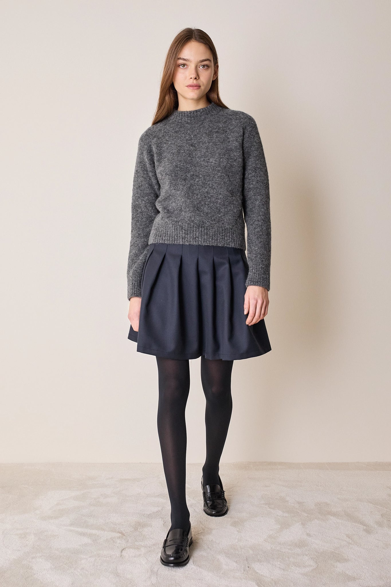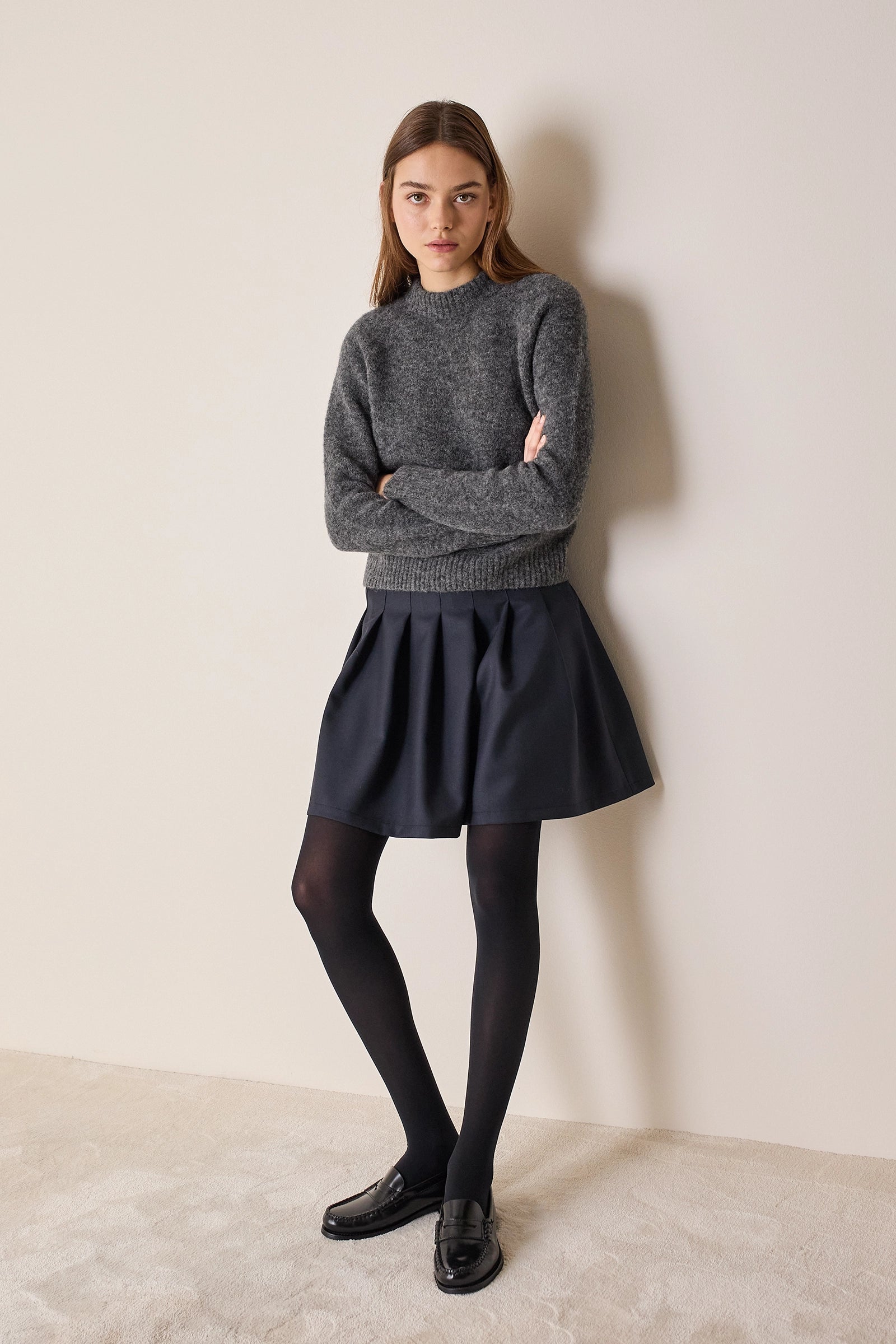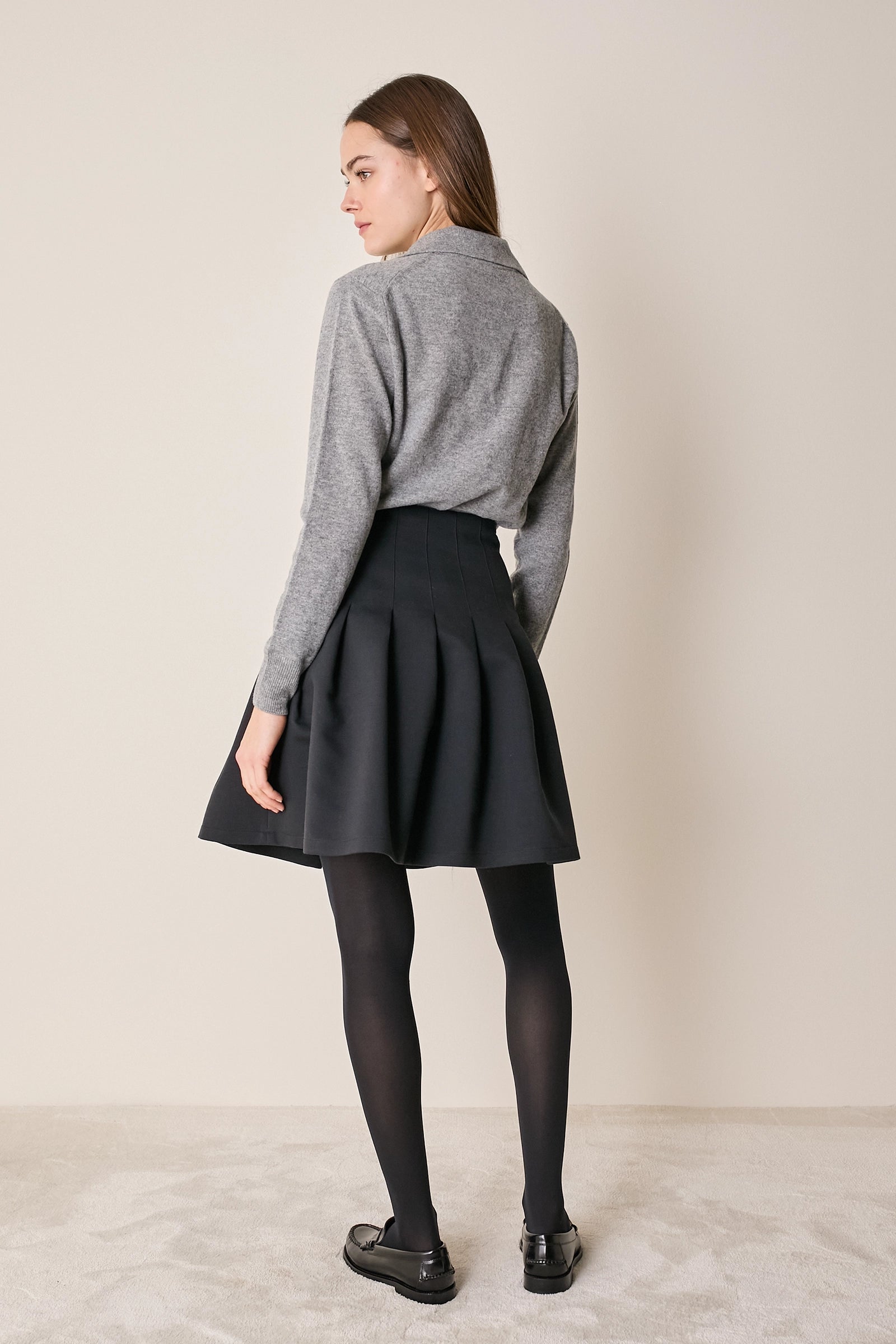 Questa gonna di ispirazione college è caratterizzata da una baschina che definisce la figura e pieghe a cannoncino che, aggiungendo volume, creano una silhouette a trapezio. Disponibile in nero o blu.