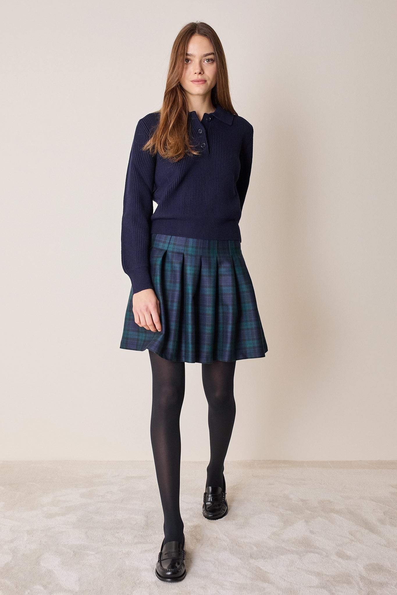 Questa gonna di ispirazione college è caratterizzata da una baschina che definisce la figura e pieghe a cannoncino che, aggiungendo volume, creano una silhouette a trapezio. Realizzata in pura lana vergine, è disponibile in tartan blu e verde.