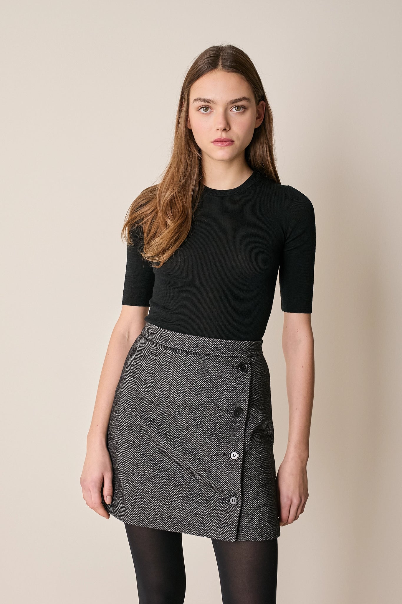 Questa minigonna è caratterizzata da una finta abbottonatura laterale.