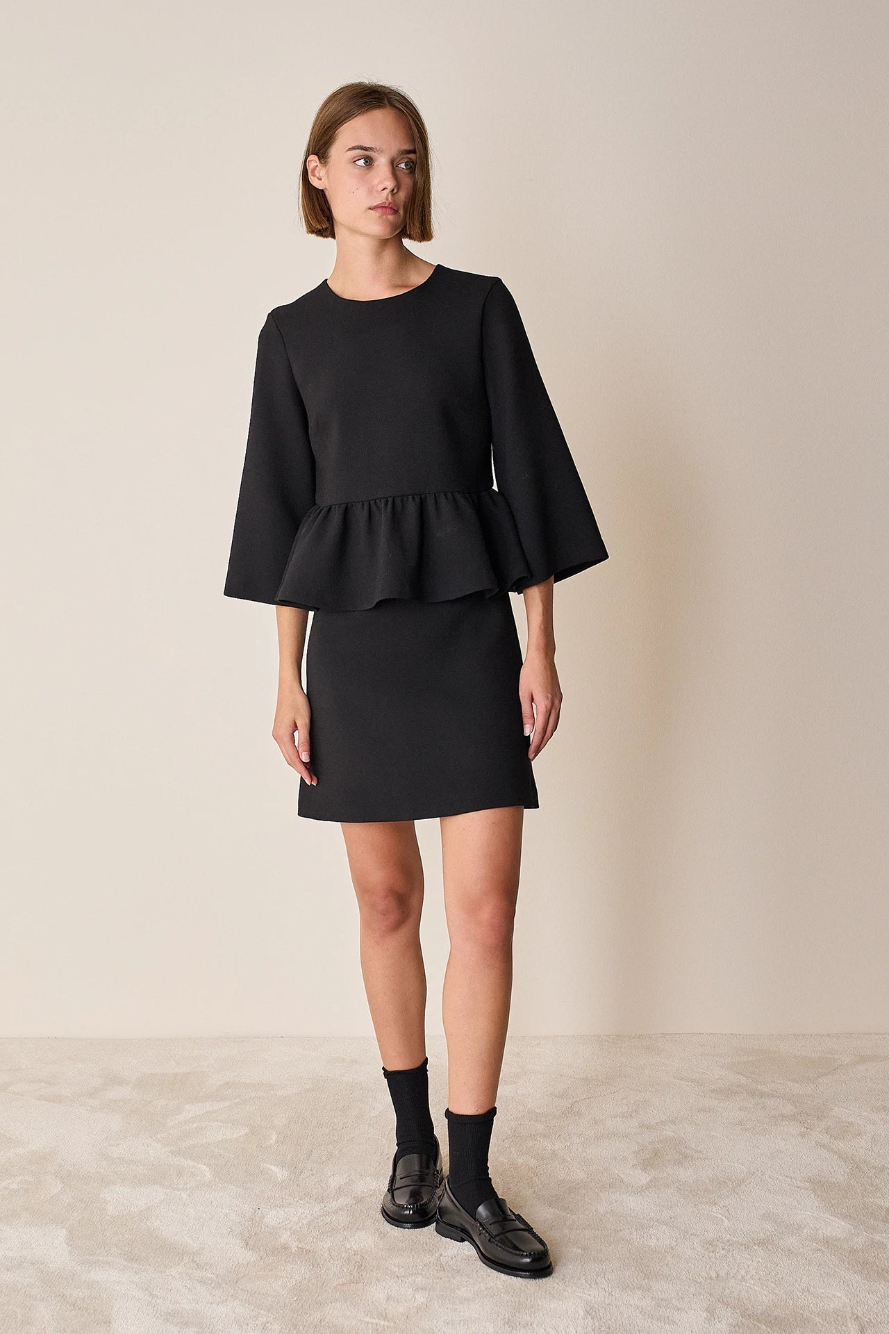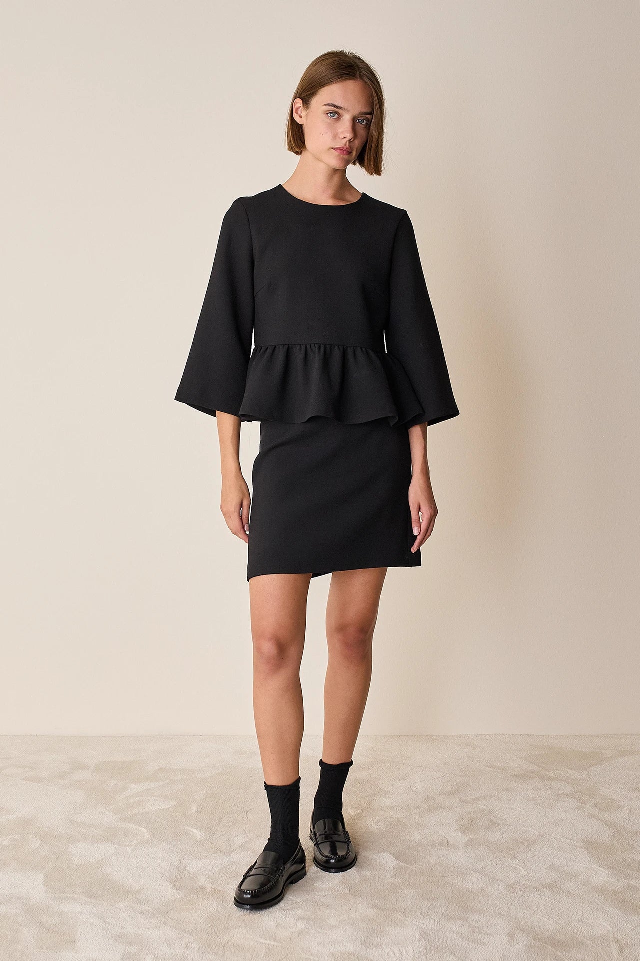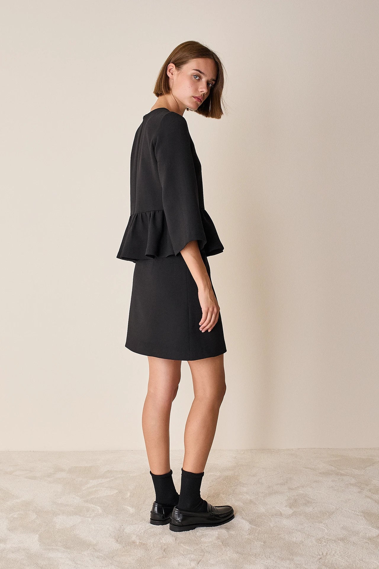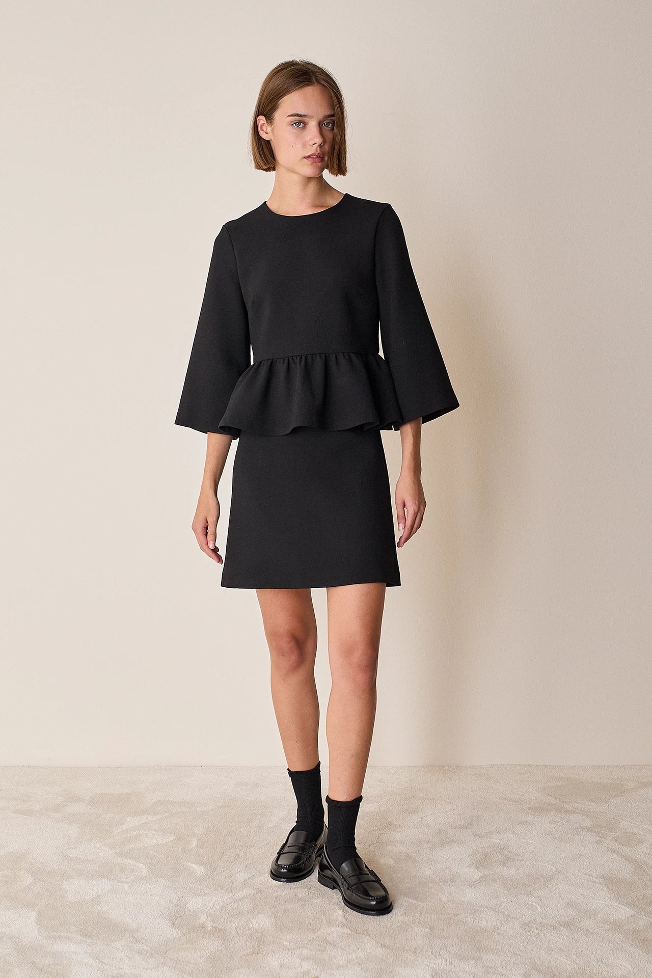 Questa minigonna in lana elasticizzata può essere abbinata al top con balza realizzato nello stesso tessuto, o essere indossata con una camicia o un maglioncino over. Disponibile in nero.