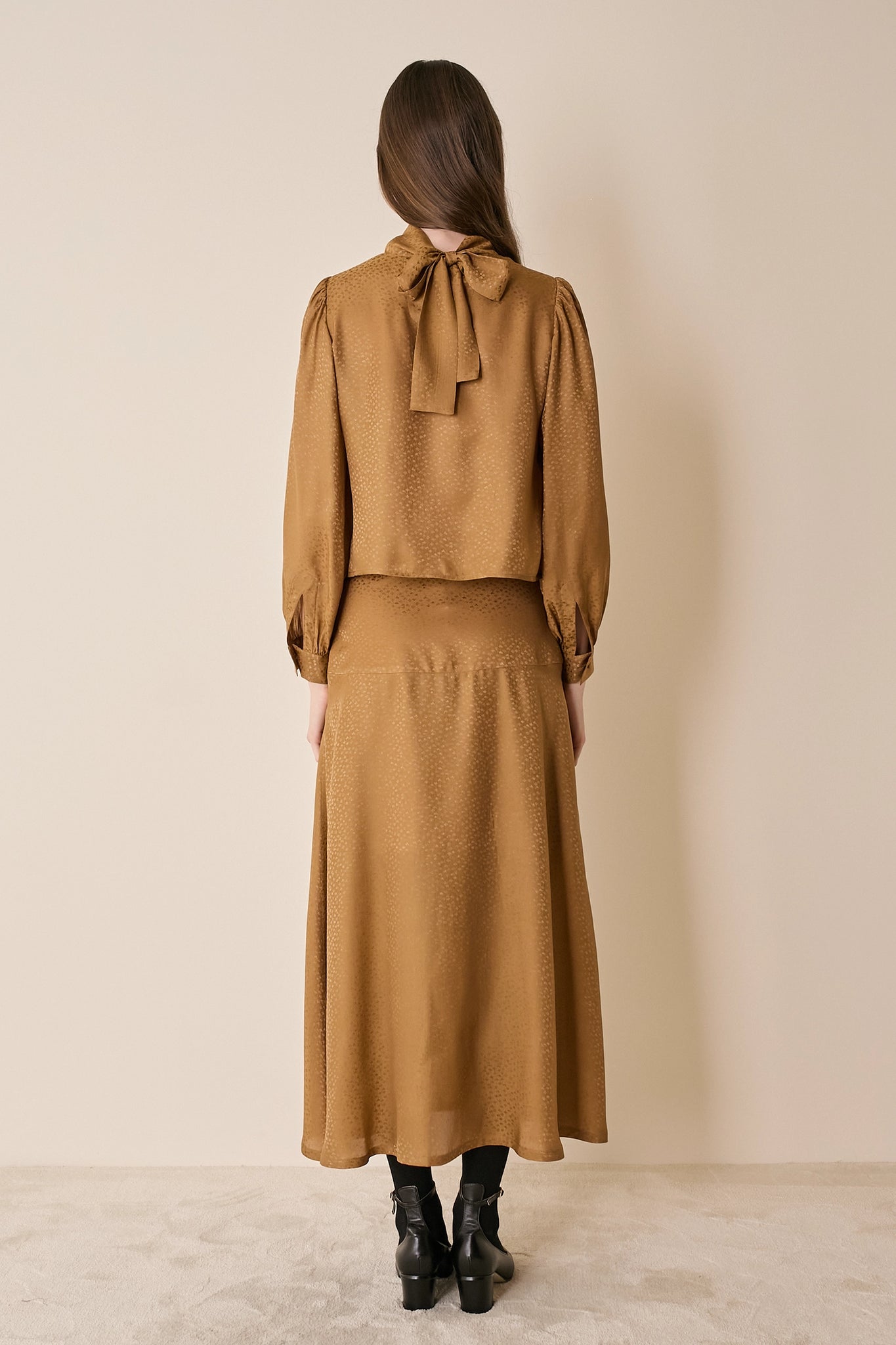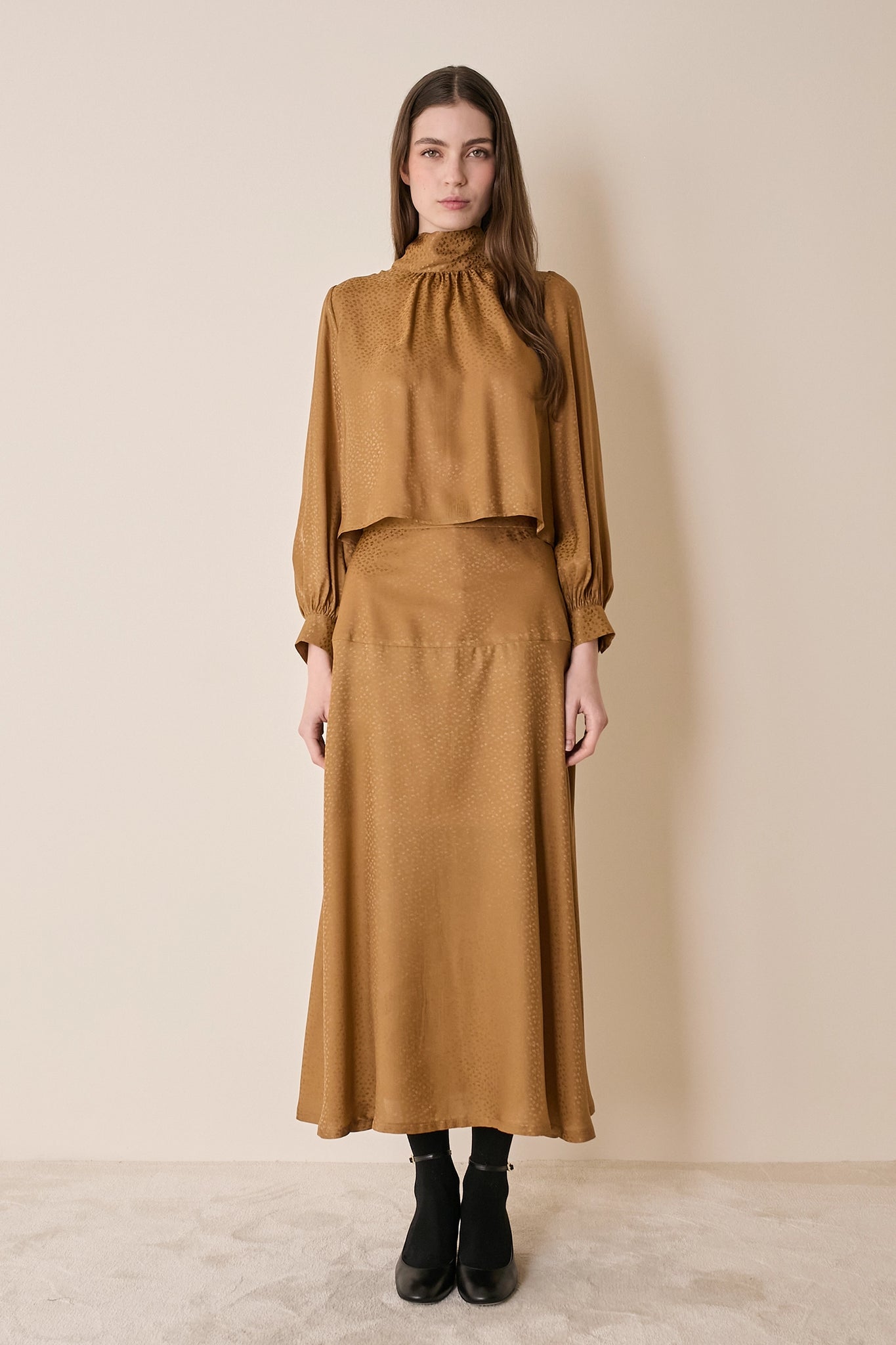 Per questa gonna lunga, disegnata sia per l'ufficio che per le vacanze, abbiamo scelto un blend di seta fluido e luminoso. Caratterizzata da una baschina che definisce il punto vita è disponibile in tessuto tessuto jacquard senape o bordeaux.