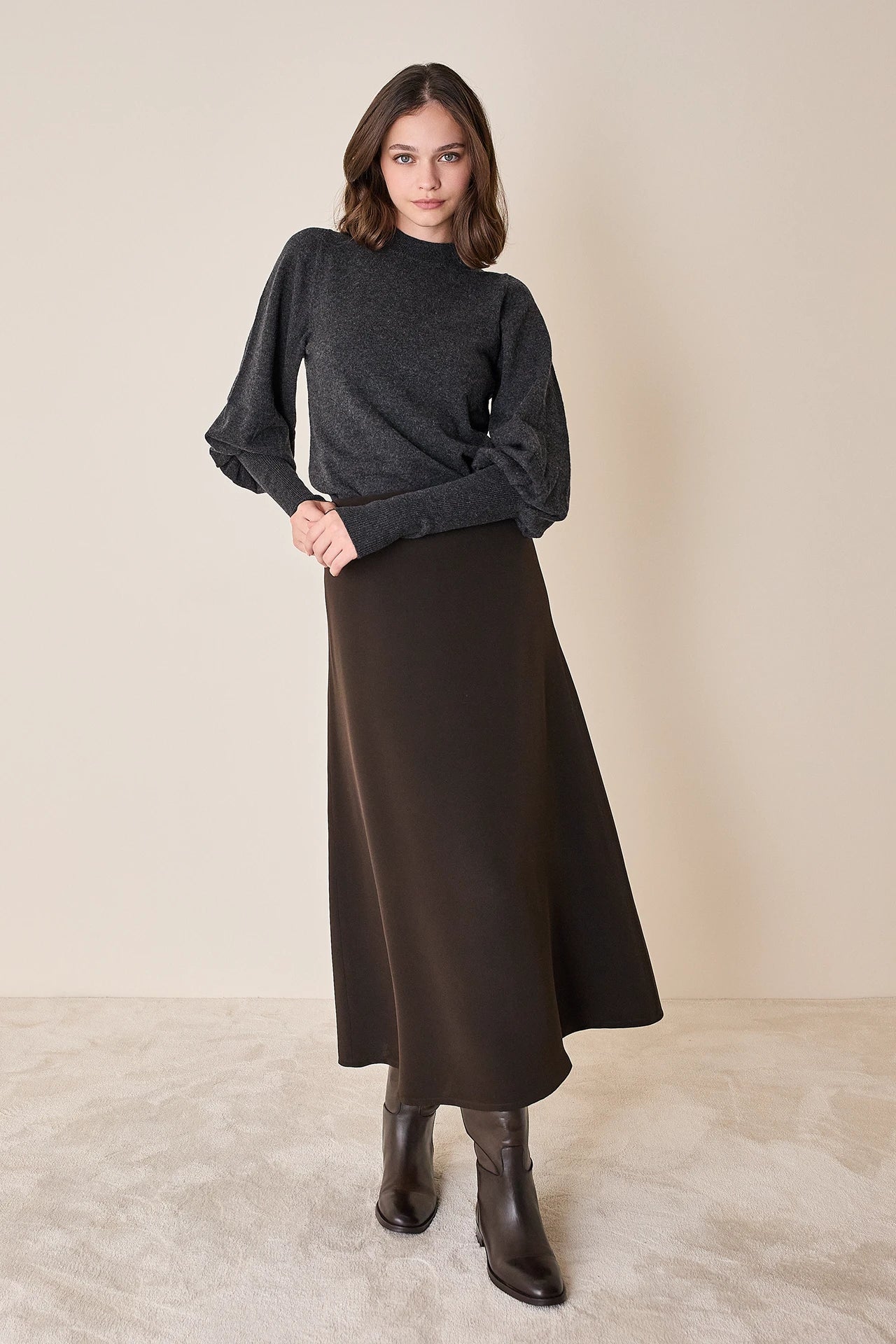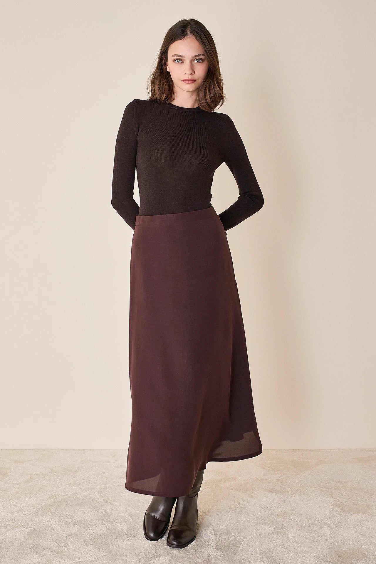 Le possibilità di styling di questa gonna lunga in seta sono infinite. Indossala con un maglioncino aderente o con una camicia over. Rendila più casual con un girocollo oversize in lana, oppure più elegante con una blusa in seta. Provala con gli stivali, con le sneakers, con un paio di Mary Jane alte o con le tue ballerine preferite – si abbina davvero a tutto! Disponibile in melanzana o cioccolato.