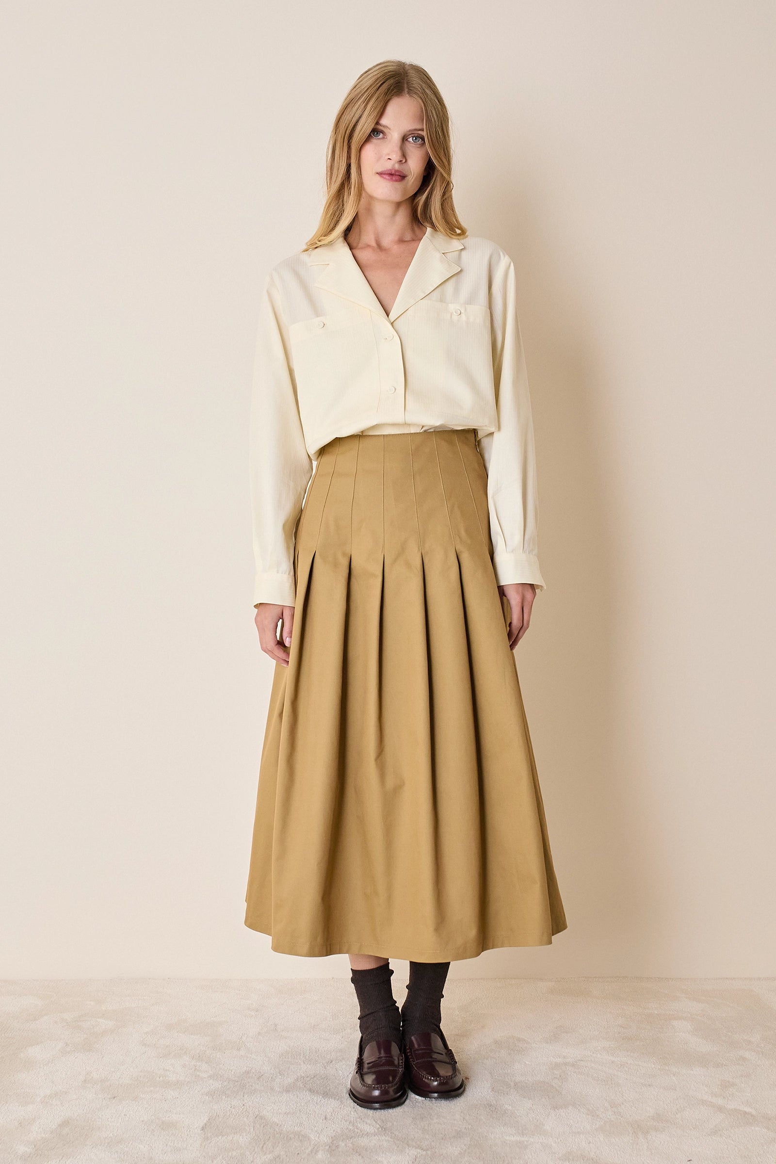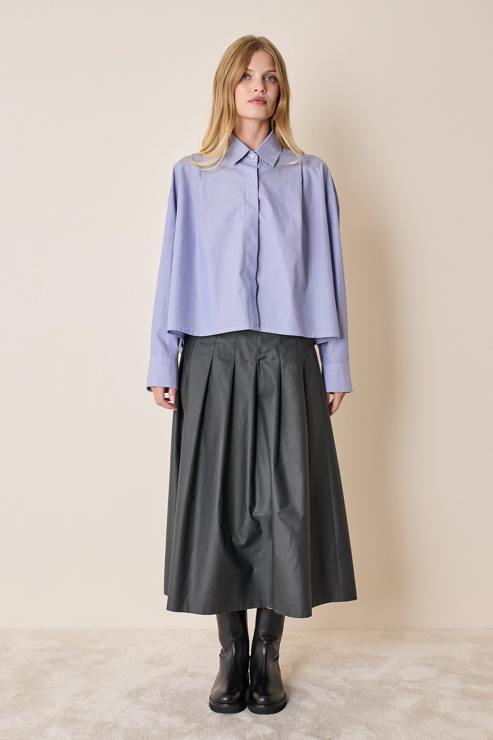 Questa gonna è caratterizzata dal dettaglio delle pieghe a cannoncino che, creando volume, delineano la silhouette a trapezio. Realizzata in cotone, è disponibile in beige, grigio antracite o blu notte.