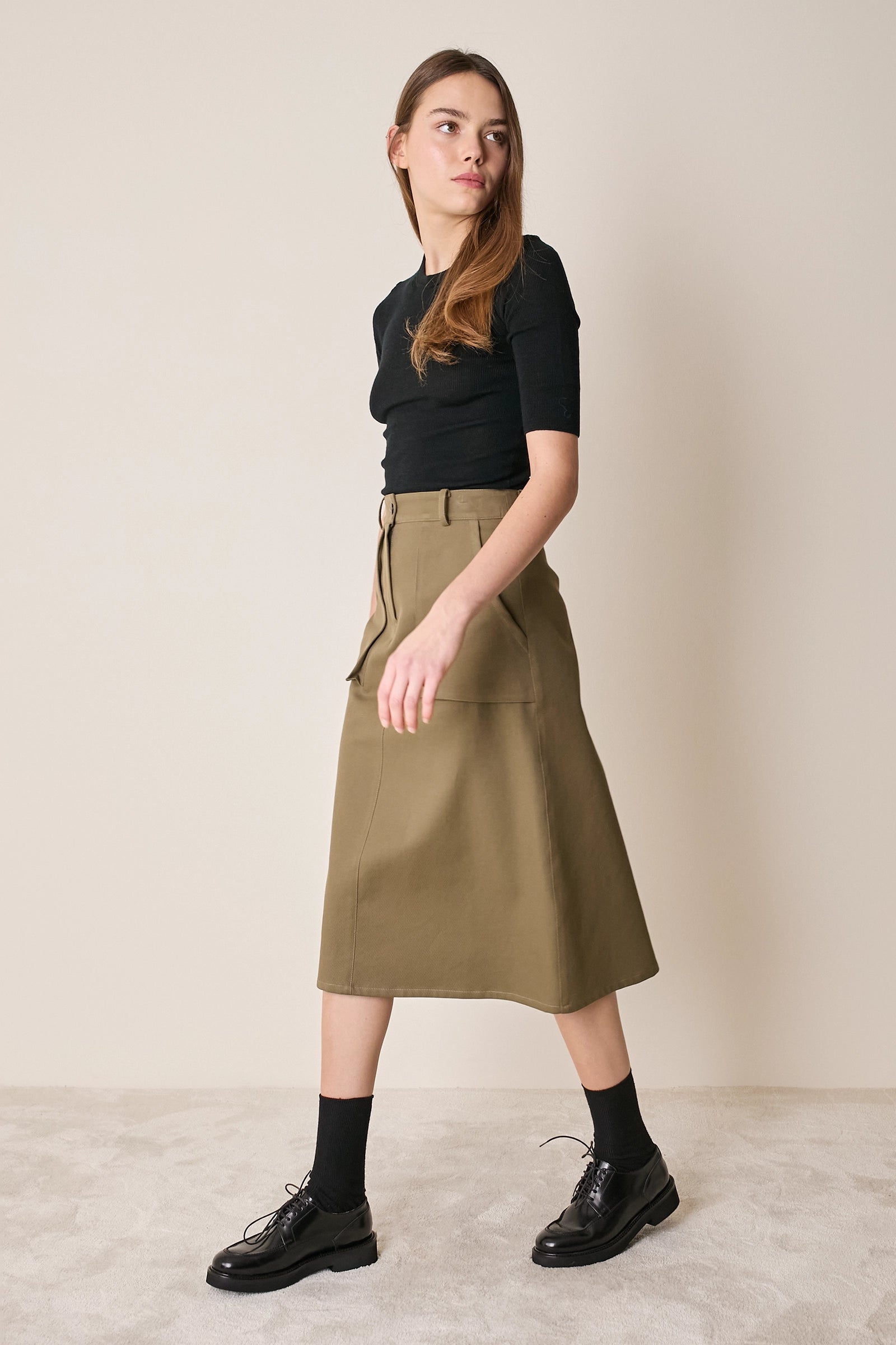 Questa gonna midi è caratterizzata dal dettaglio delle tasche applicate. Sportiva e versatile, è perfetta sia con un maglione girocollo che con una camicia o t-shirt a maniche lunghe. Disponibile in beige