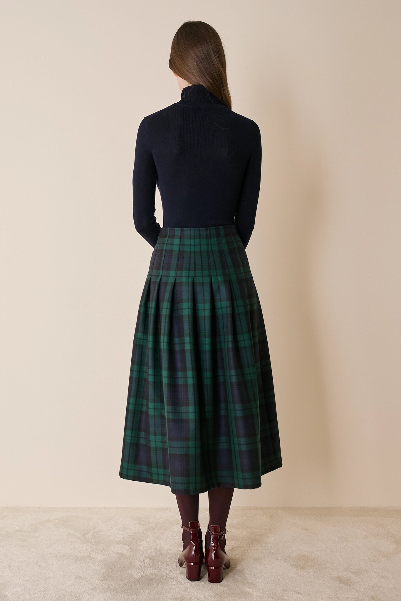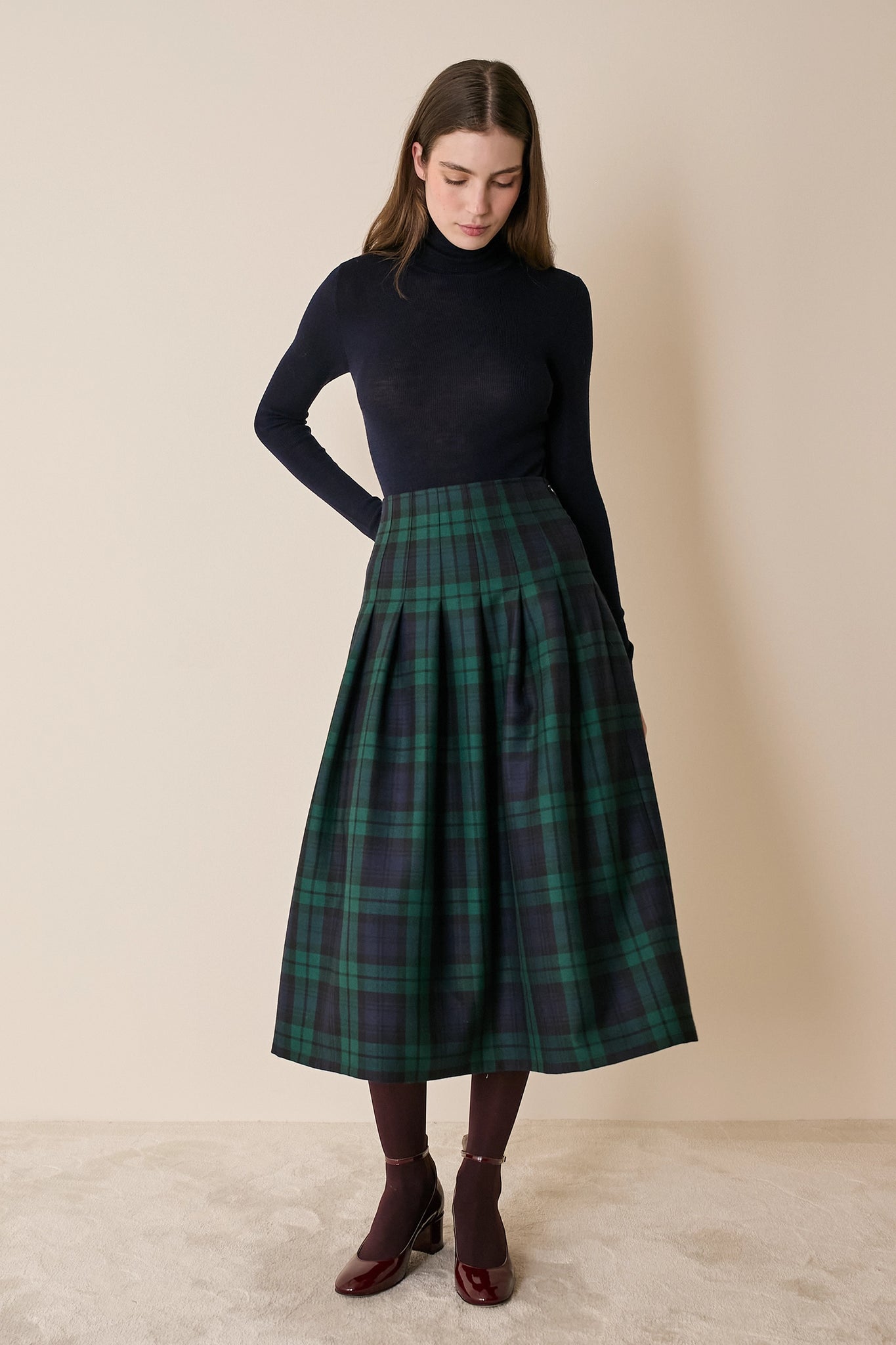 Questa gonna college a maxi pieghe sarà una preziosa alleata per tutto l'inverno. Puoi indossarla con un maglioncino e un paio di mary jane, ma anche con una camicia e degli stivali in pelle. Disponibile in tartan blu e verde.
