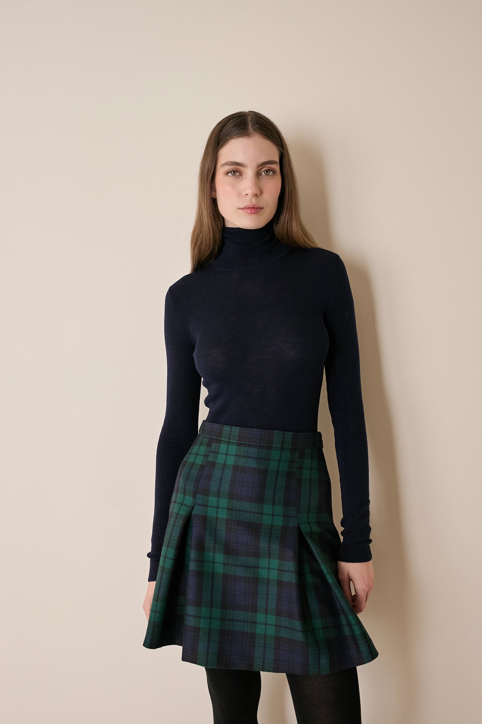 Questa gonna di ispirazione college è caratterizzata dal dettaglio delle pieghe a cannoncino che, creando volume, delineano la silhouette a trapezio. Perfetta sia per l'ufficio che per le feste, è disponibile in tartan blu e verde.