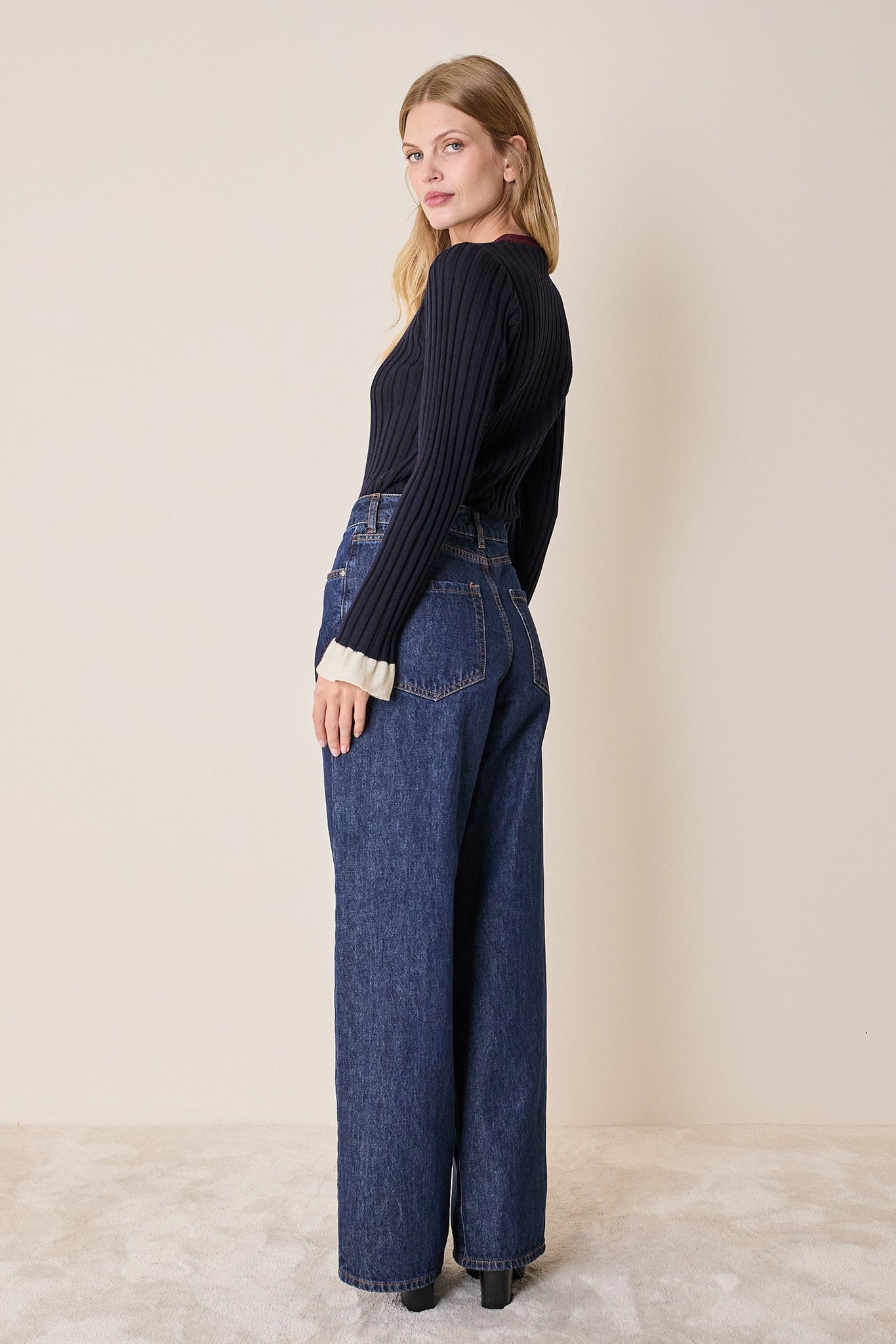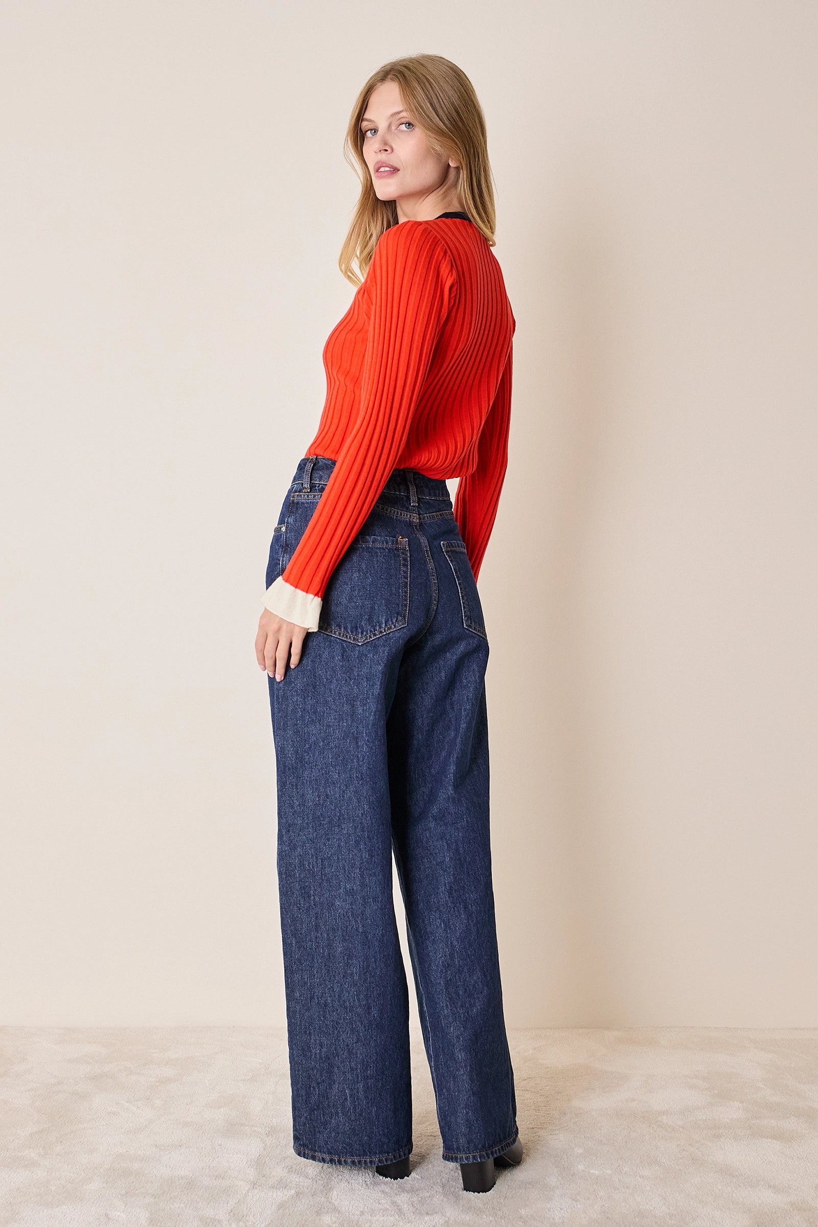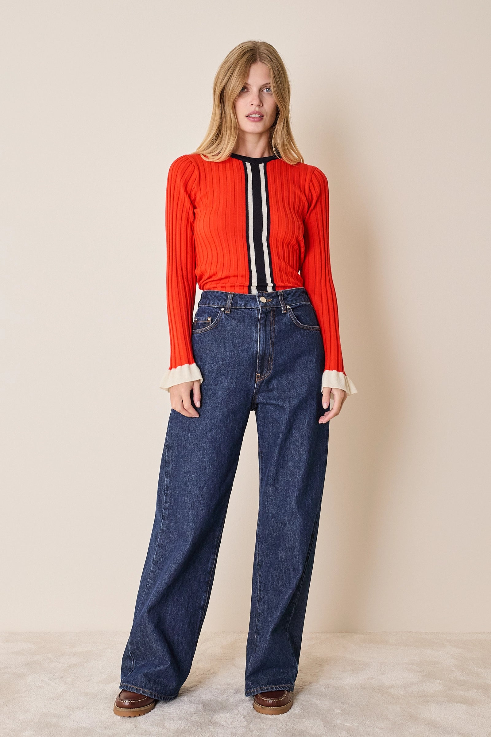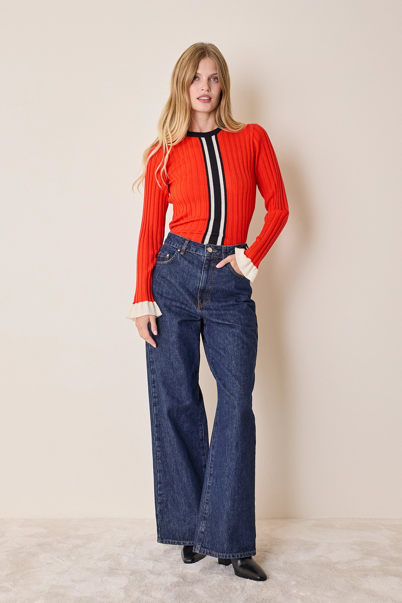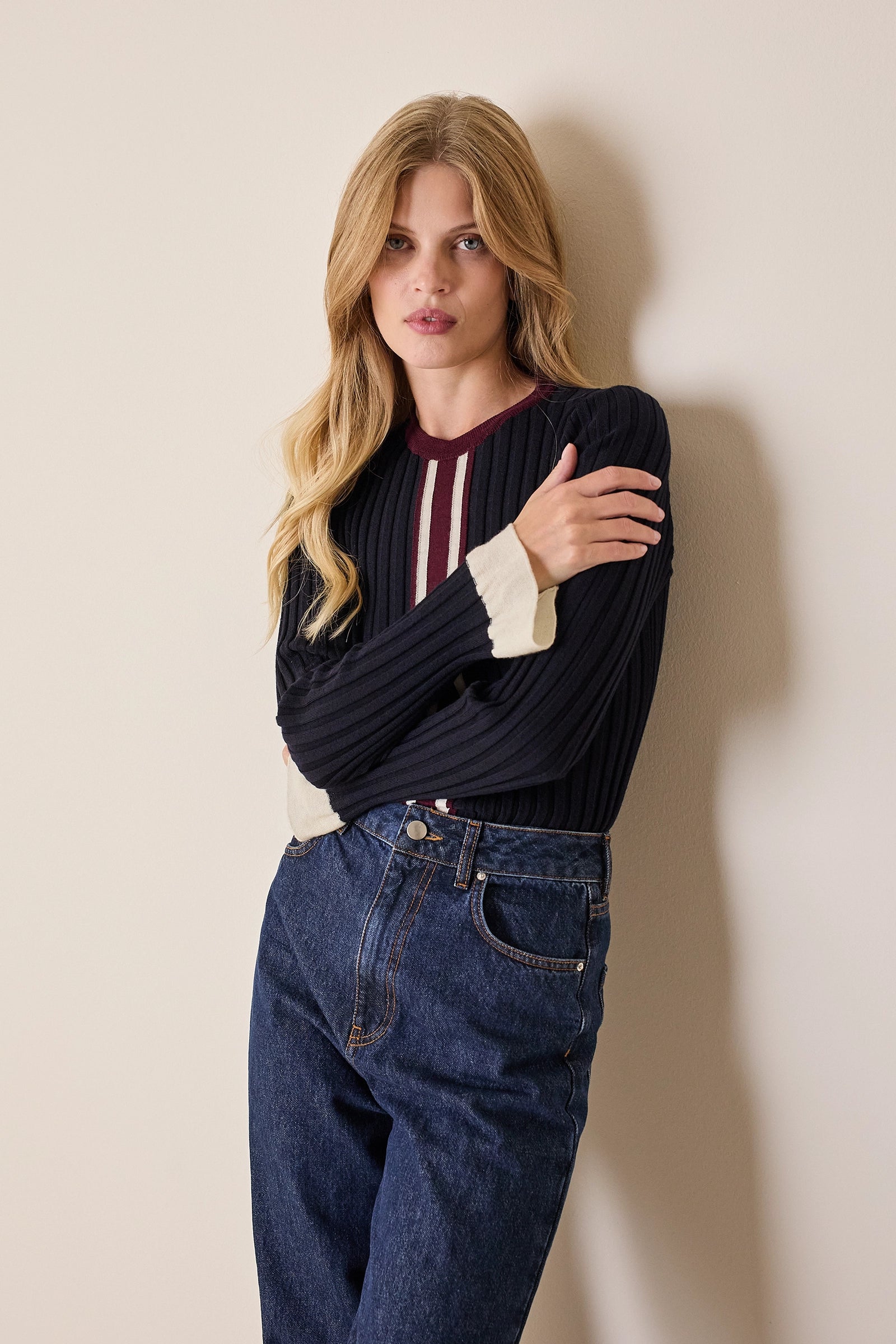 Questa maglia in lana merino è definita da un motivo geometrico a contrasto che la rende protagonista di ogni outfit. Disponibile in rosso o blu.