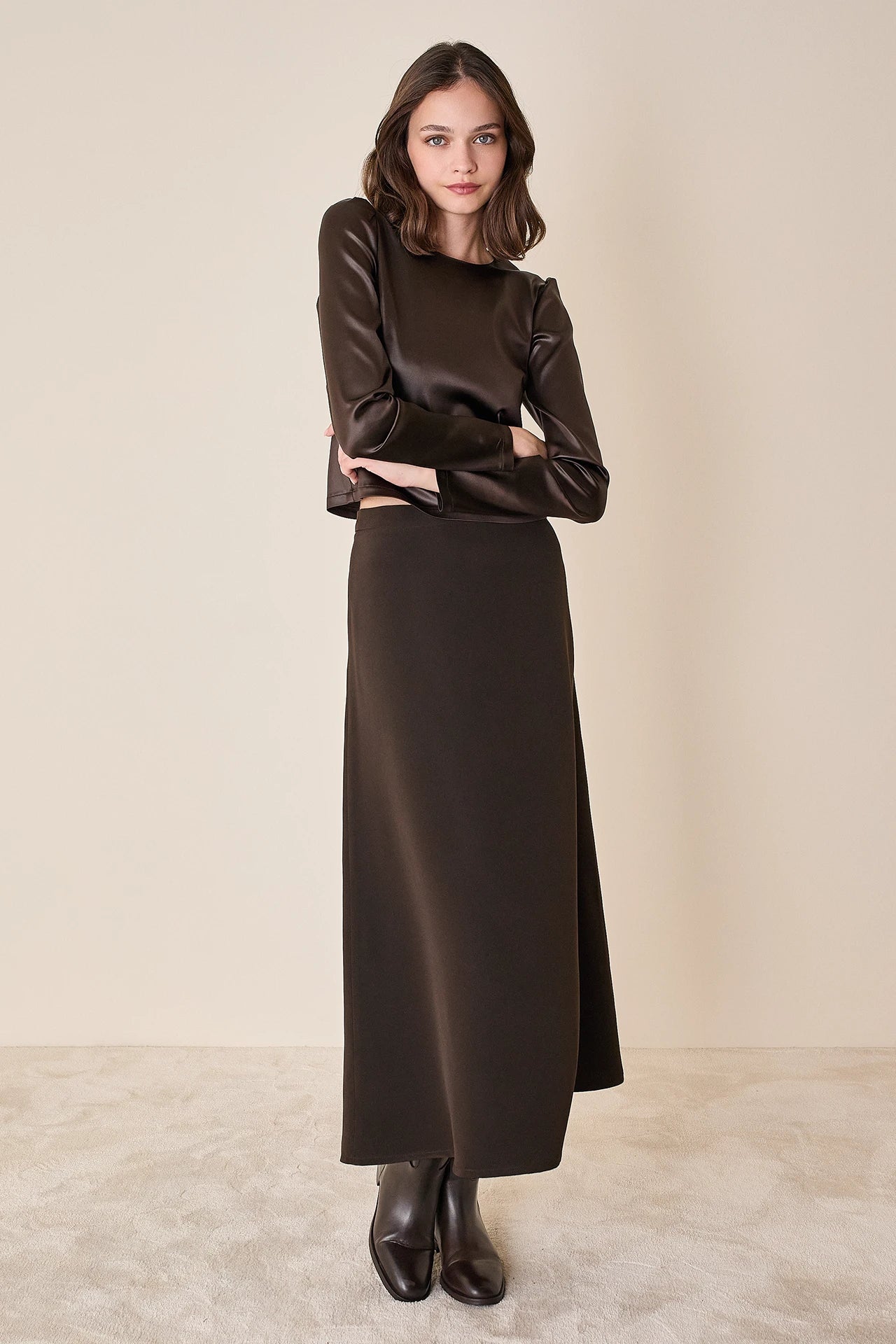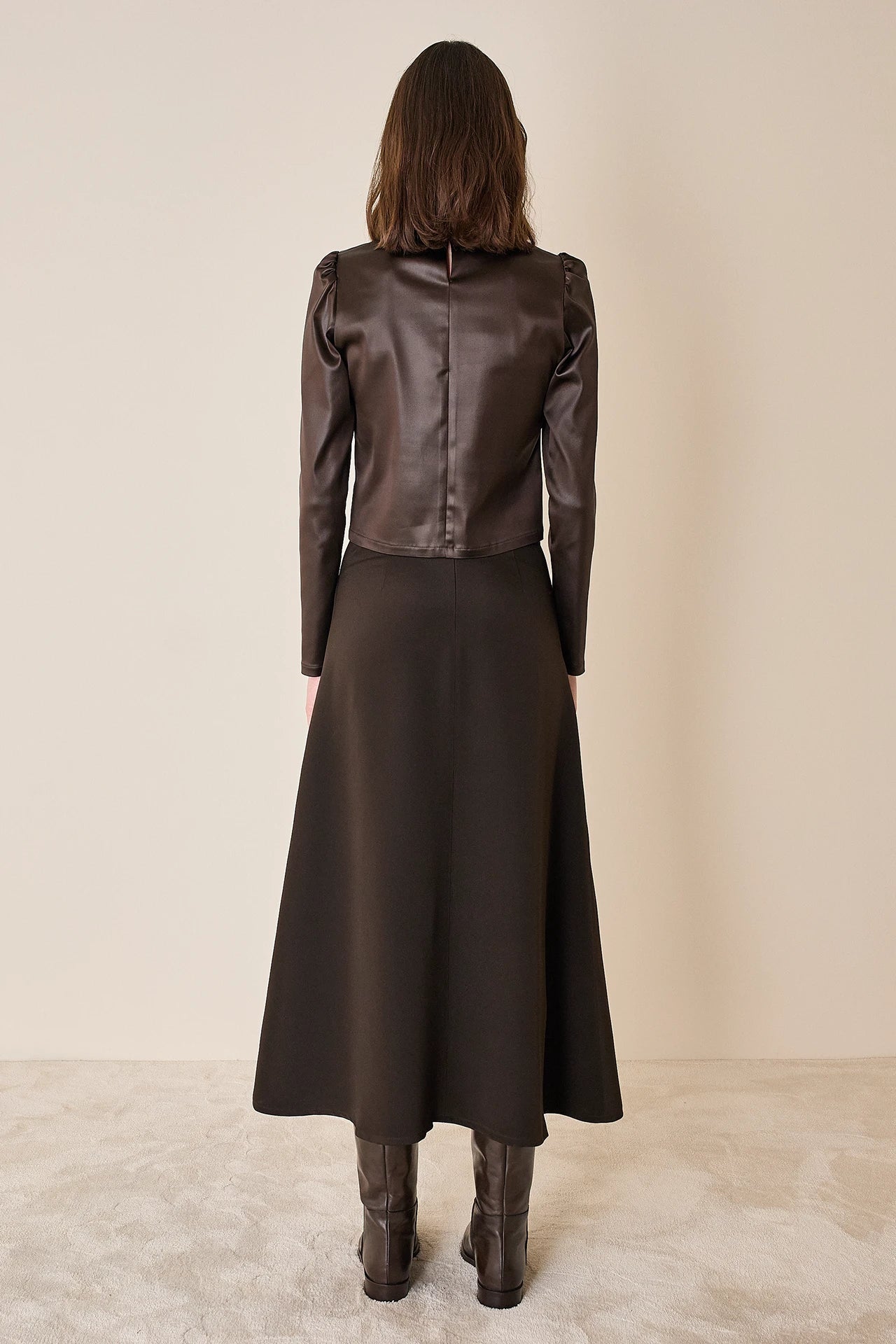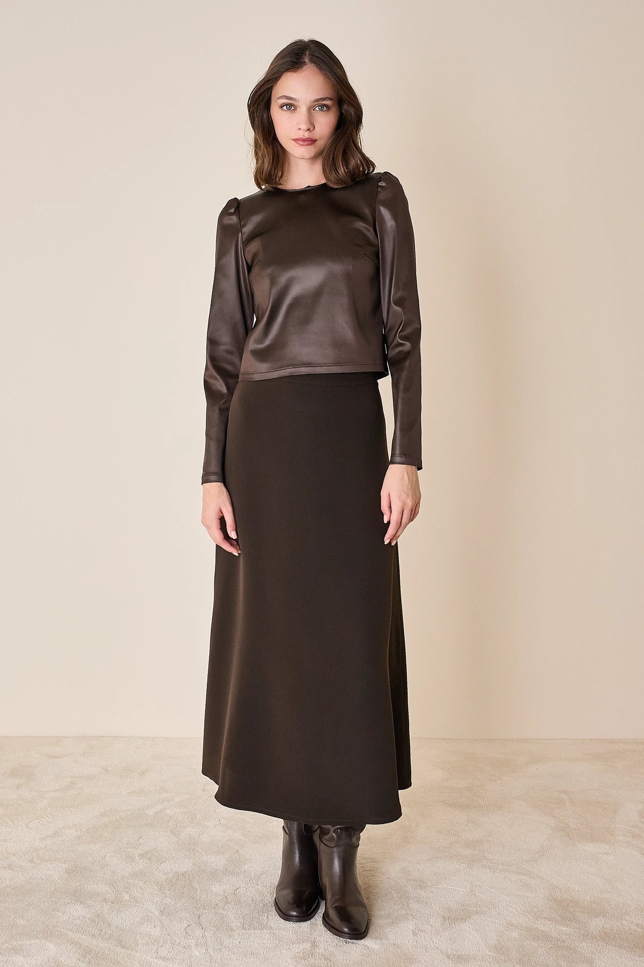Per questo top abbiamo scelto un tessuto luminoso effetto pelle. Perfetto da solo o come sottogiacca, è disponibile in cioccolato.