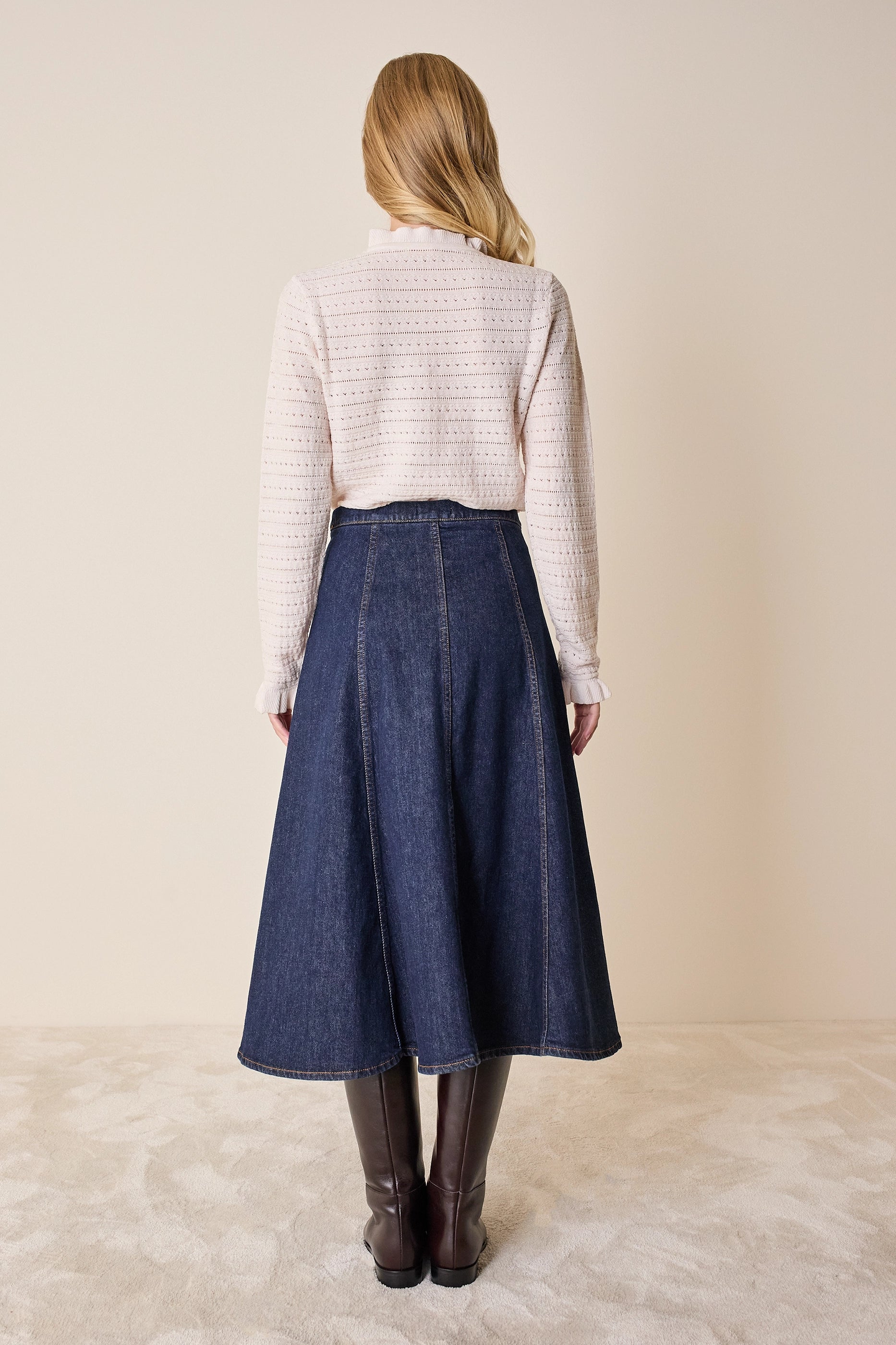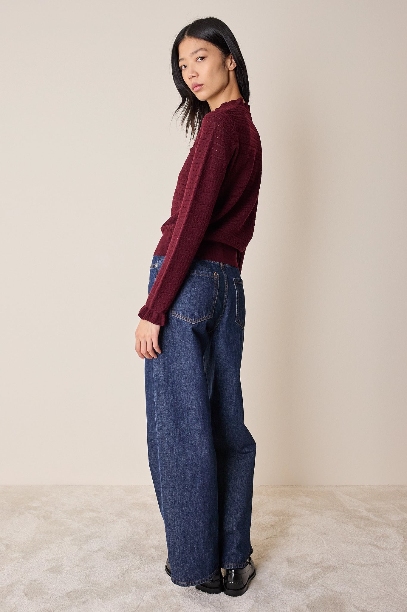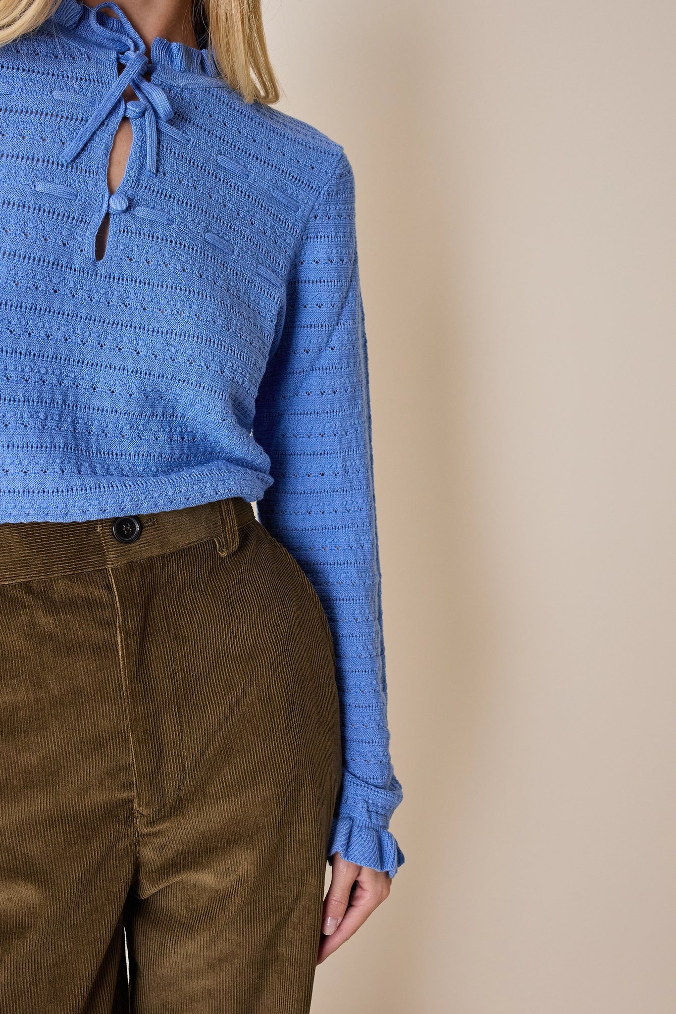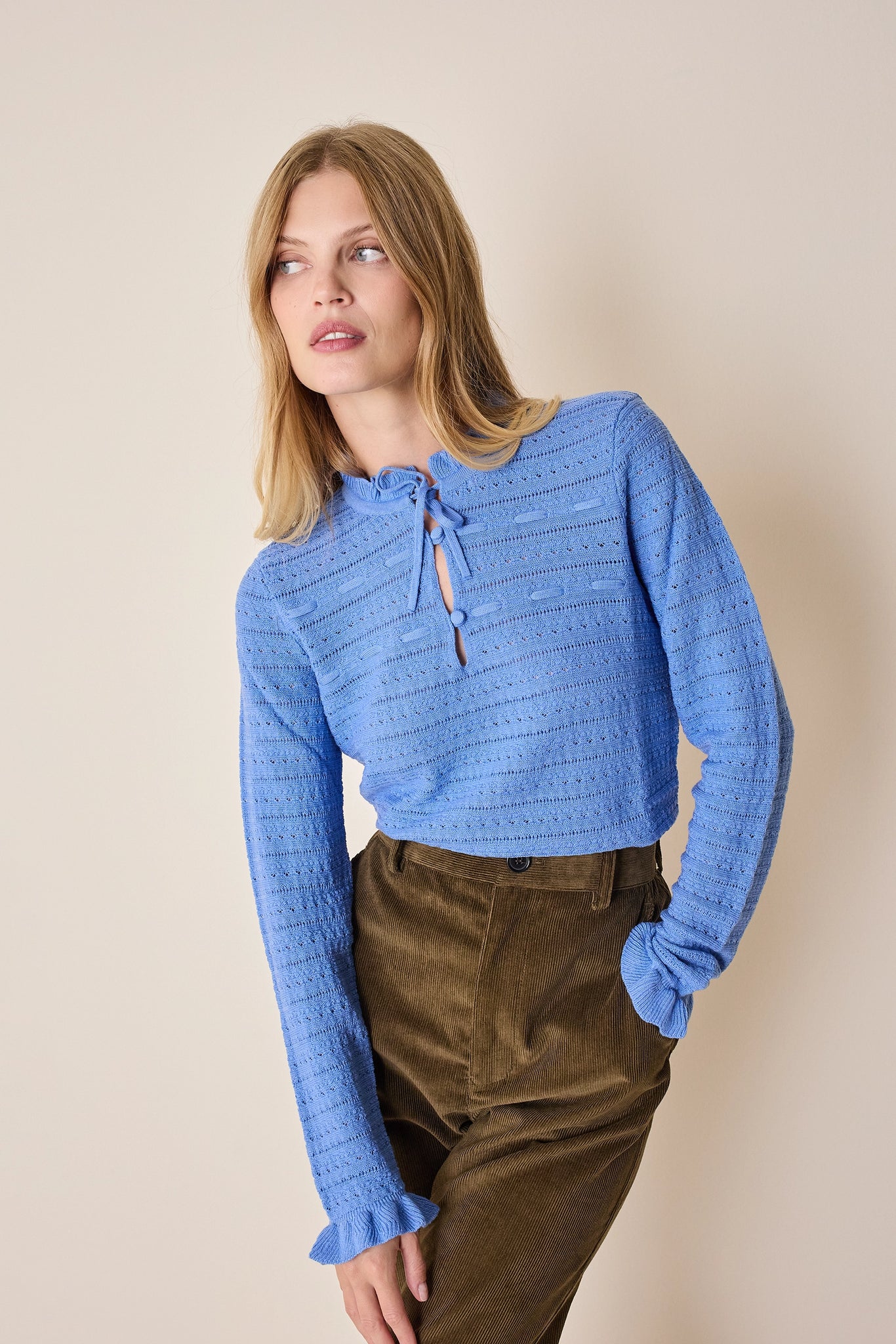 L'ispirazione per questa maglia traforata viene dagli anni '70. Caratterizzata dai piccoli volant delle maniche e del colletto, da un laccetto che può essere annodato a fiocco o lasciato aperto e da un motivo traforato geometrico, è disponibile in azzurro, avorio o oliva.