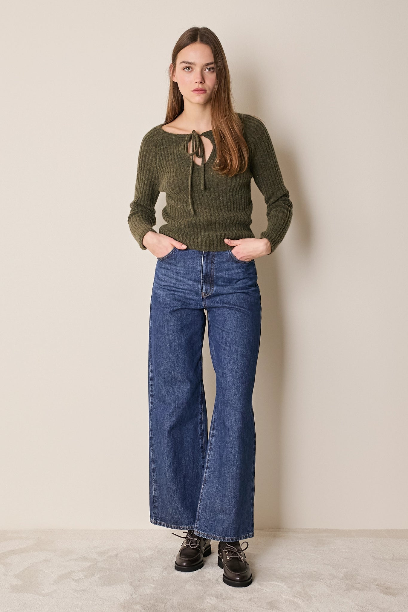 Questo maglioncino a coste in blend di alpaca è definito da una scollatura che si chiude con un laccetto frontale. Romantico e versatile, è perfetto sia con una gonna che con i tuoi jeans preferiti.