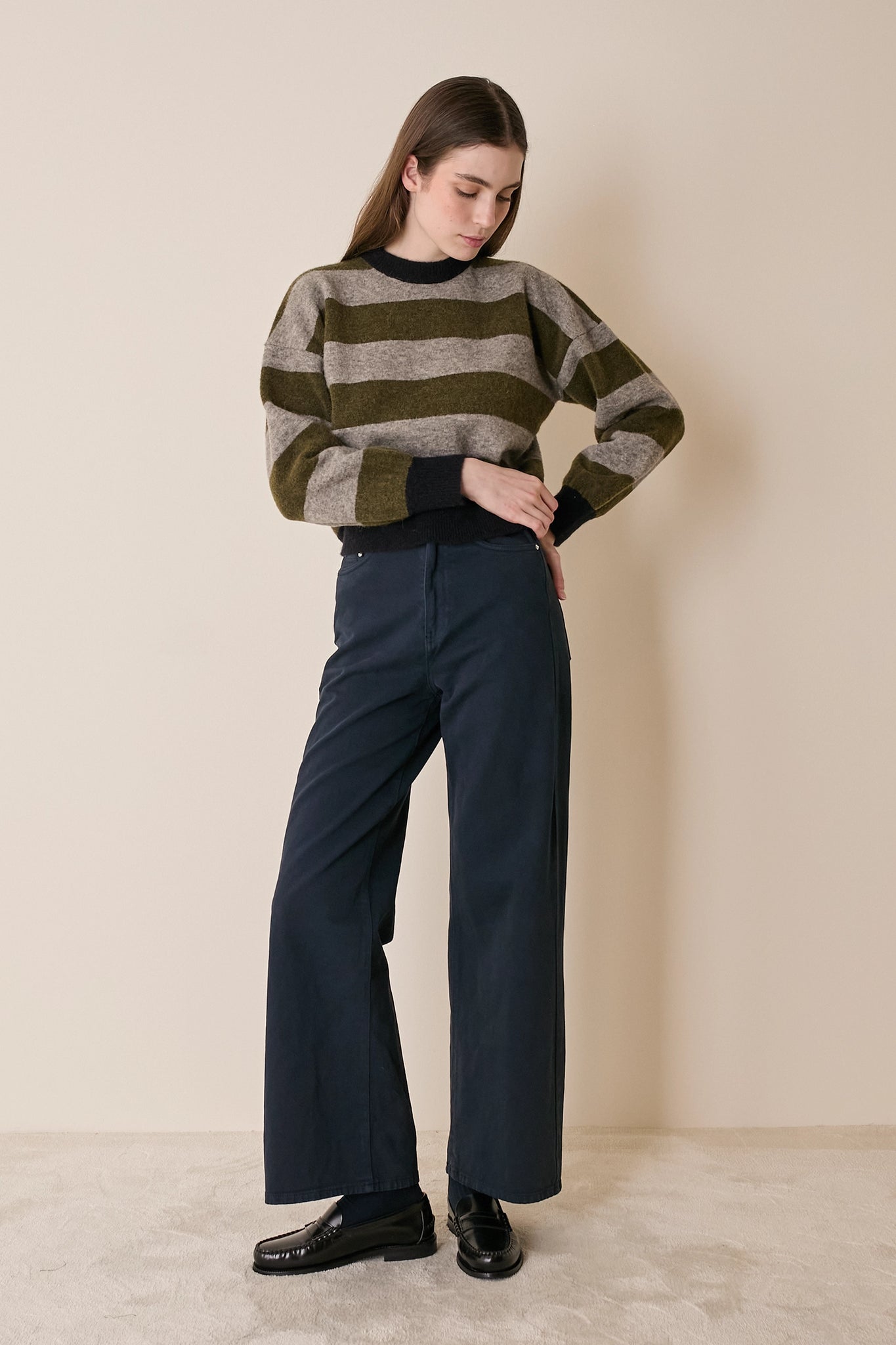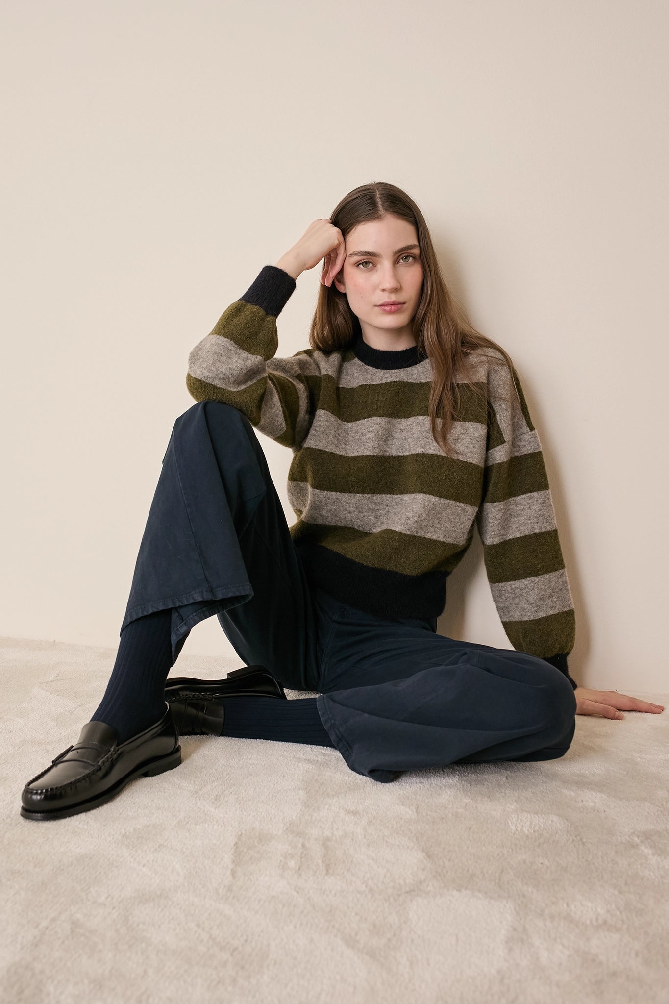 Questa maglia girocollo in blend di alpaca stretch è caratterizzata da un motivo a righe. Collo, polsini e orlo sono rifiniti con una lavorazione a coste per garantire una migliore tenuta della forma nel tempo. Perfetta da abbinare a pantaloni sartoriali o jeans, a seconda dell’occasione, è disponibile in due varianti.