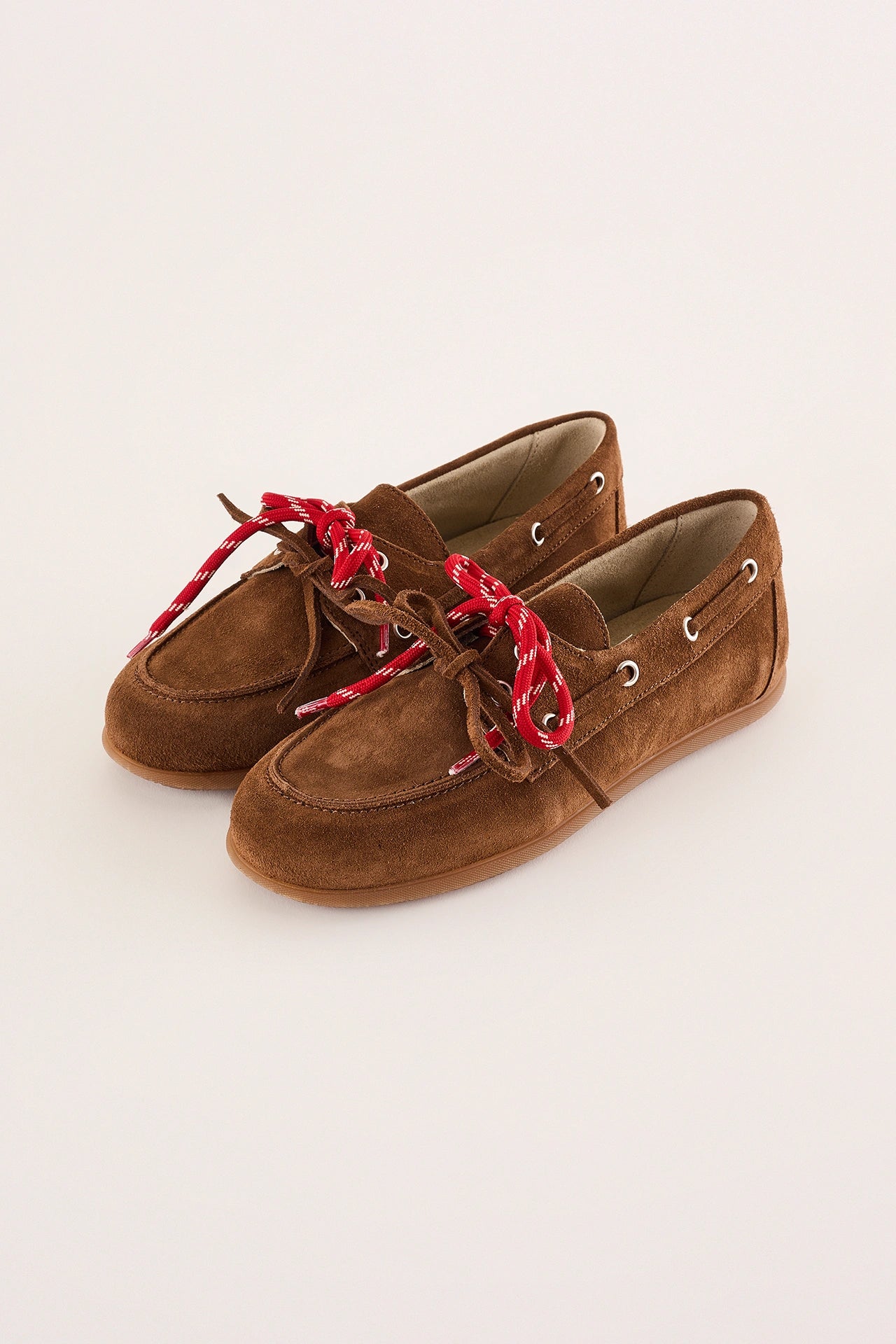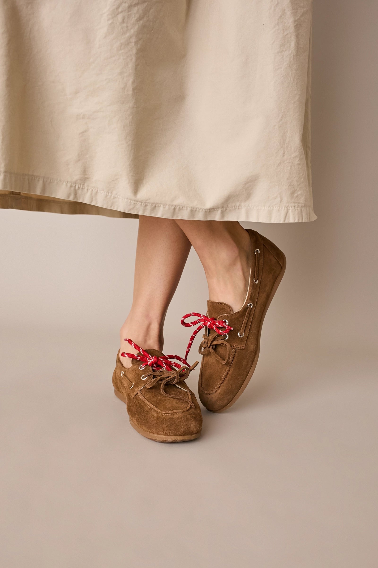 Questi mocassini affusolati sono caratterizzati dal dettaglio dei doppi lacci, che li rende più casual rispetto ai modelli classici. Disponibili in pelle scamosciata color biscotto.