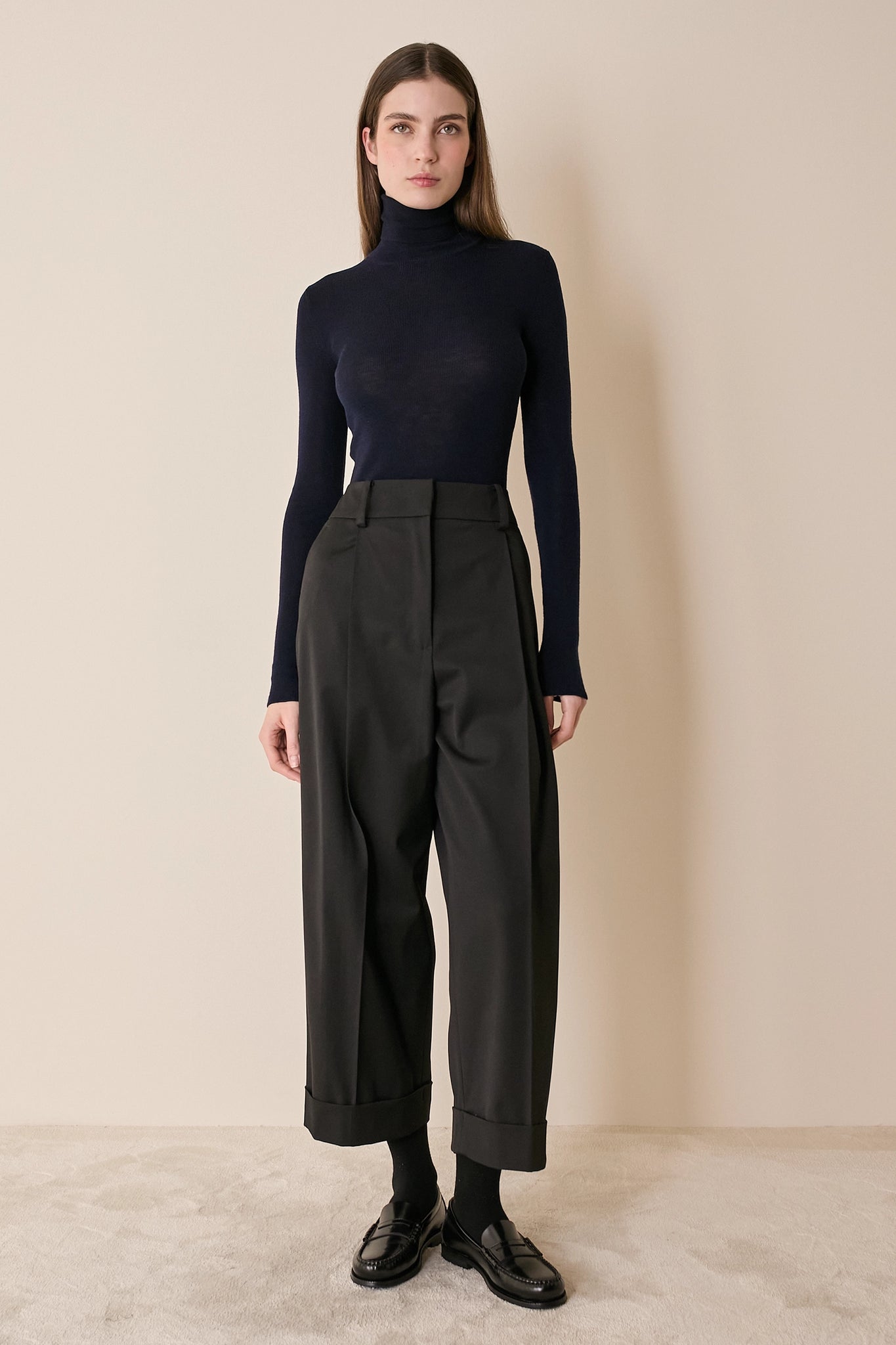 Questi pantaloni a gamba ampia sono perfetti per accompagnarti in ufficio e nelle occasioni più formali. Il taglio dritto a la gamba ampia li rendono adatti sia ai mocassini che agli stivaletti. Realizzati in un pratico blend di lana, sono disponibili in nero.