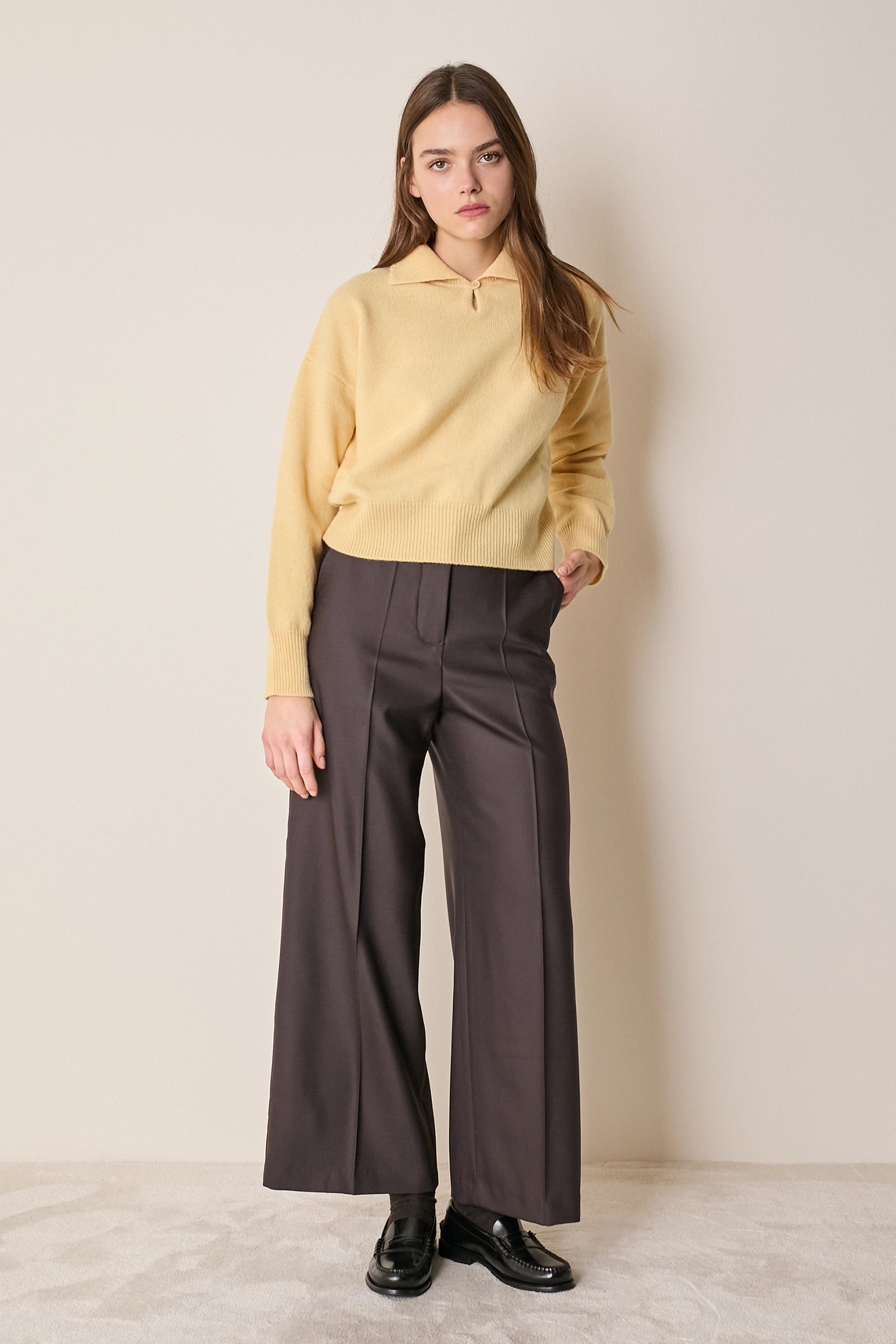 Ci piacciono i contrasti, come quello creato dall'incontro di un dettaglio sportivo (le maniche scese) e dall’eleganza romantica del colletto smerlato di questa polo. Realizzata in un prezioso blend di cashmere e lana merino, è disponibile in cammello.