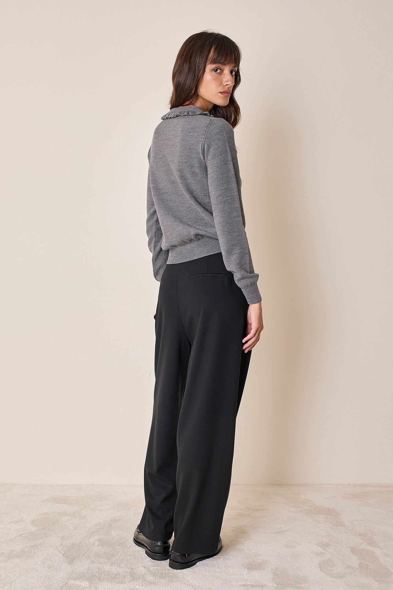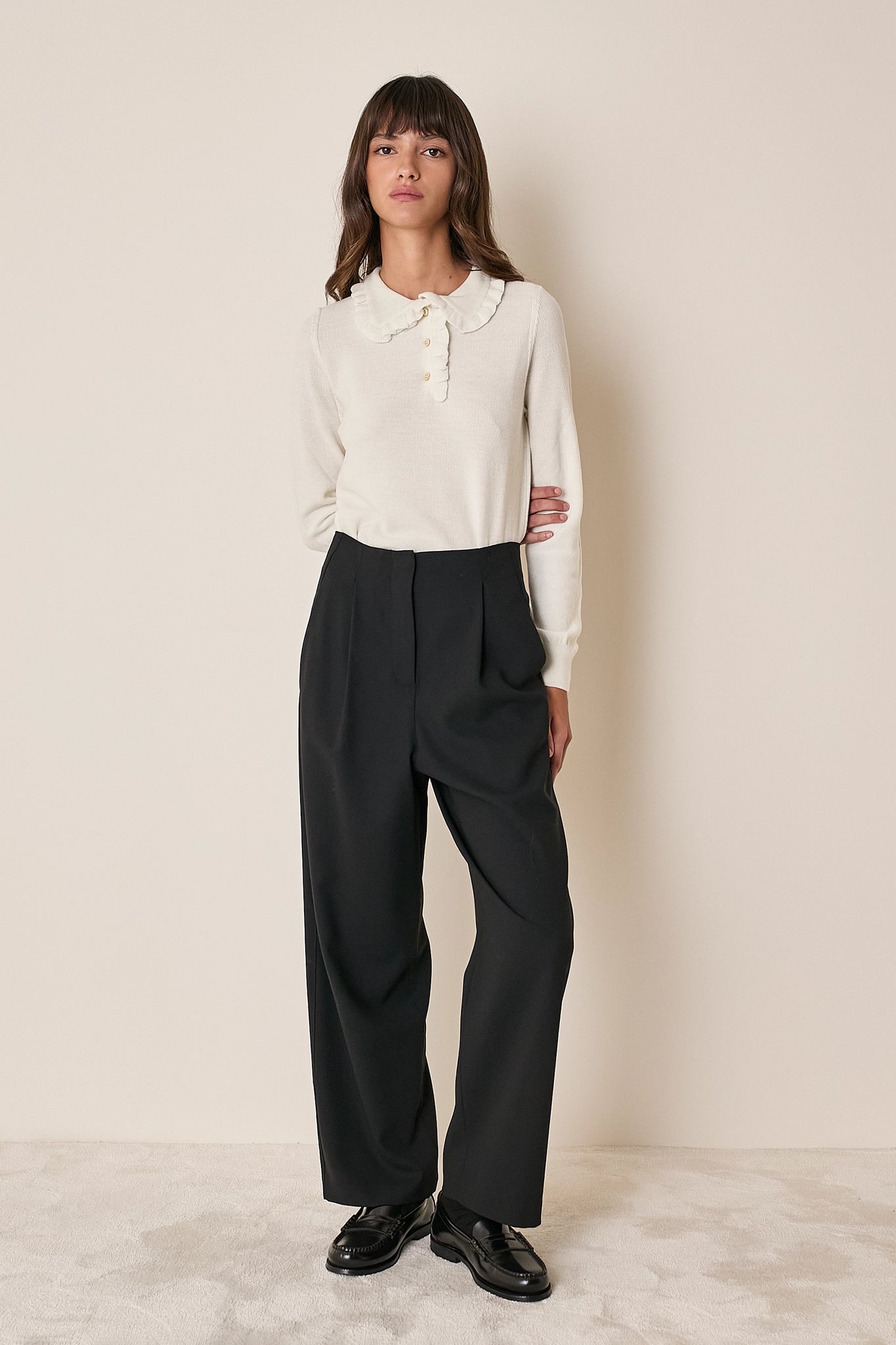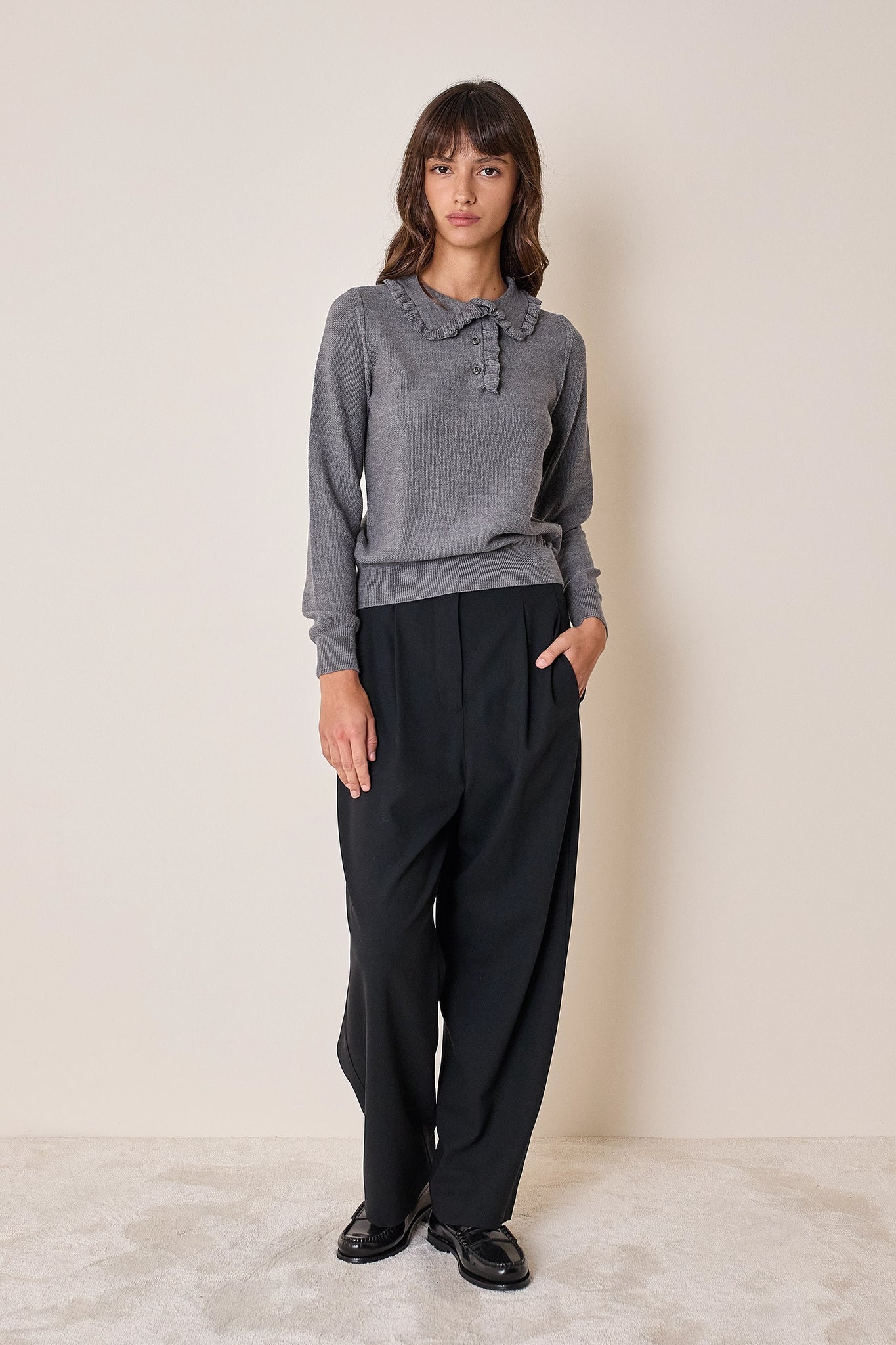 La polo, alla nostra maniera. Per questa polo abbiamo scelto un dettaglio romantico: piccoli volant che arricchiscono colletto e abbottonatura. Realizzata in lana merino extrafine, è disponibile in panna, grigio, nero o blu.